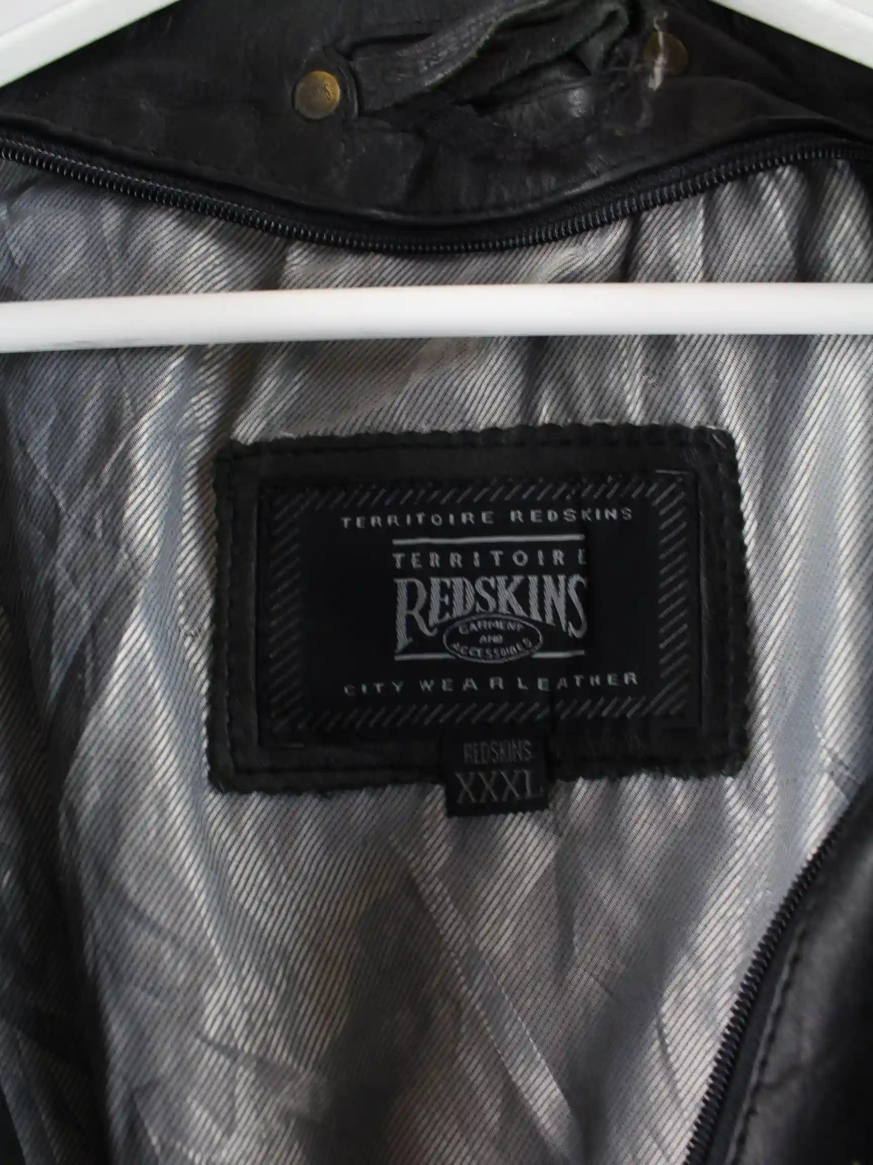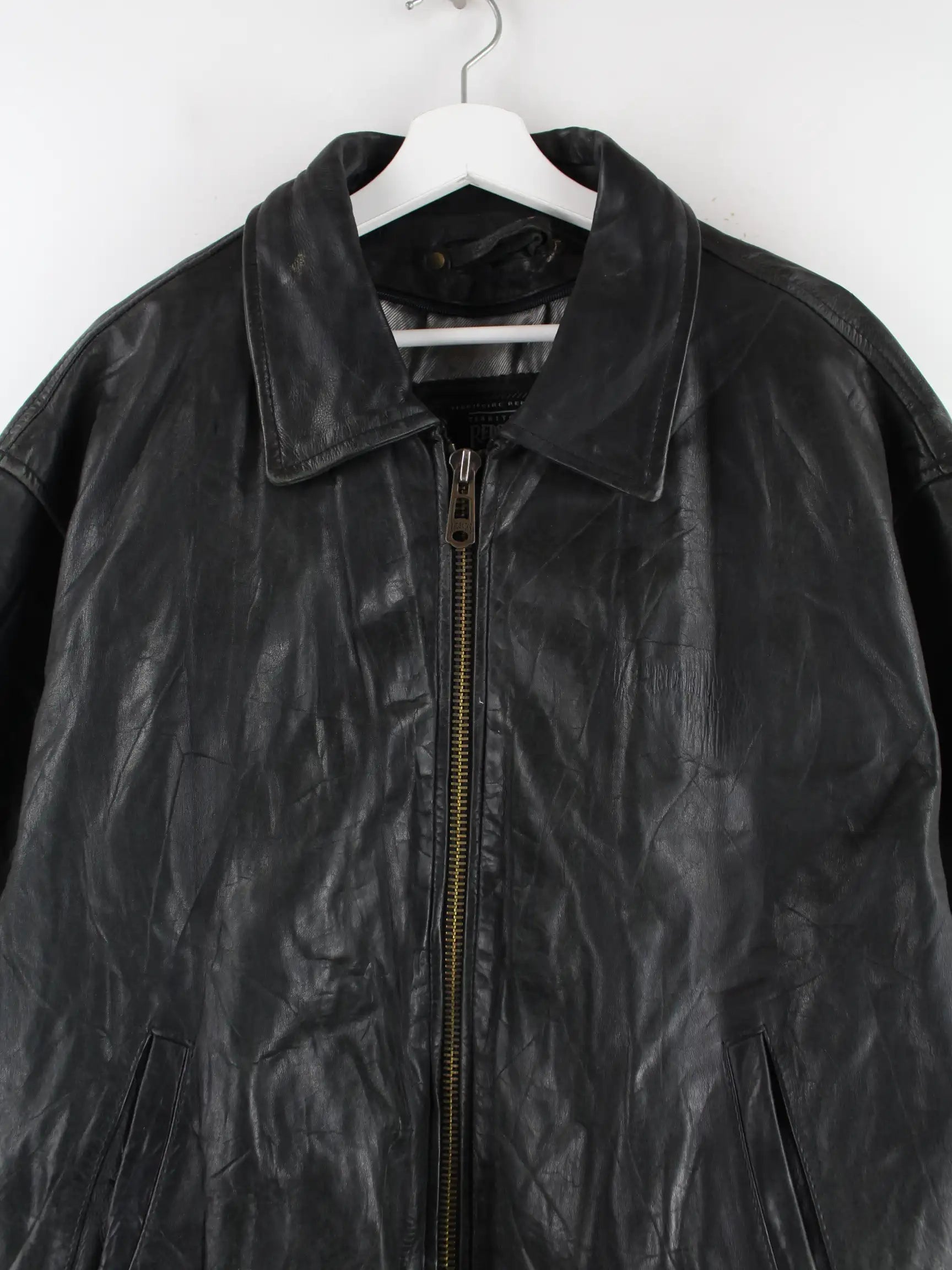 Schwarze Jacke der Brand Redskins aus den 90'ern in Größe 3XL. Sie ist aus Leder und in gutem Zustand vorrätig.