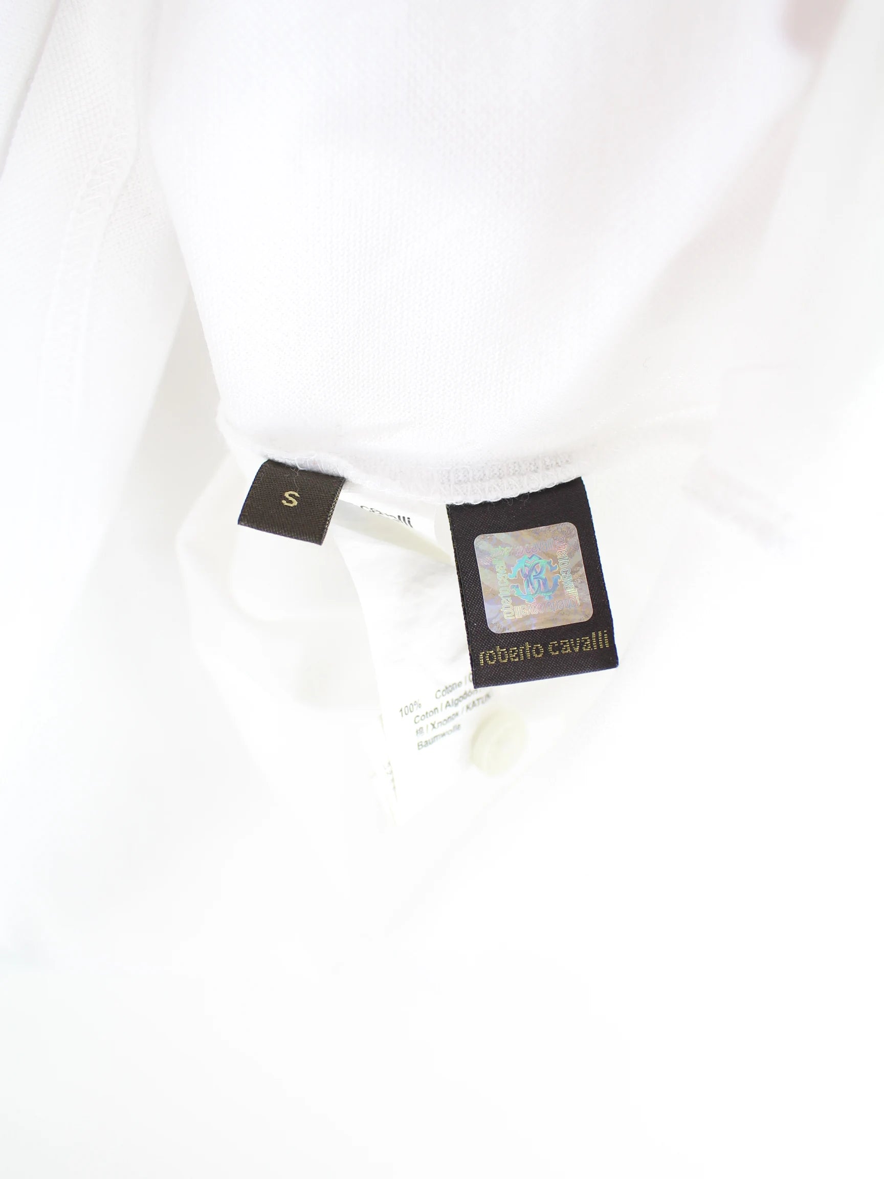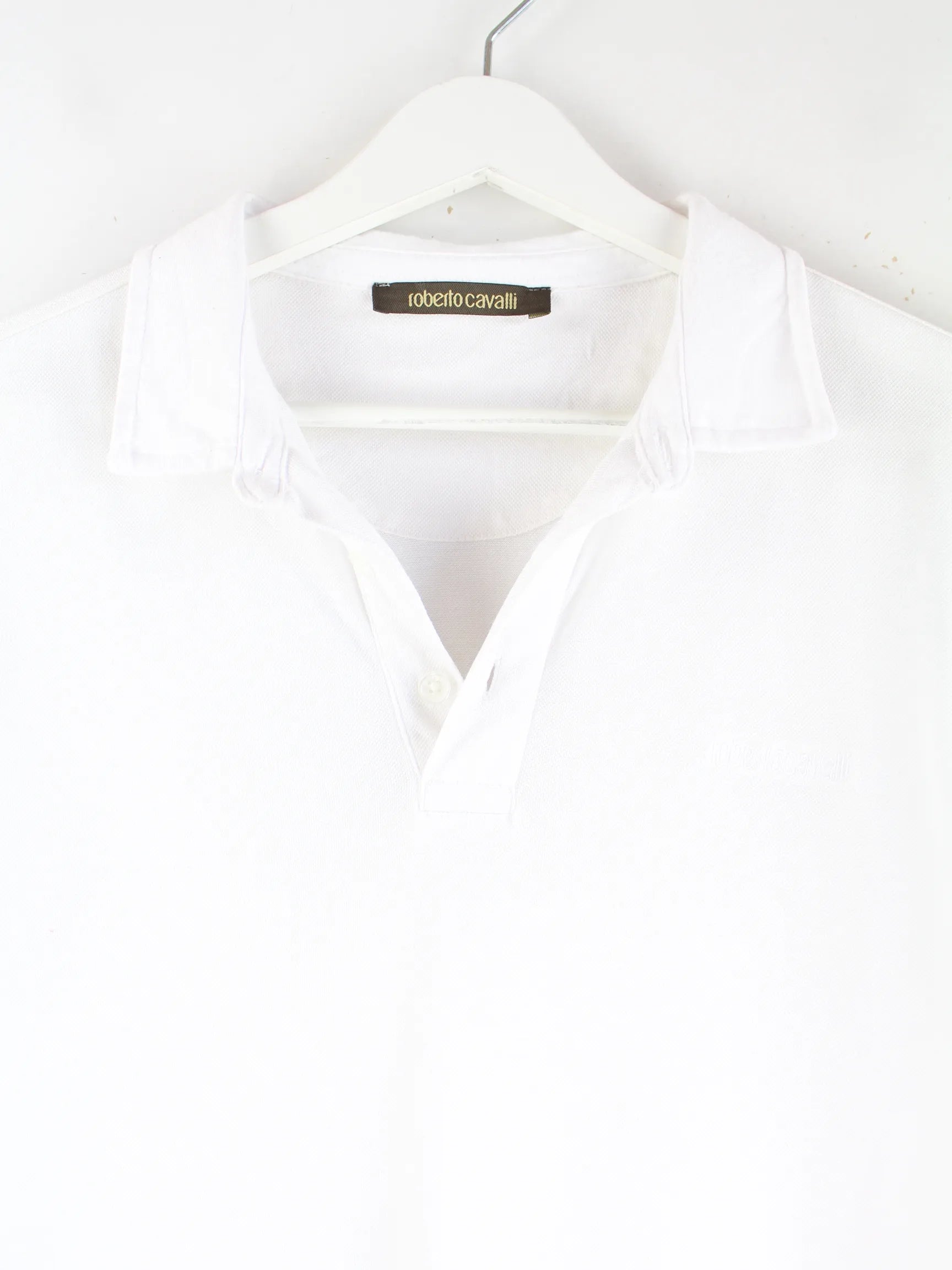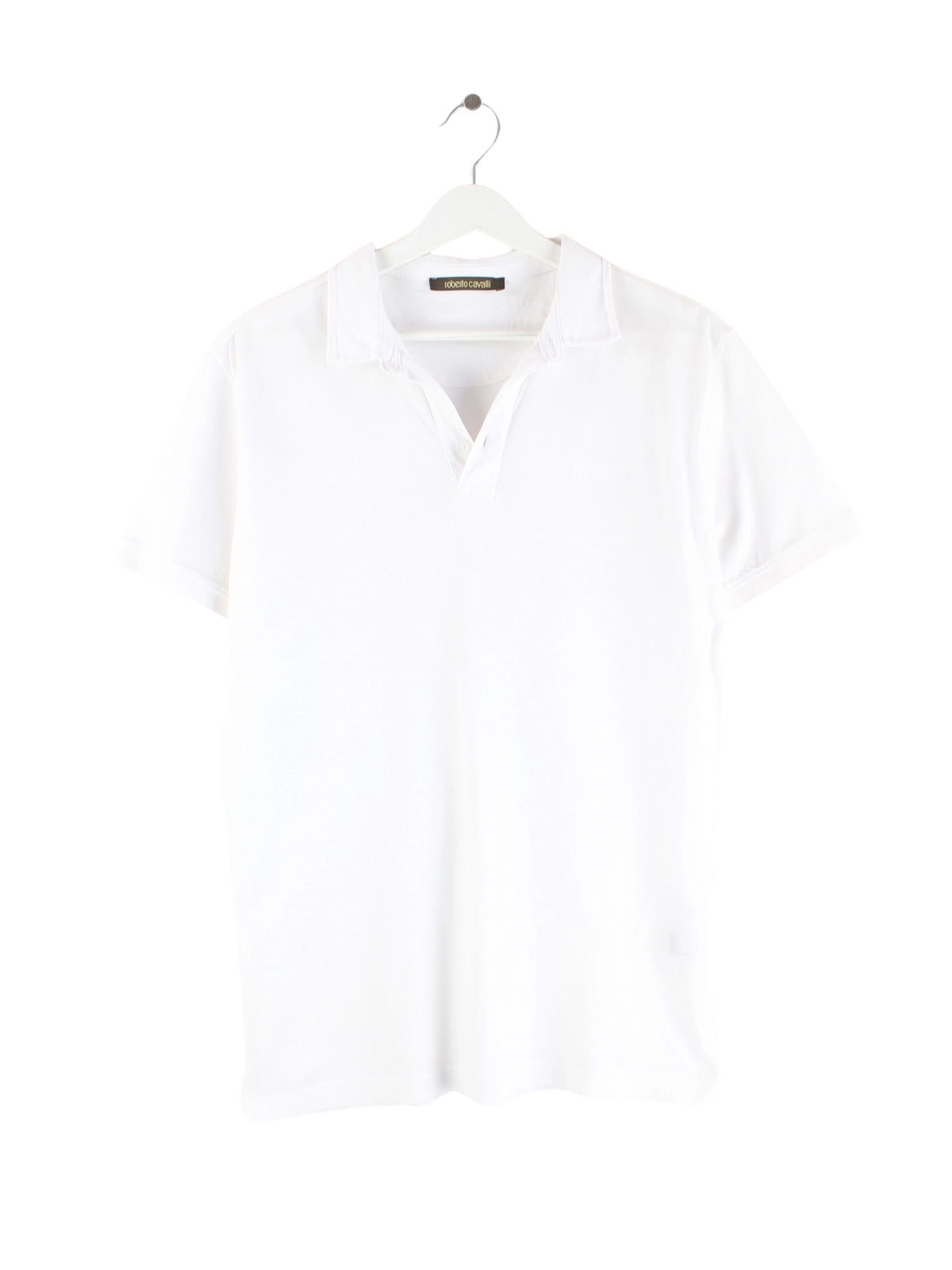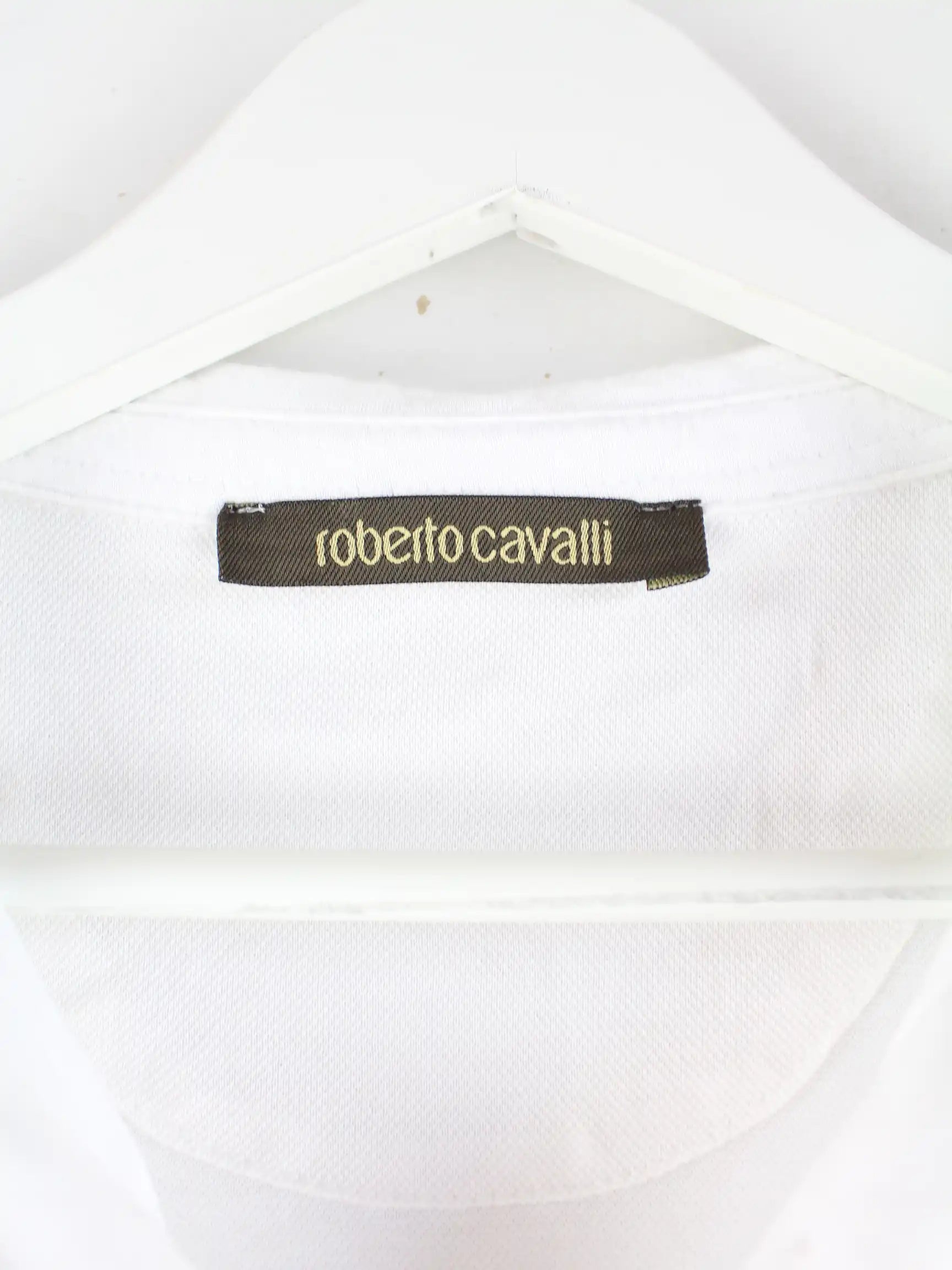 Poloshirt der Marke Roberto Cavalli in Größe S. Es ist aus Baumwolle angefertigt und in Weiß bei uns zu bekommen.