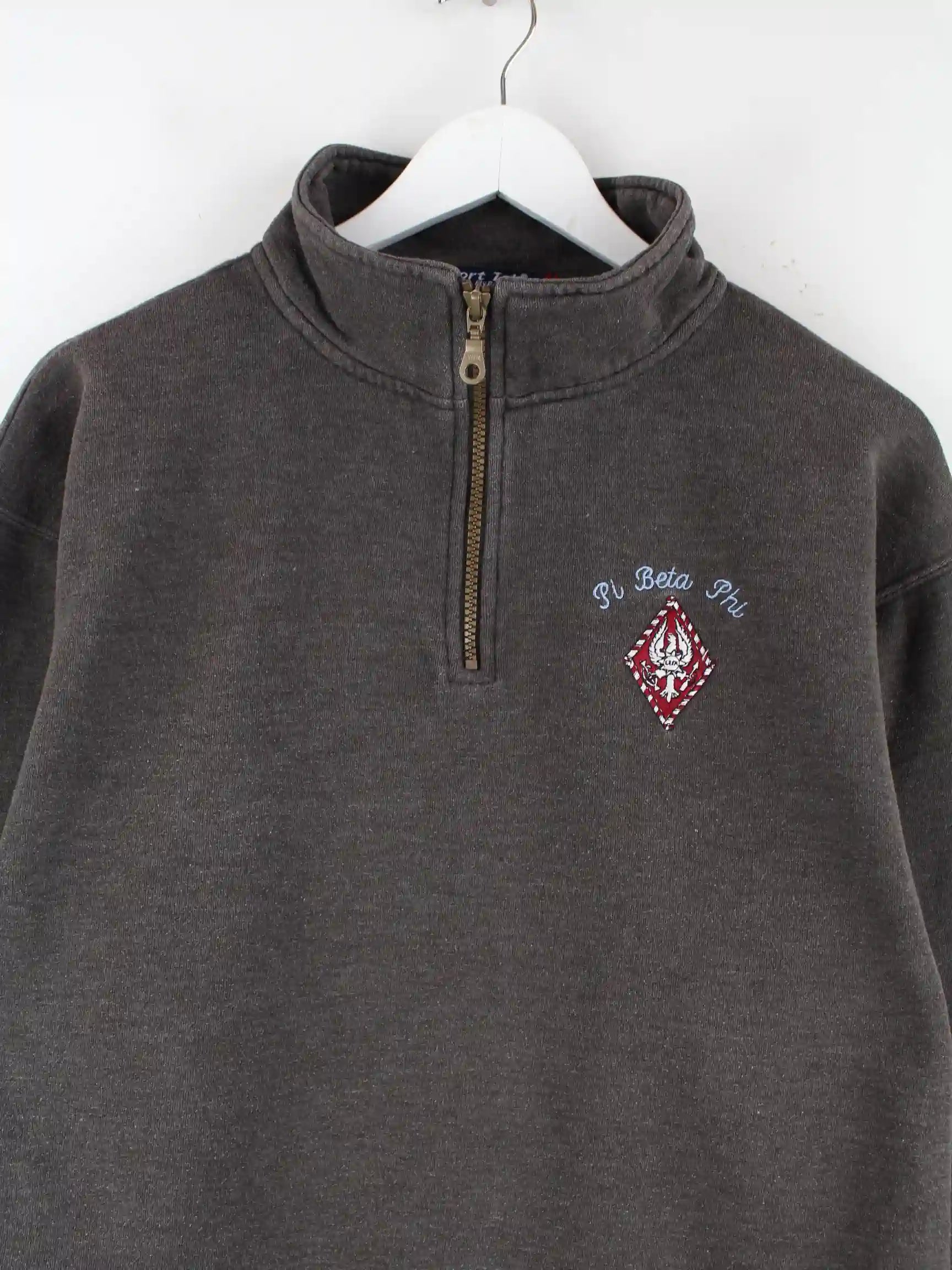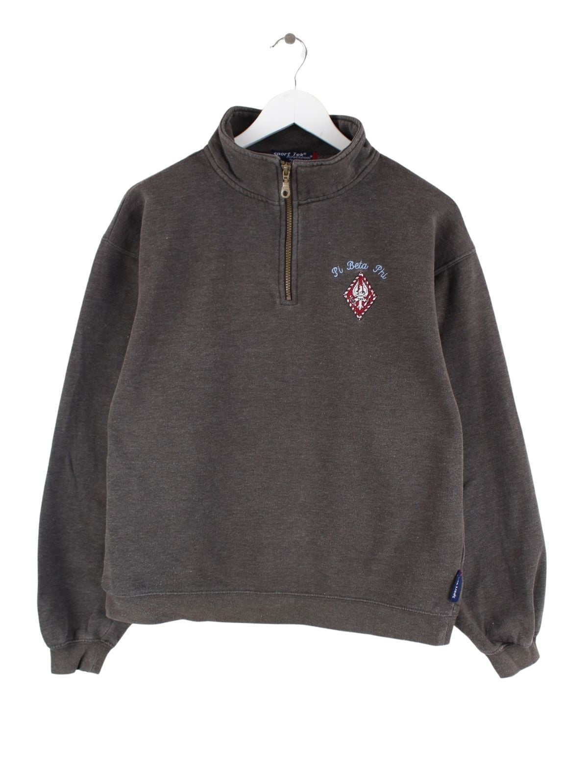 Brauner Sweater mit gesticktem Logo und kurzem Reißverschluß der Marke Sport Tek in Größe S. Er ist aus einer Baumwollmischung produziert und in sehr gutem Zustand in Stock.