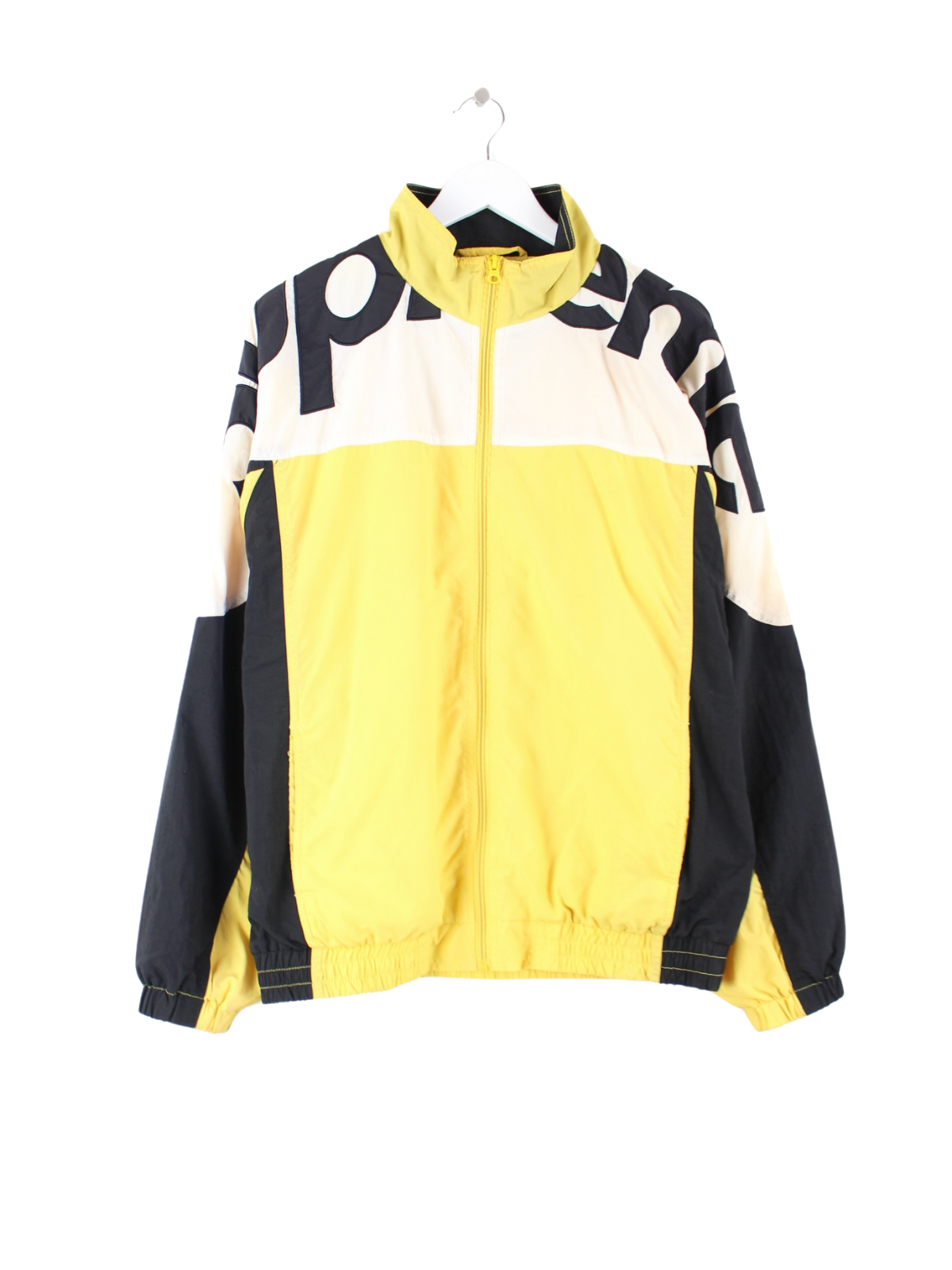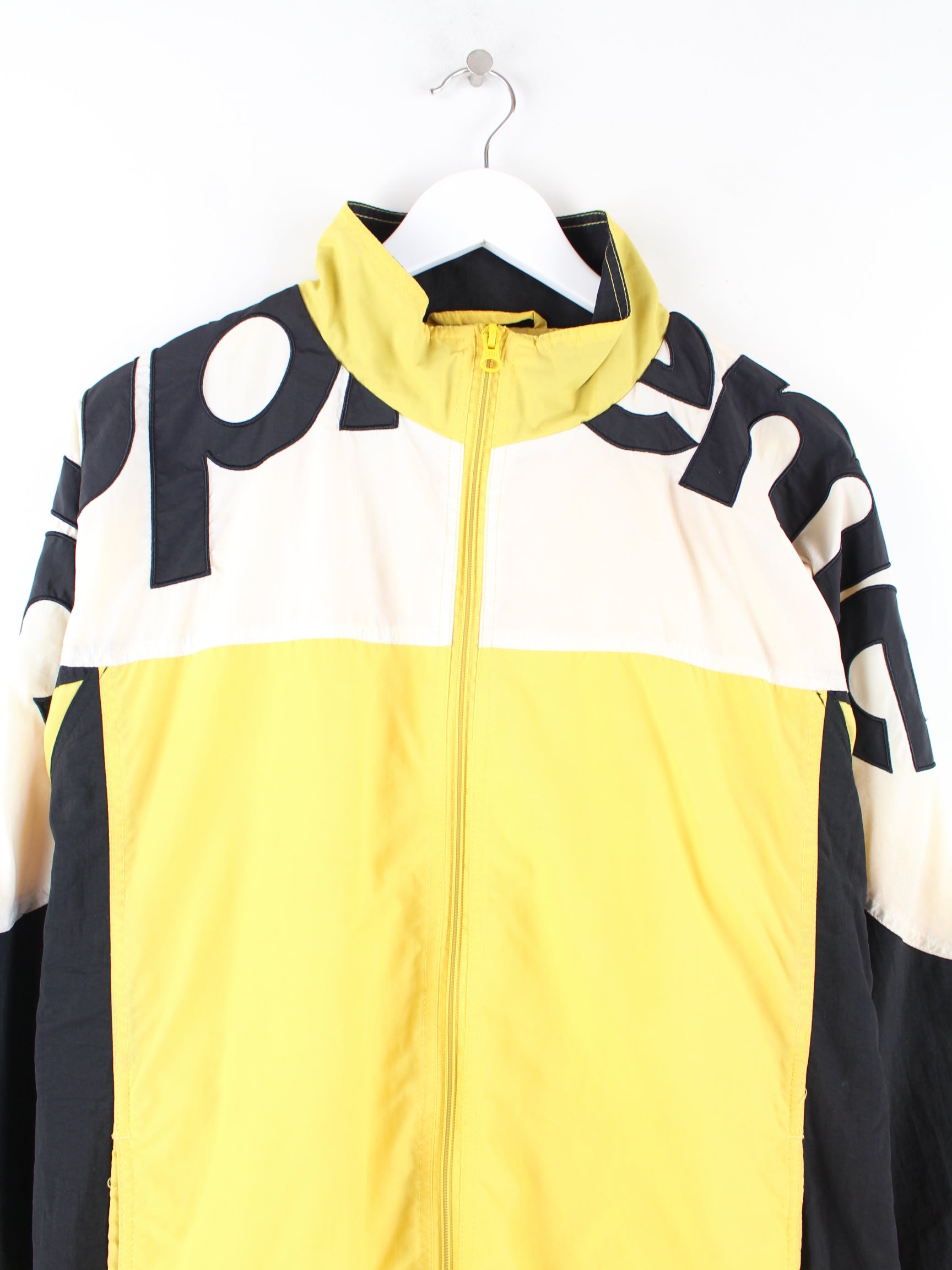 Gelbe Leichte Jacke mit gestickten Motiven und Reißverschluß vom Brand Supreme in Größe L. Sie ist aus Synthetik gefertigt und in gutem Zustand auf Lager.