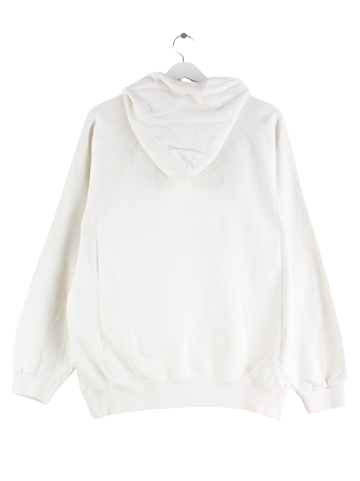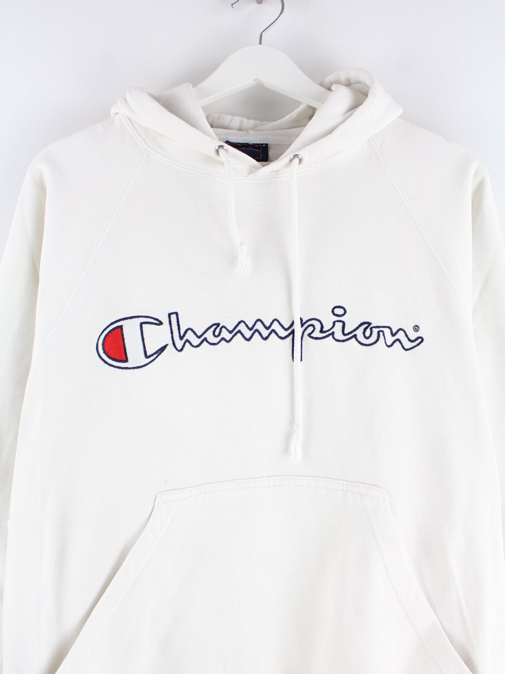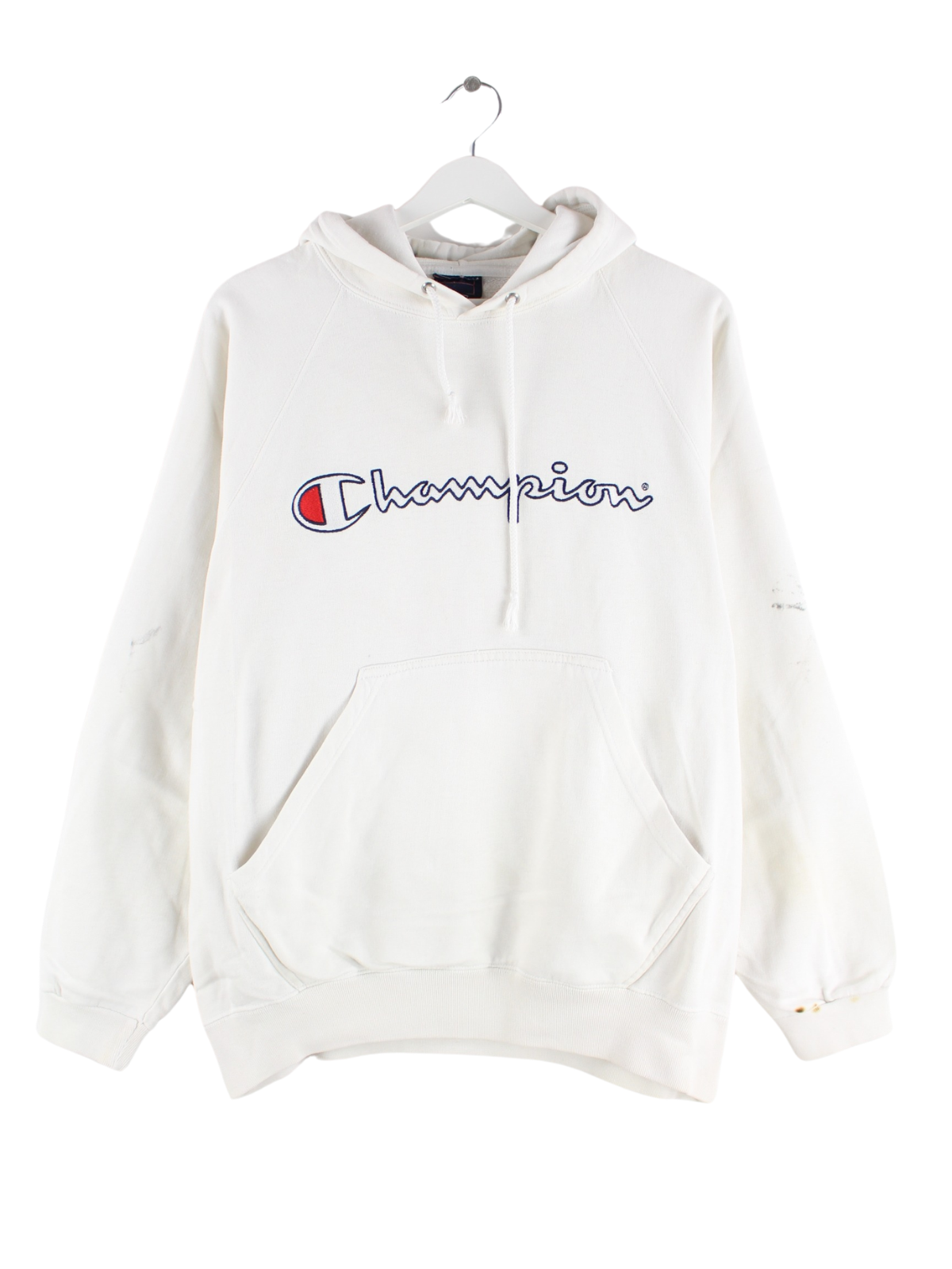 Hoodie der Marke Champion mit Stick in Größe M. Er ist aus einer Baumwollmischung produziert und in Weiß in Stock.