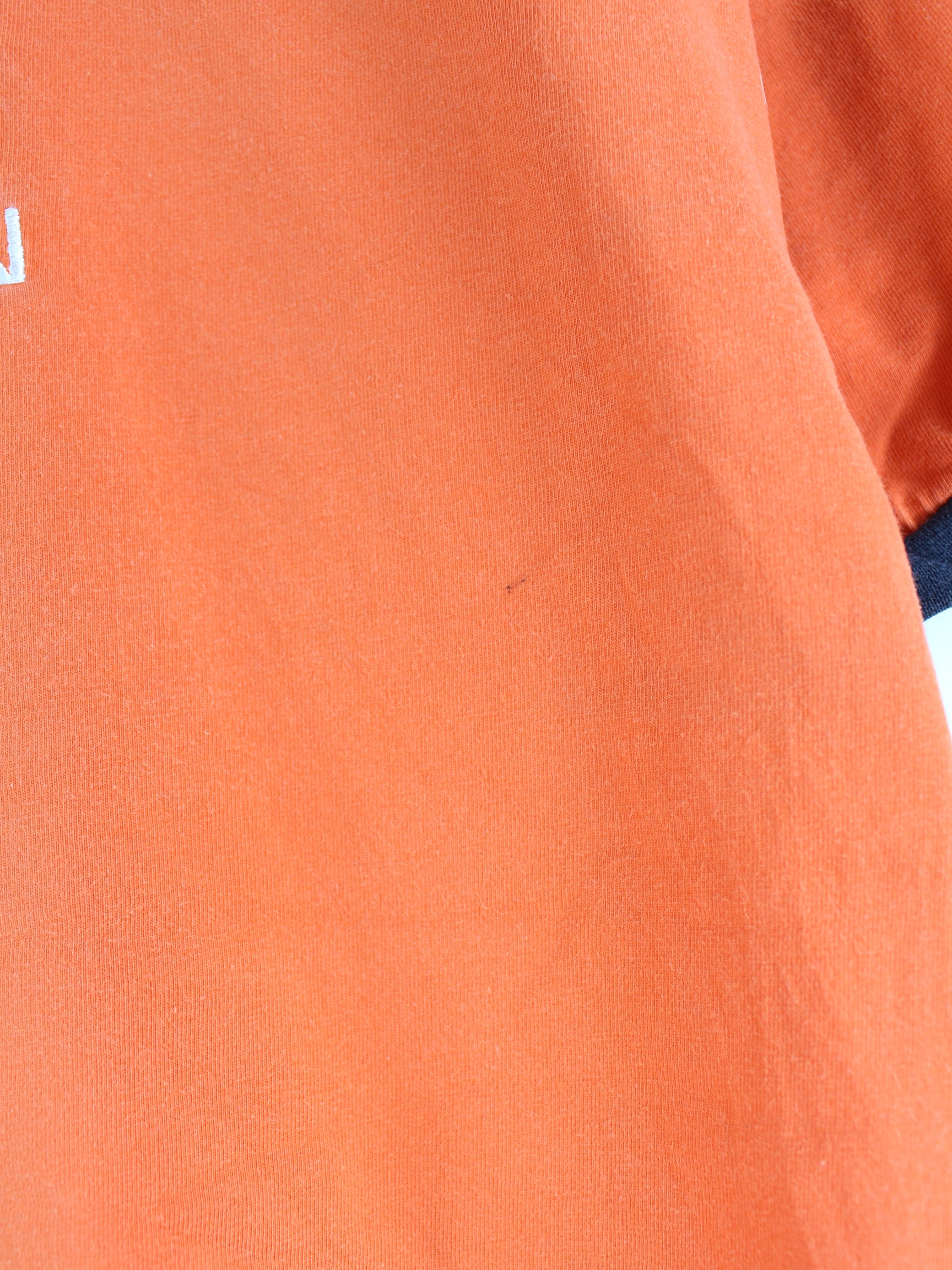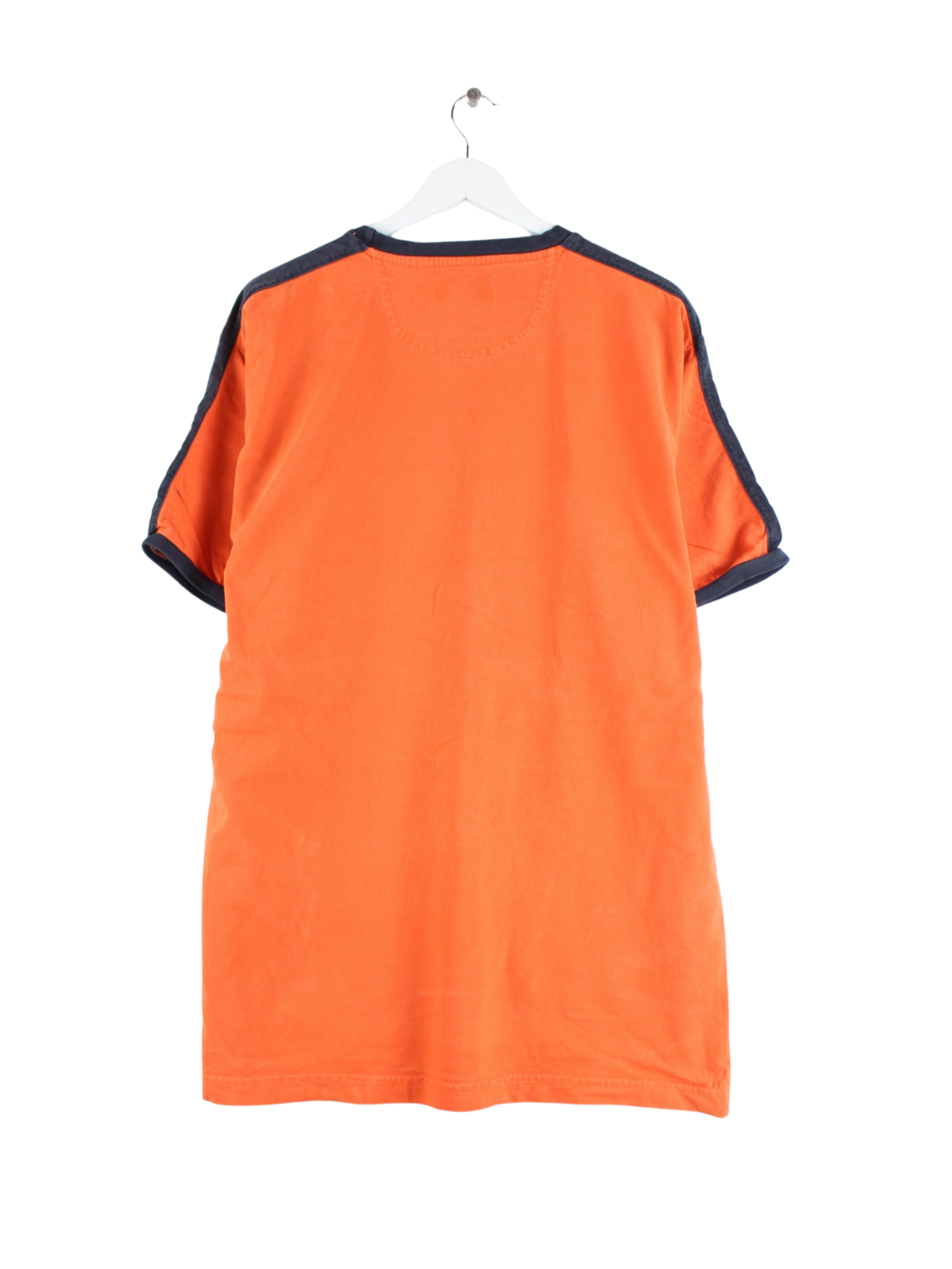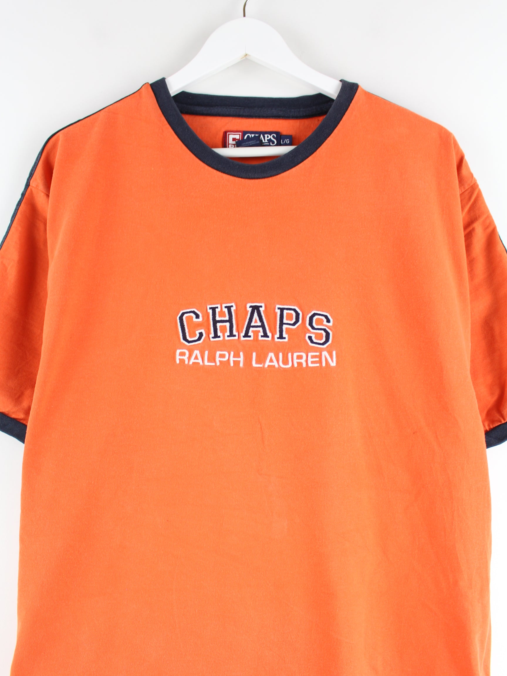 Orangefarbenes T-Shirt mit Stick der Brand Chaps by Ralph Lauren in Größe L. Es ist aus einer Baumwollmischung und in gutem Zustand im Bestand.