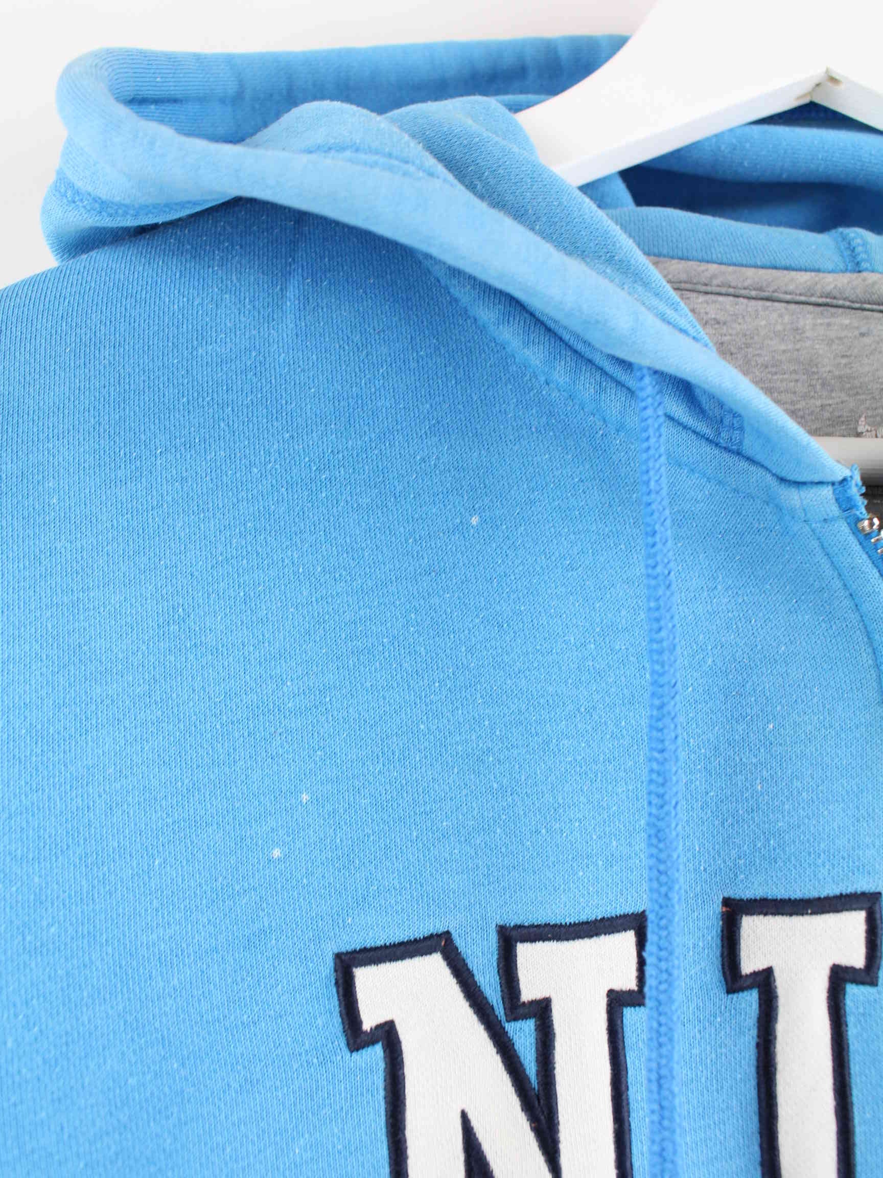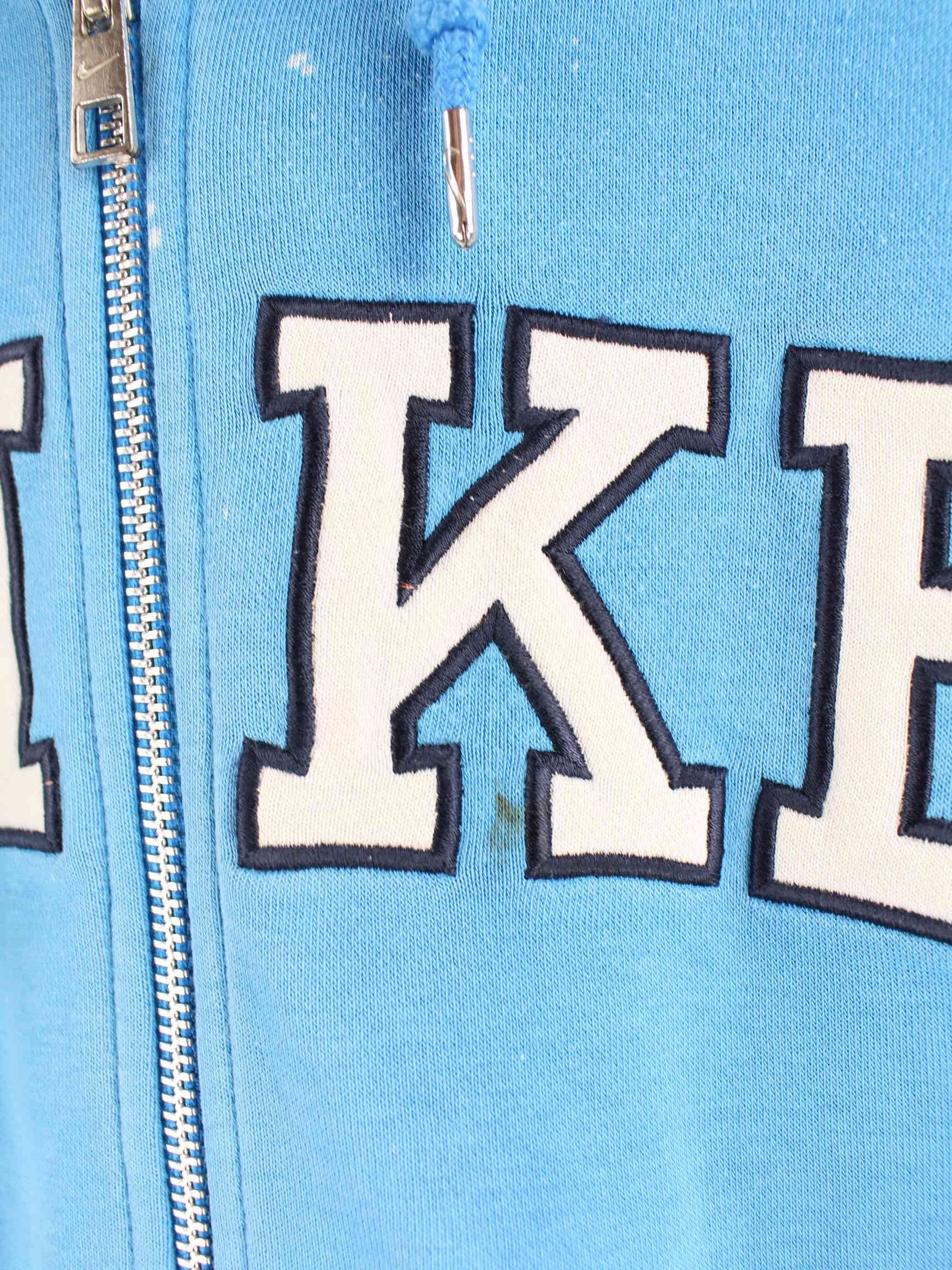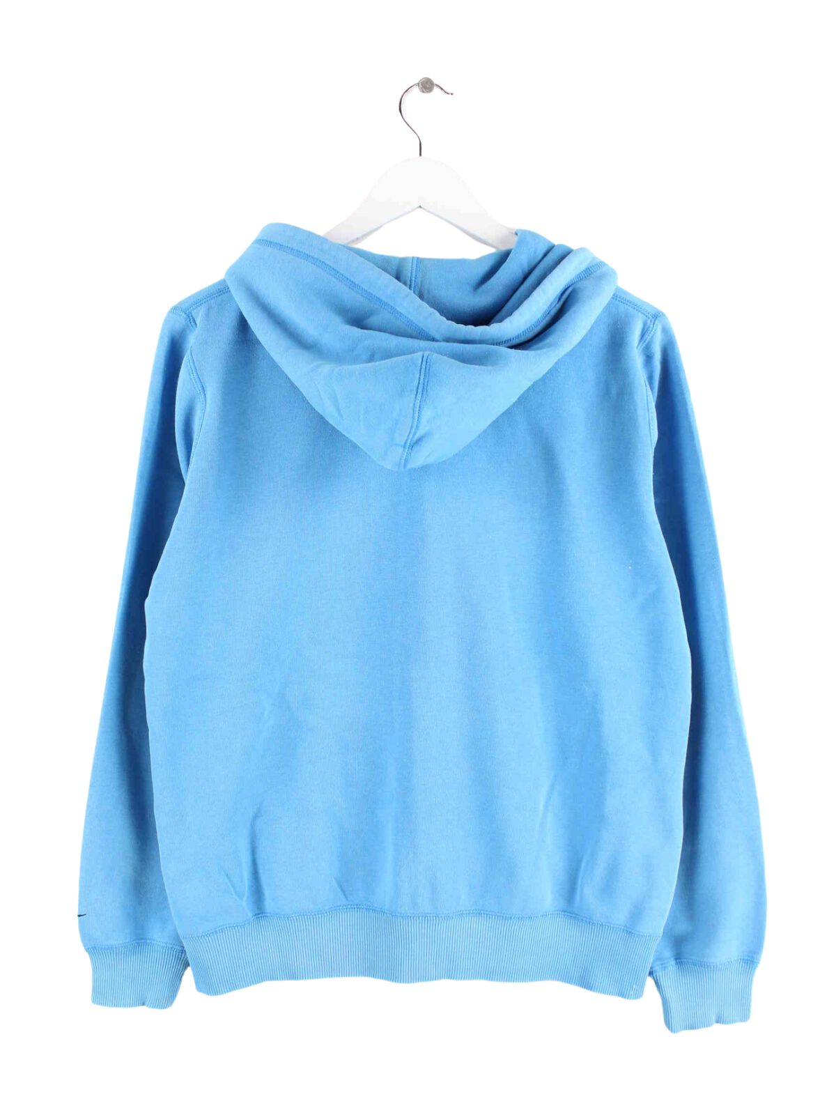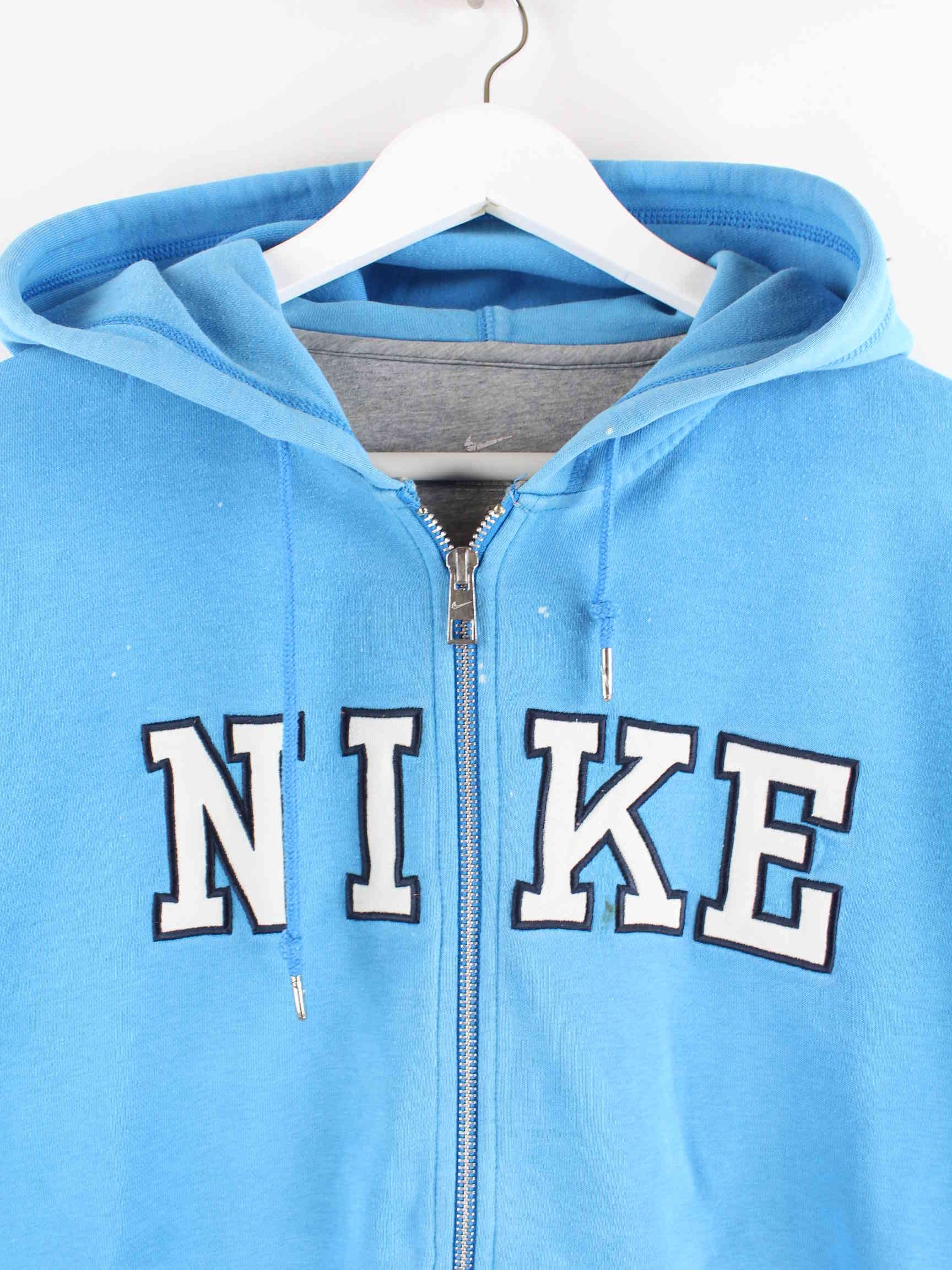Hoodie der Marke Nike mit gestickten Mustern und Reißverschluß in Größe XS. Er ist aus einer Baumwollmischung produziert und in Blau in Stock.