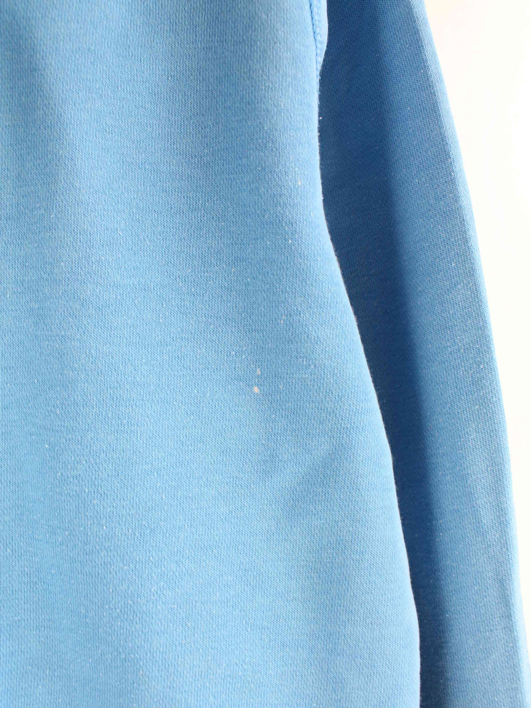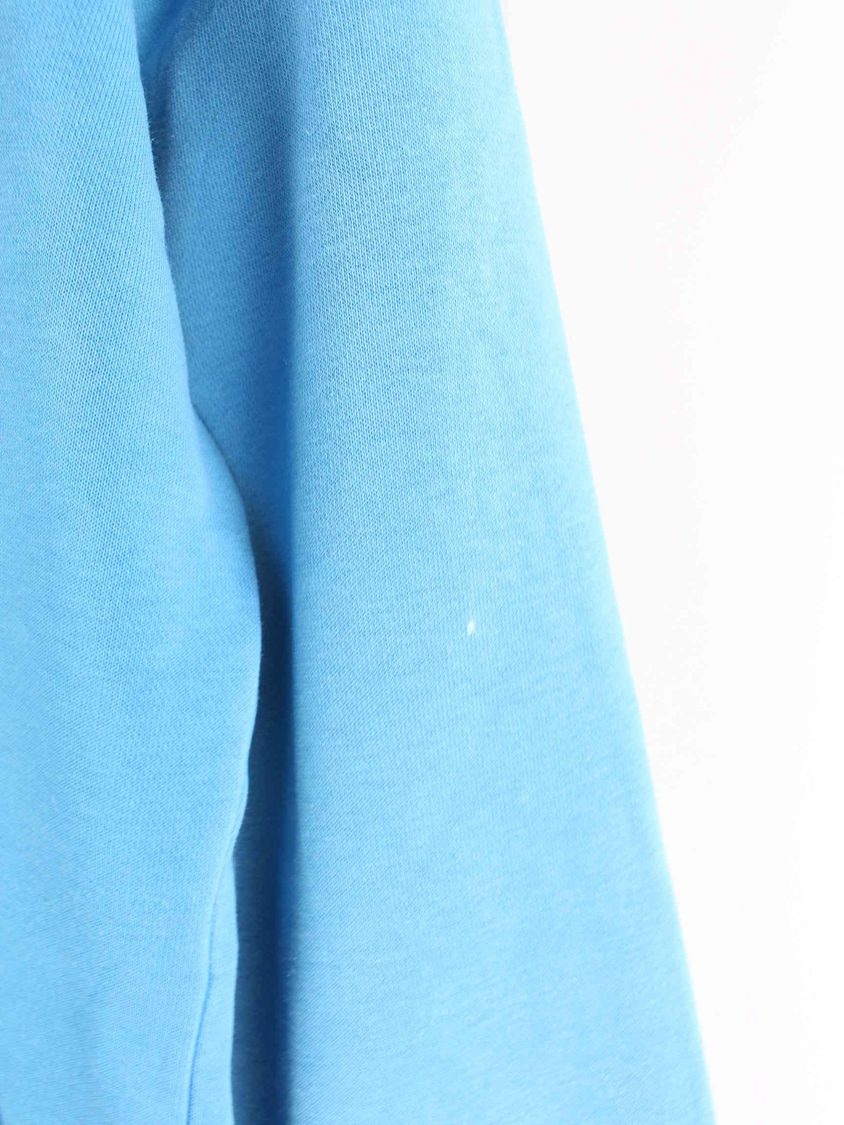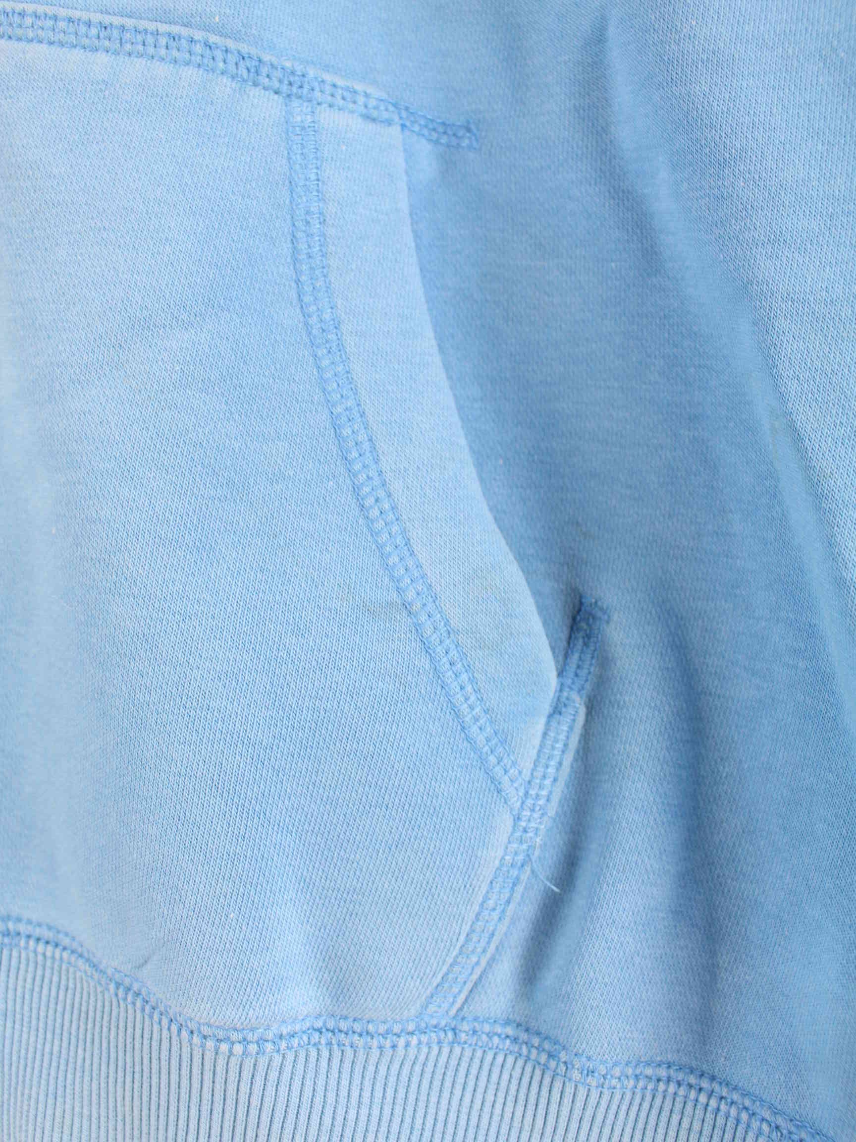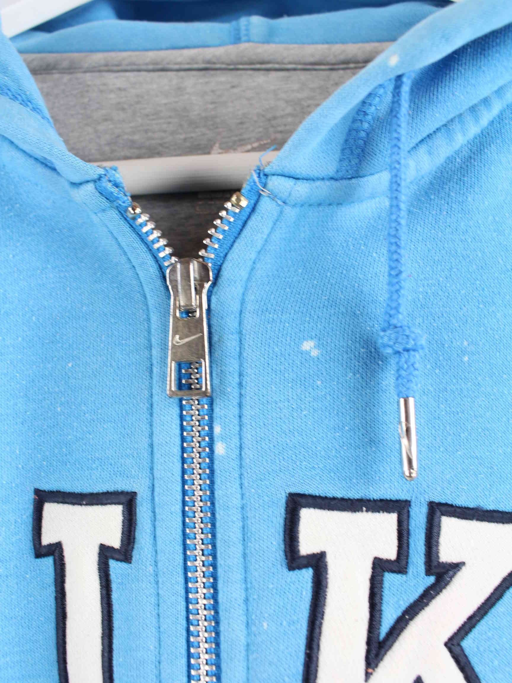 Hoodie der Marke Nike mit gestickten Mustern und Reißverschluß in Größe XS. Er ist aus einer Baumwollmischung produziert und in Blau in Stock.