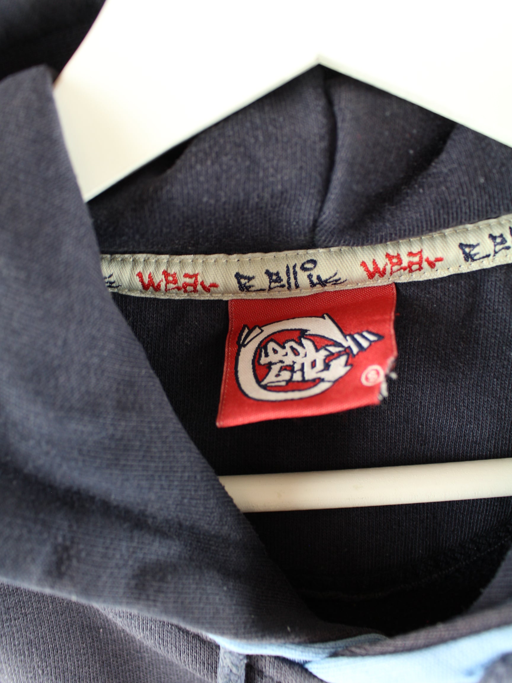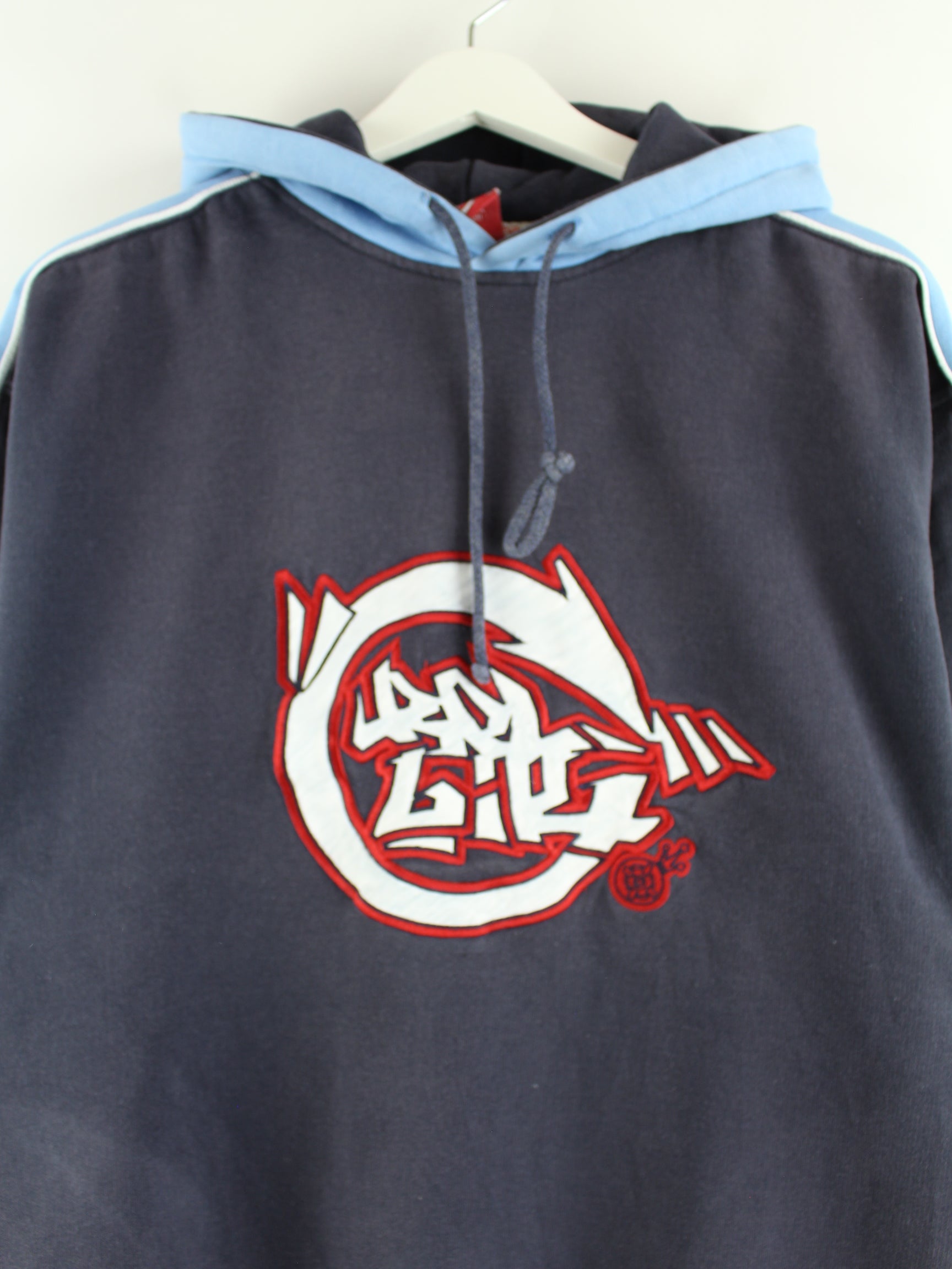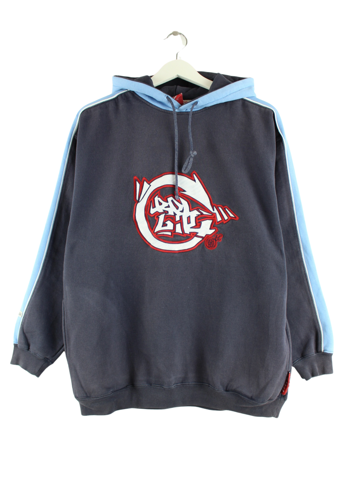 Hoodie aus dem Hause Rellik Wear mit Stickereien in Größe S aus Anfang der 2000'er. Er ist aus einer Baumwollmischung produziert und in Blau lieferbar.