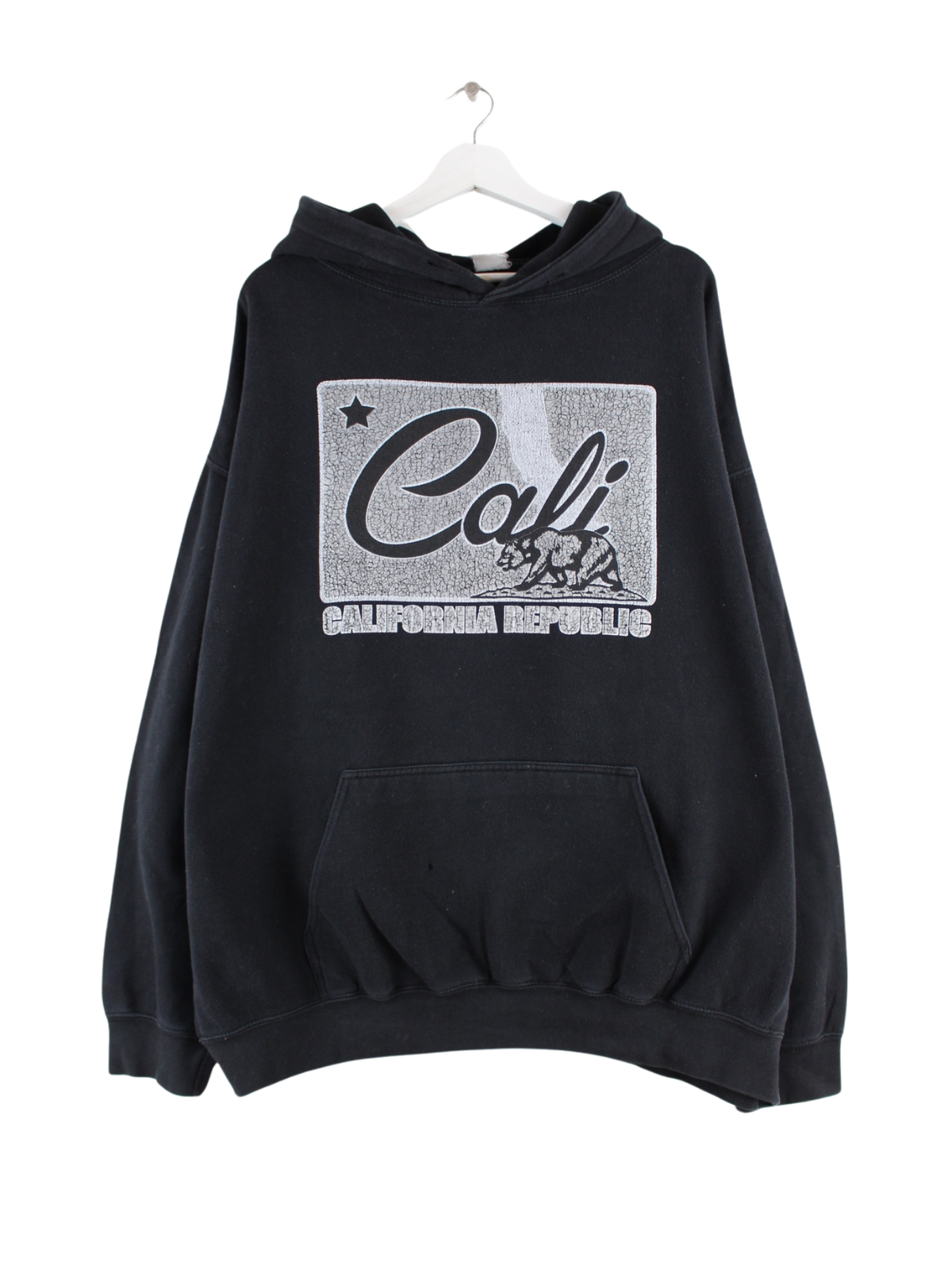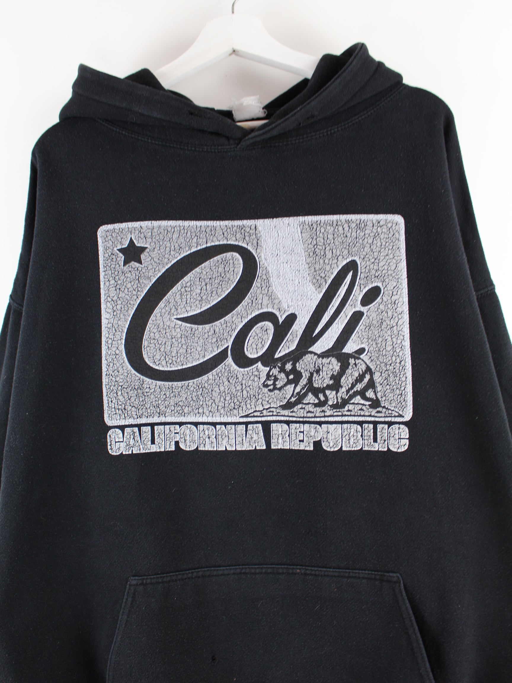 Schwarzer Hoodie der Brand Superdry aus Anfang der 2000'er in Größe 3XL. Er ist aus einer Baumwollmischung und in gutem Zustand in Stock. Mit chiquem Cali Print.