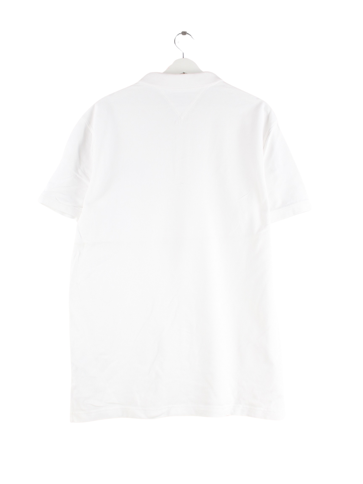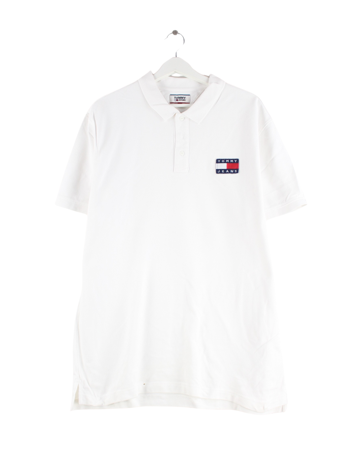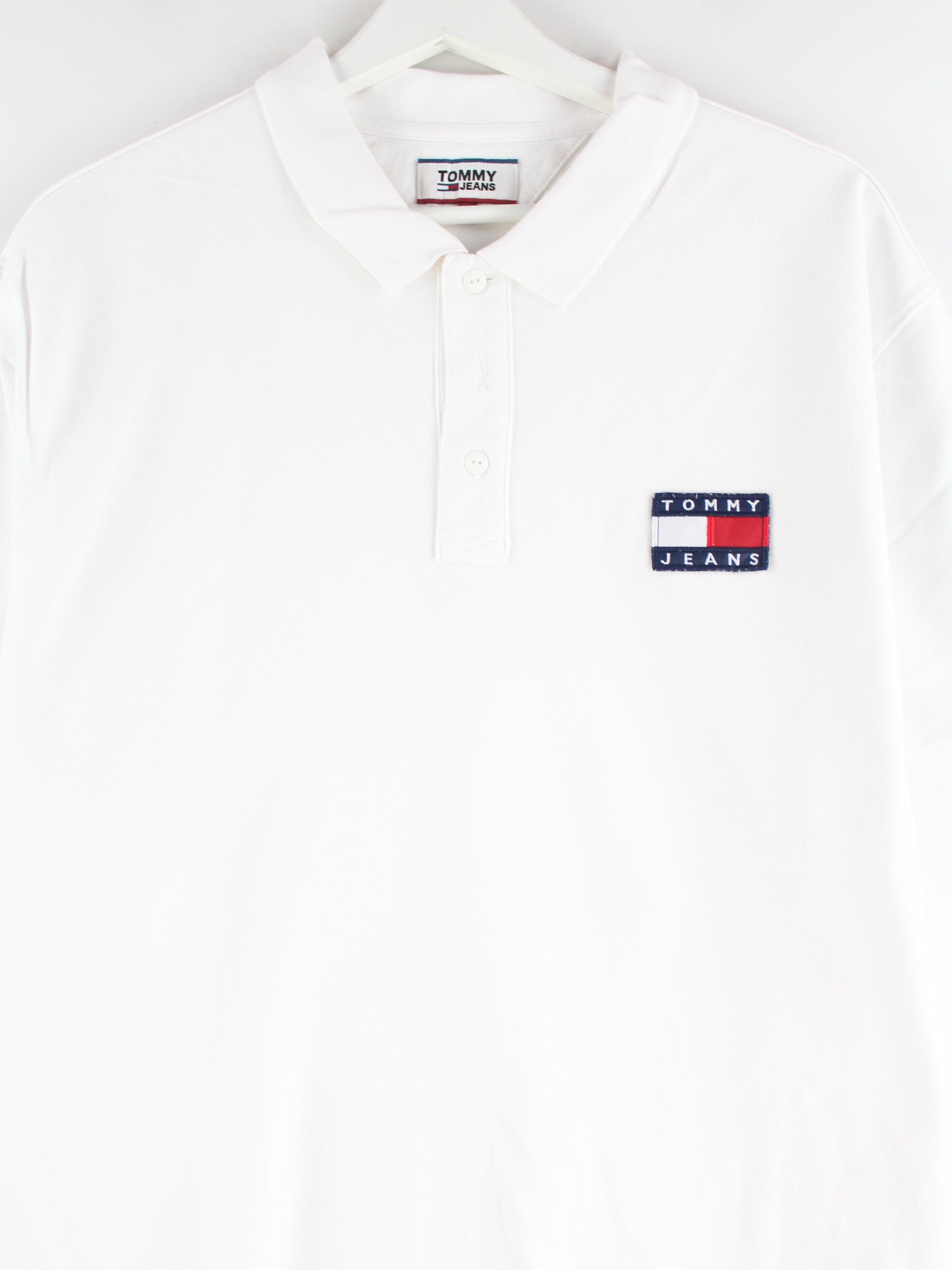 Poloshirt der Marke Tommy Hilfiger mit Stickereien in Größe XL. Es ist aus Baumwolle angefertigt und in Weiß zu haben.