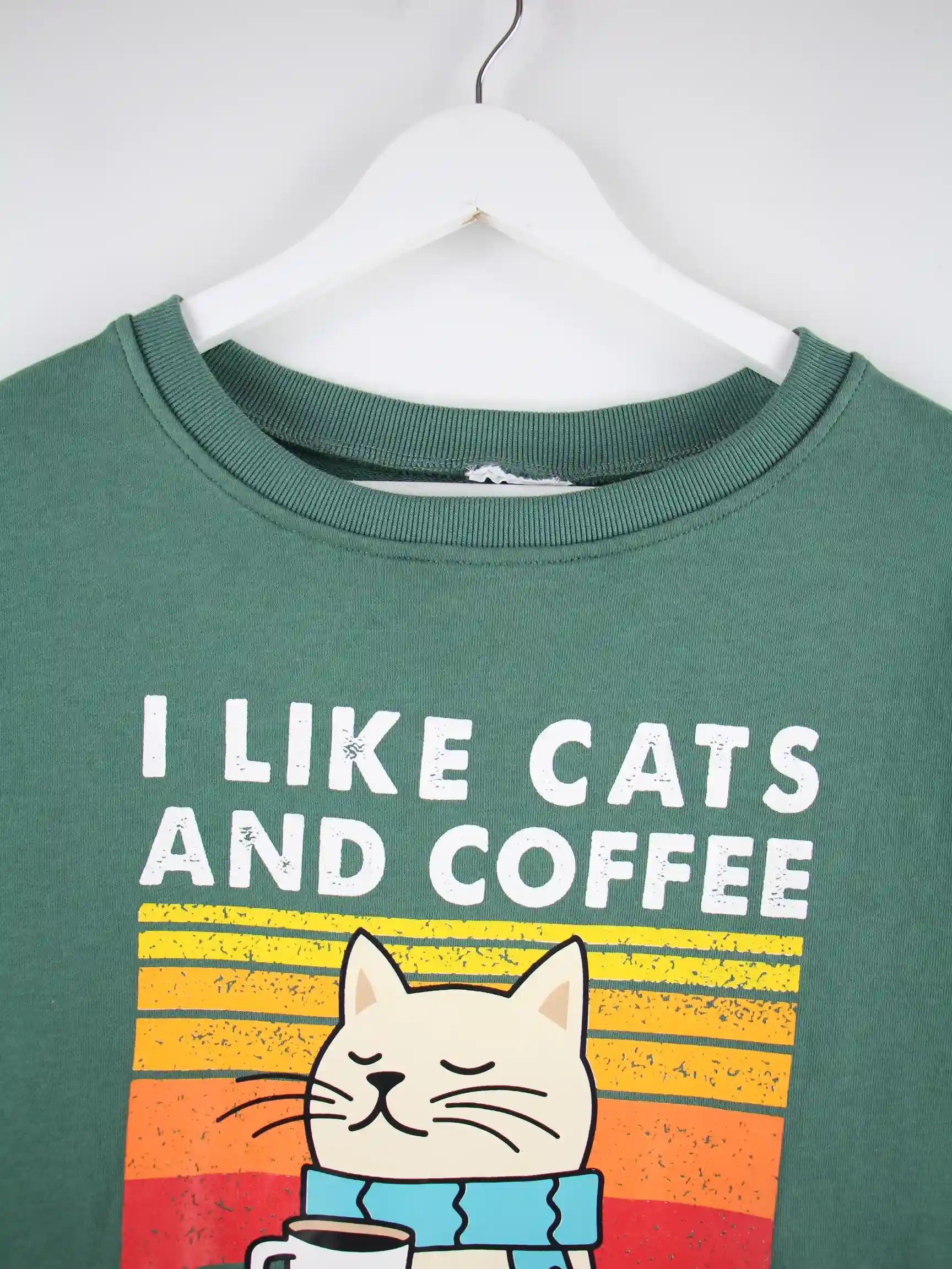 Vintage Damen Cats And Coffee Print Sweater Grün L