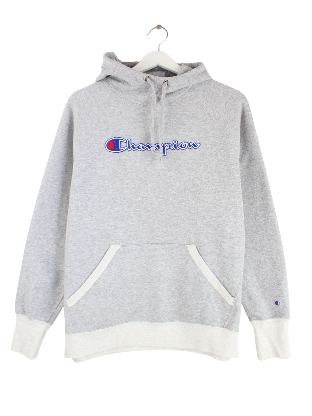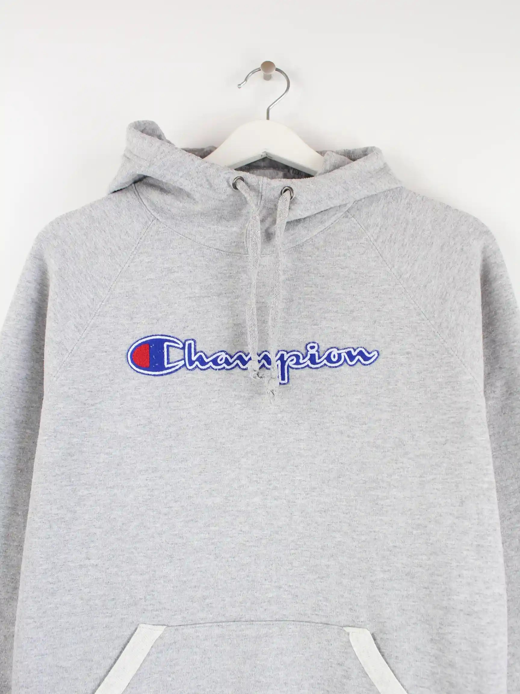 Grauer Hoodie der Brand Champion in Größe L. Er ist aus einer Baumwollmischung hergestellt und in sehr gutem Zustand bei uns vorrätig.