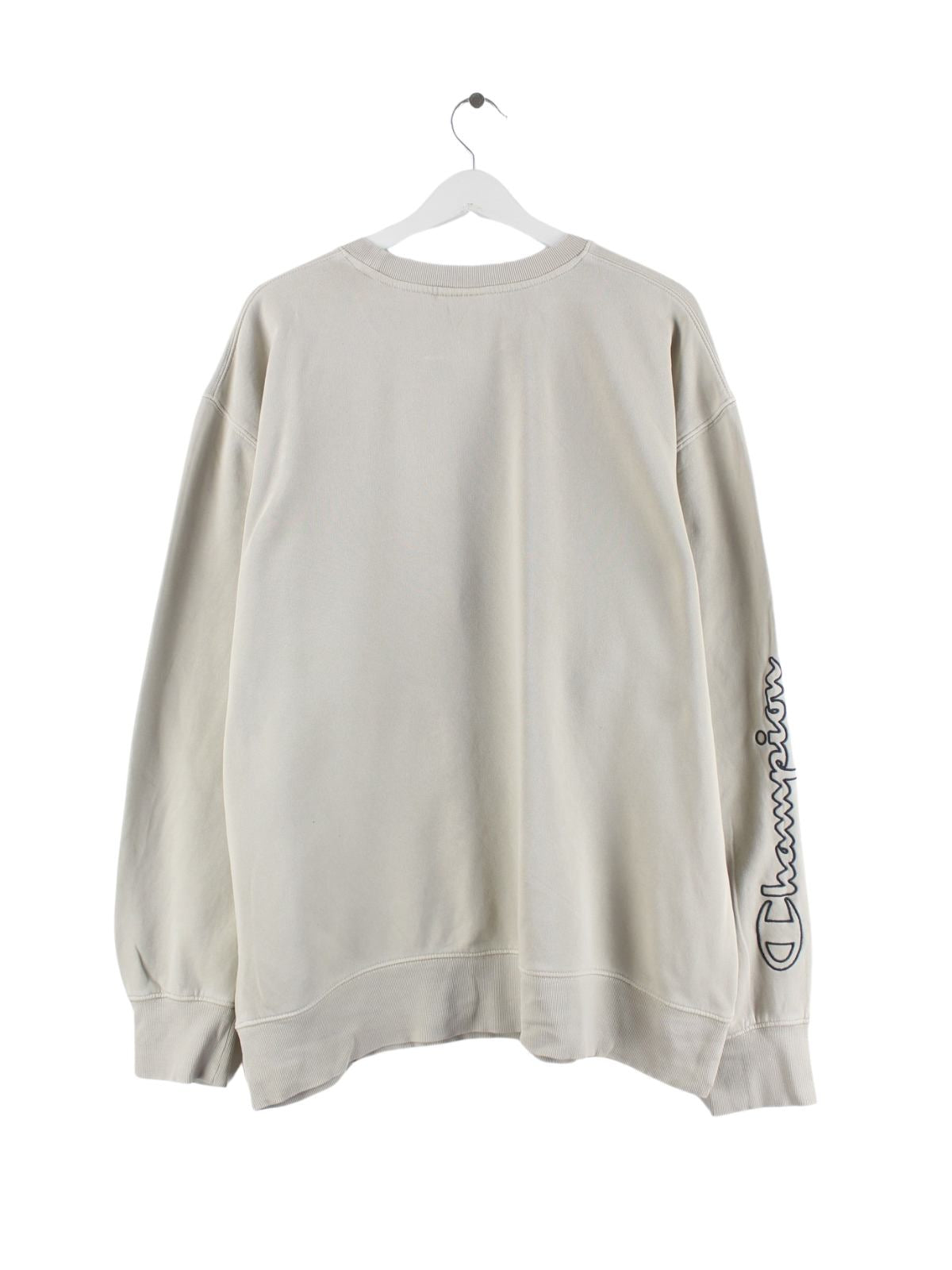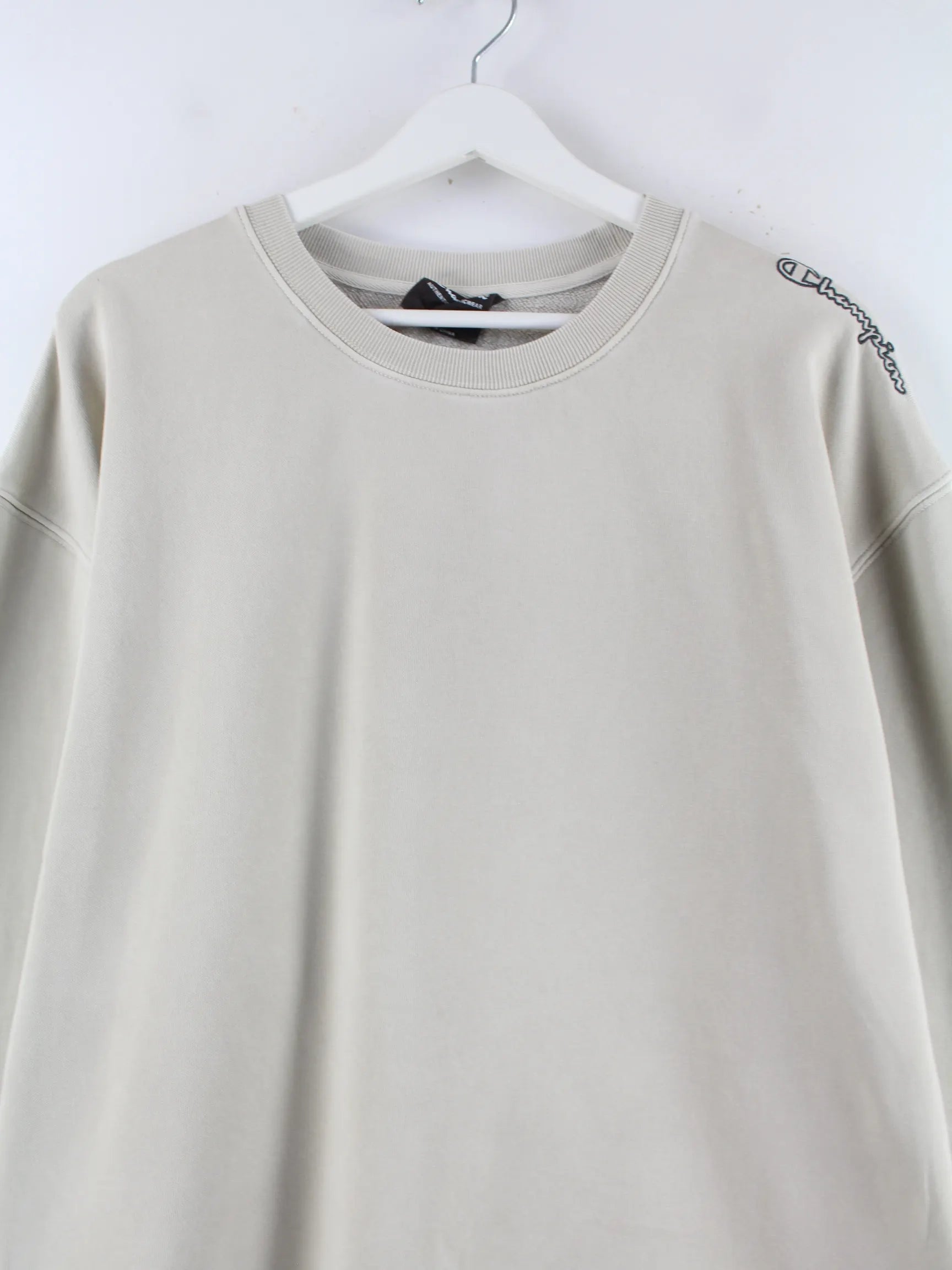 Grauer Sweater mit Stick von Champion in Größe L. Er ist aus einer Baumwollmischung angefertigt und in sehr gutem Zustand in Stock.