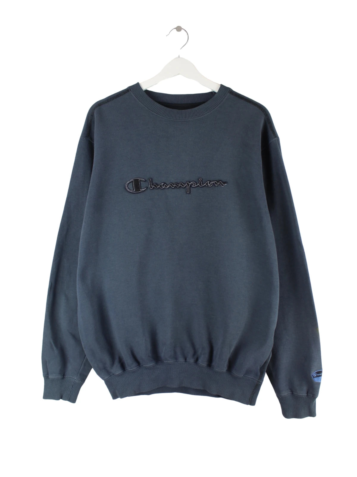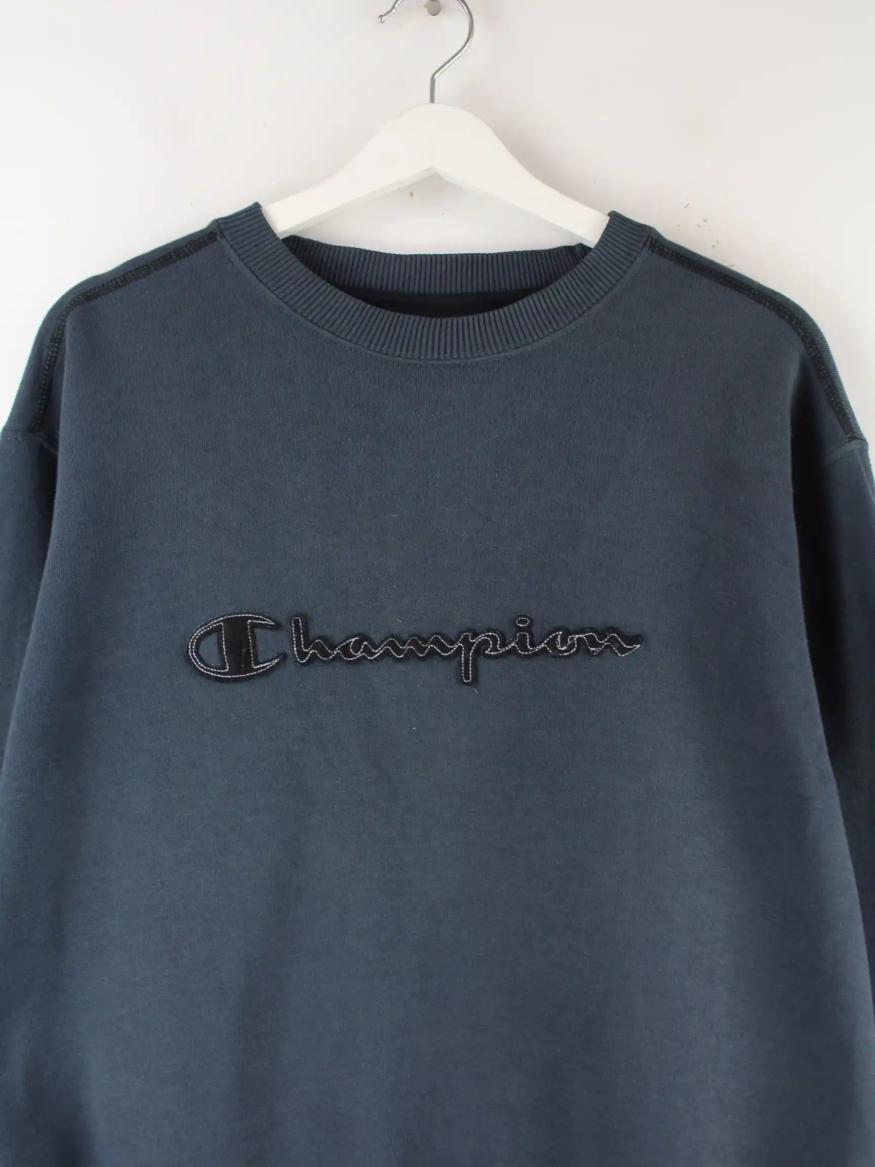 Sweater der Brand Champion mit gestickten Motiven in Größe XL. Er ist aus einer Baumwollmischung gemacht und in Grün zu haben.
