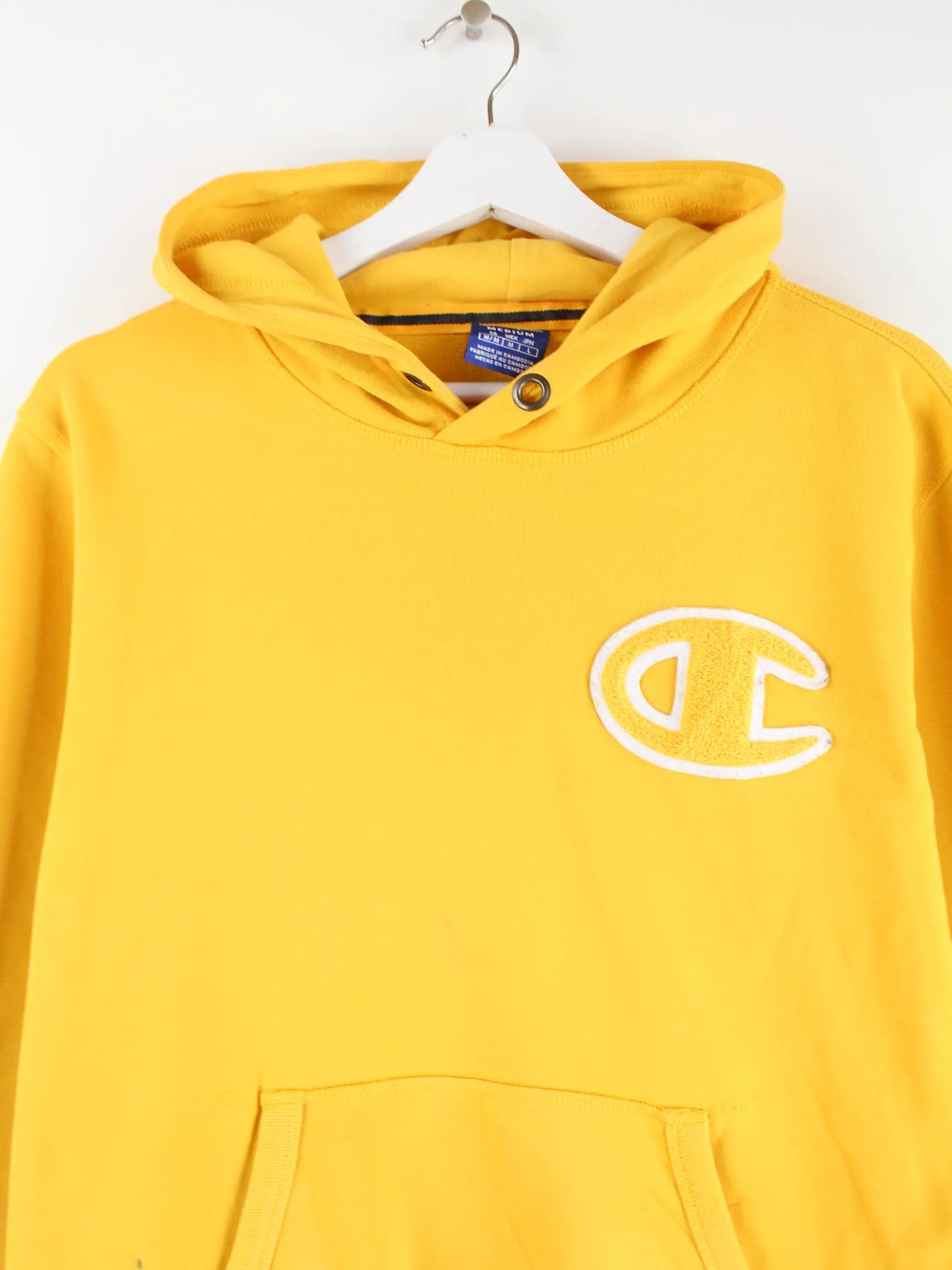 Gelber Kapuzenpullover des Labels Champion in Größe M. Er ist aus einer Baumwollmischung. Den Zustand würden wir als 'In Ordnung' bezeichnen (vergl. Bilder).