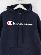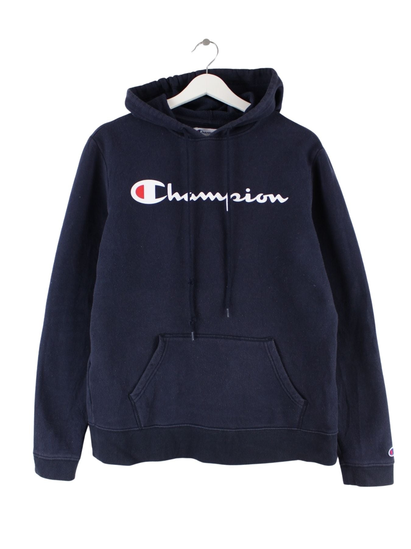 Blauer Hoodie vom Label Champion in Größe S. Er ist aus einer Baumwollmischung gefertigt und in gutem Zustand vorrätig. Mit tollem Print.