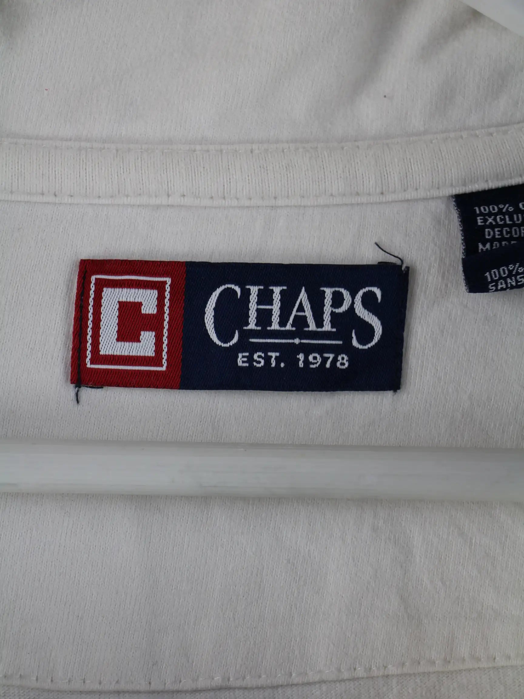 Sweater aus dem Hause Chaps by Ralph Lauren mit kurzem Reißverschluß in Größe XXL. Er ist aus einer Baumwollmischung gemacht und in Weiß im Angebot.