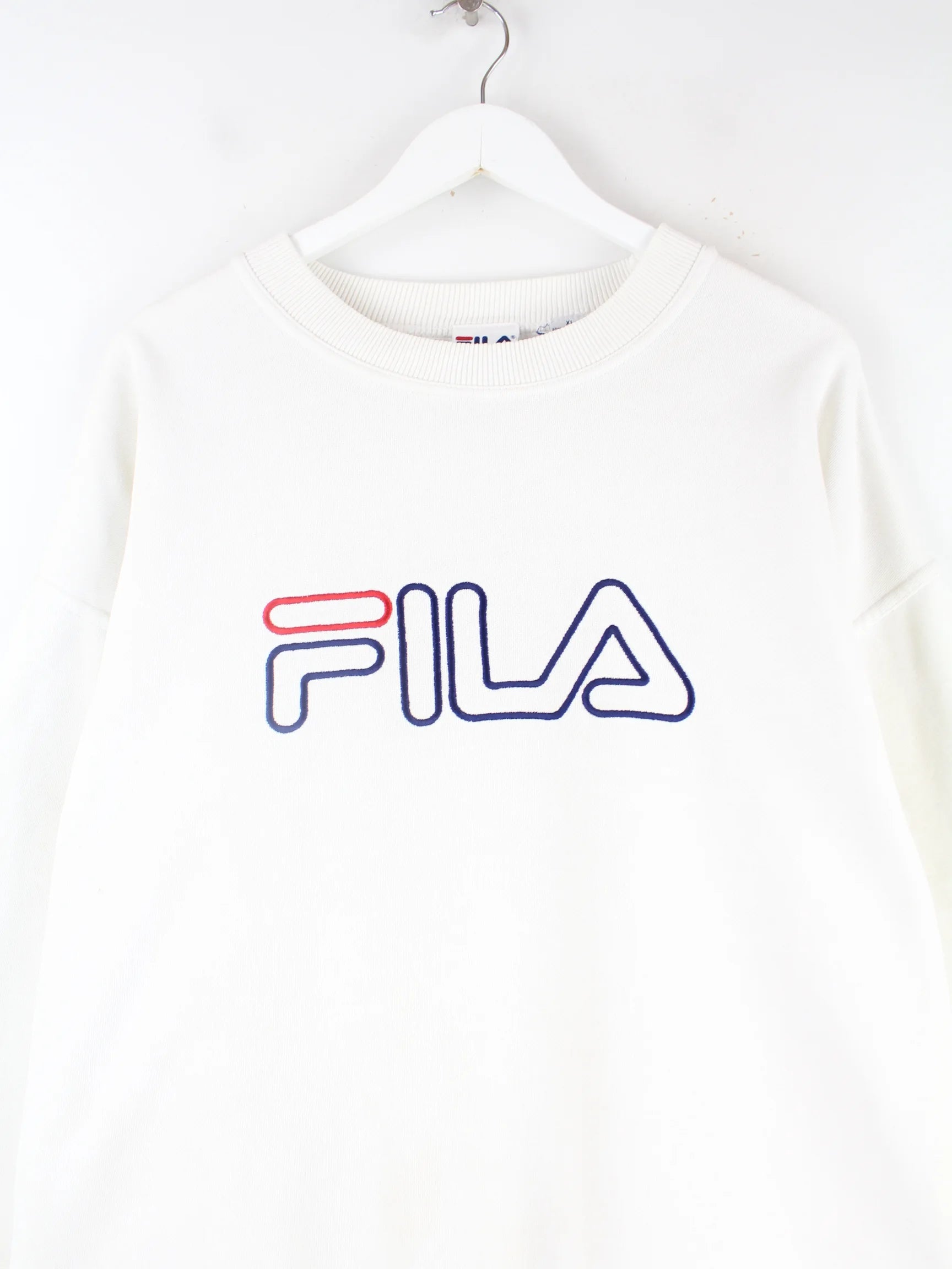 Weißer Sweater der Brand Fila in Größe XL. Er ist aus einer Baumwollmischung angefertigt. Den Zustand würden wir als 'In Ordnung' bezeichnen (vergl. Bilder).