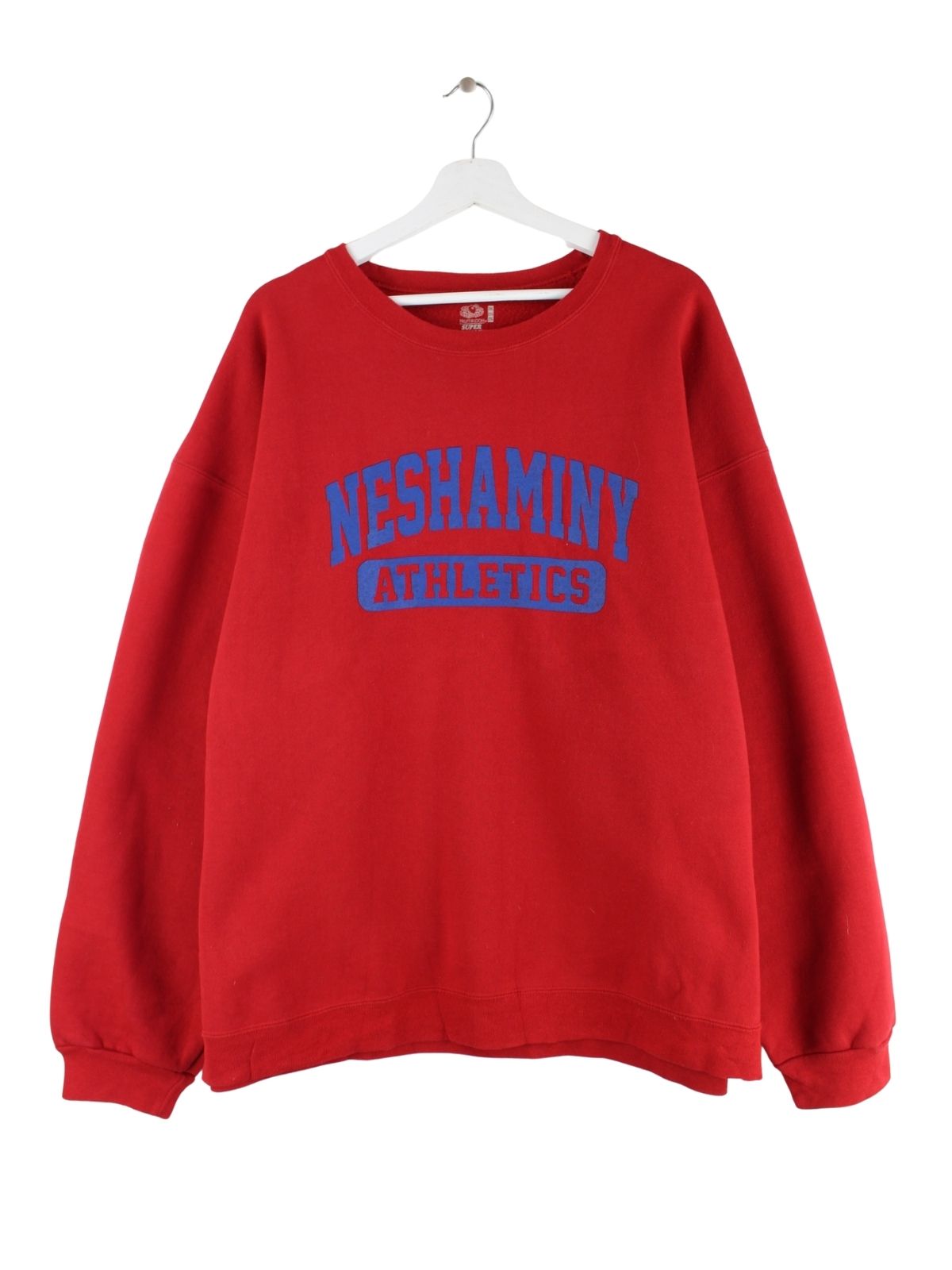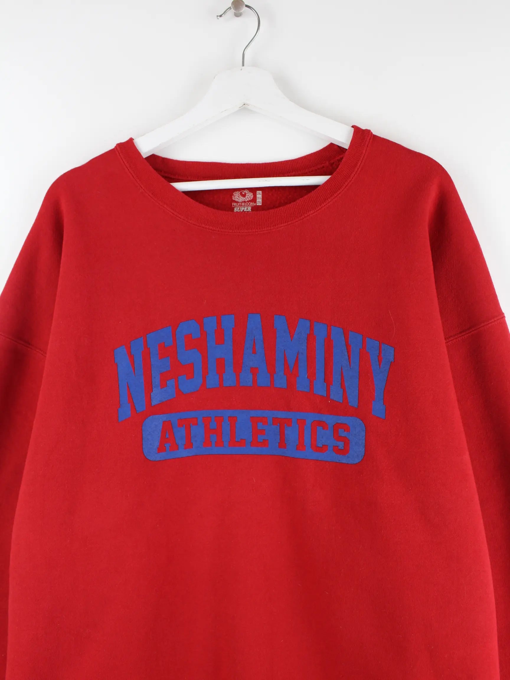 Roter Sweater vom Label Fruit of the Loom in Größe XXL. Er ist aus einer Baumwollmischung gemacht und in sehr gutem Zustand bei uns vorrätig. Mit schickem Neshaminy Print.