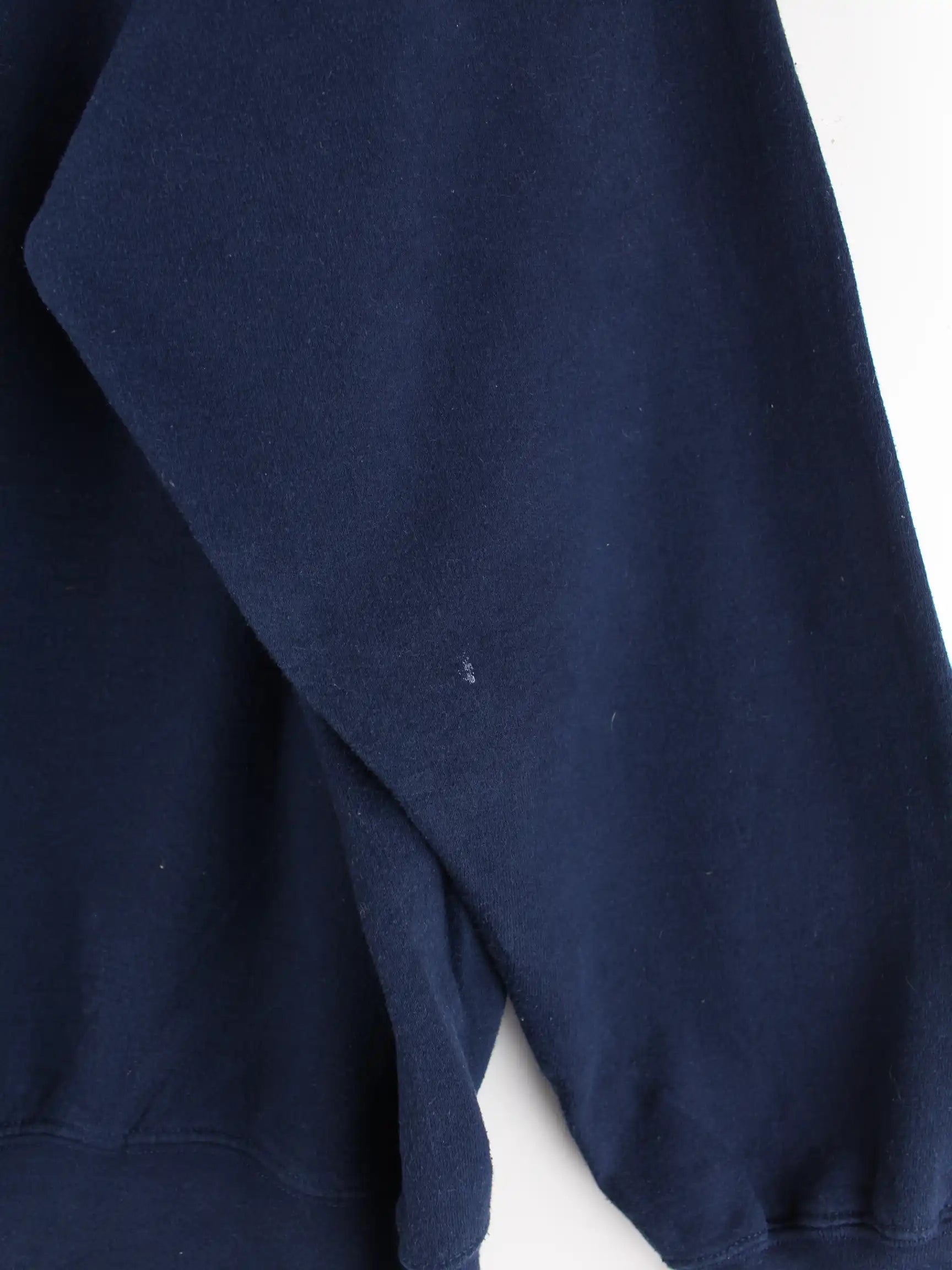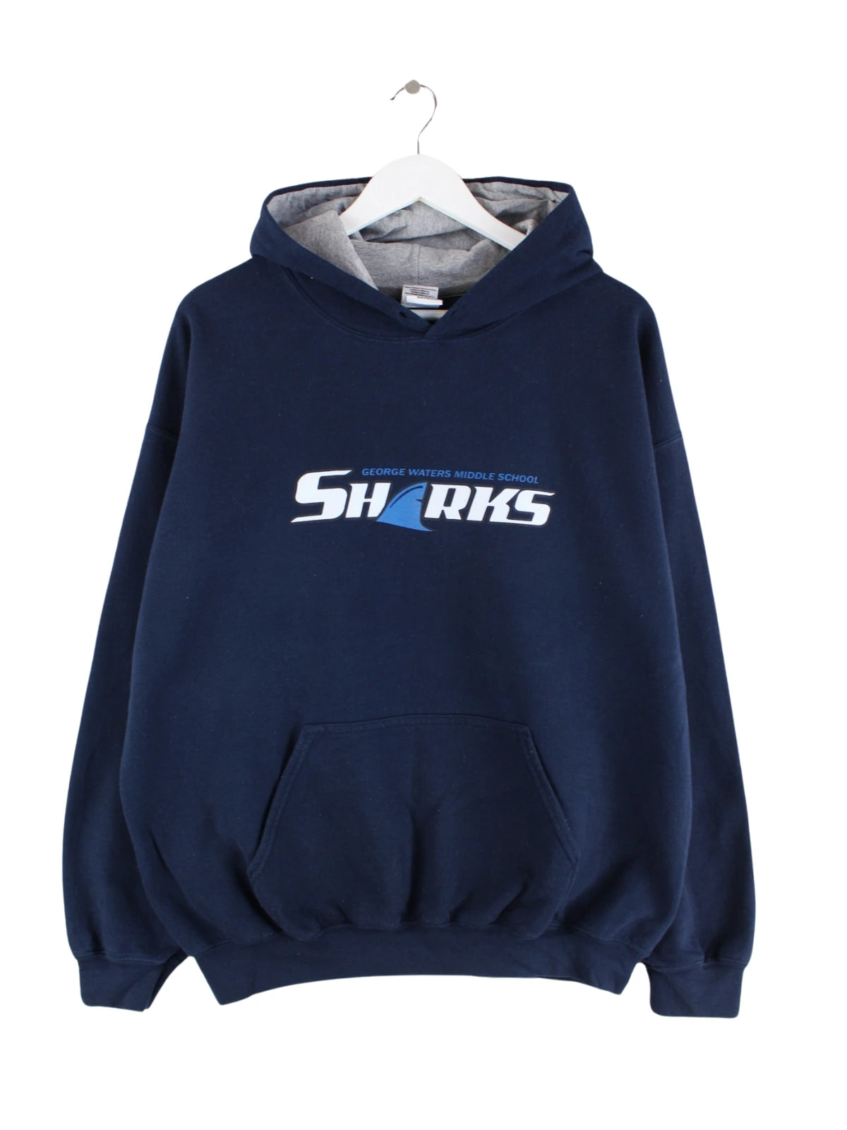 Hoodie von Gildan in Größe L. Er ist aus einer Baumwollmischung gefertigt und in Blau bei uns vorrätig. Mit chiquem Sharks Print.