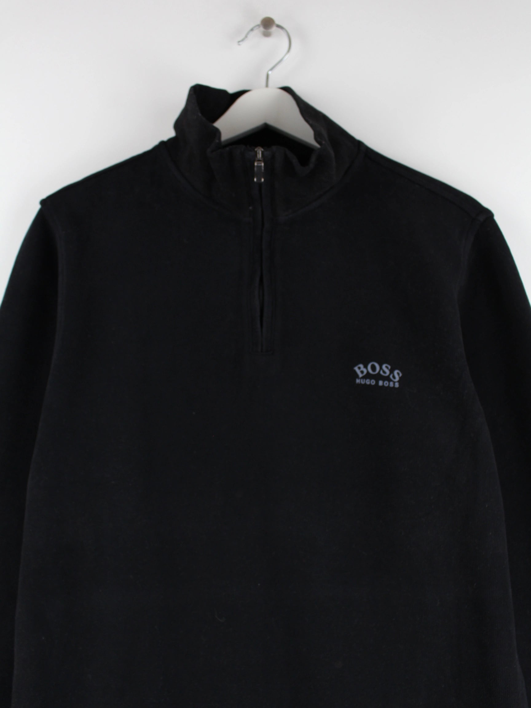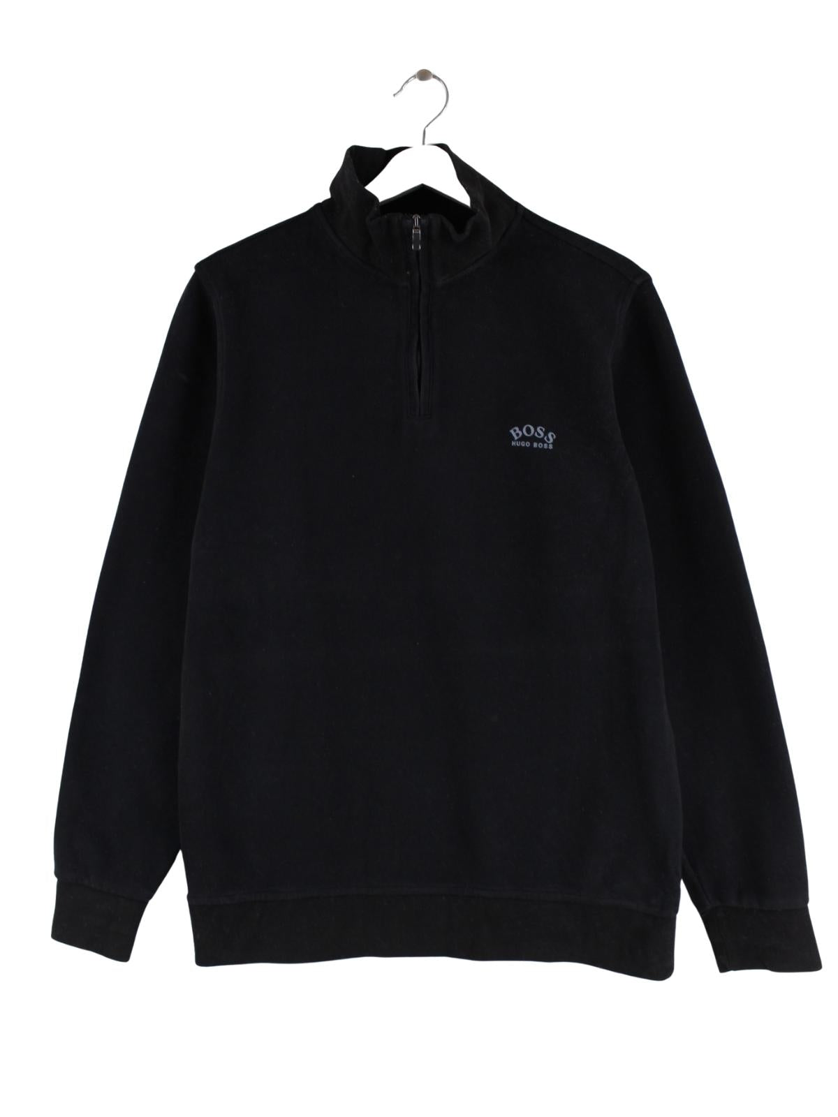 Schwarzer Pullover mit kurzem Reißverschluß aus dem Hause Hugo Boss in Größe L. Er ist aus einer Baumwollmischung hergestellt und in sehr gutem Zustand im Bestand.