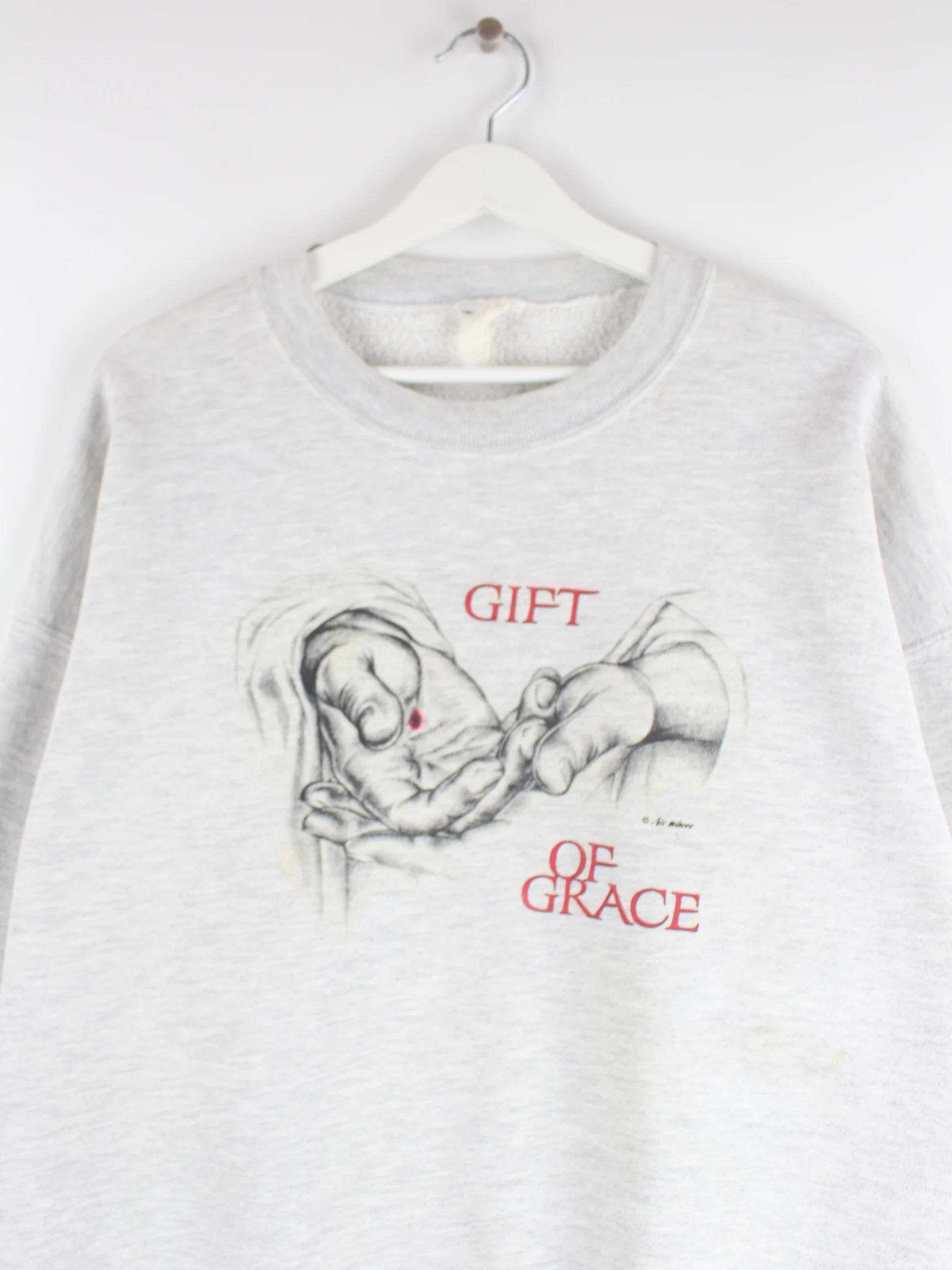 Sweater aus dem Hause Jerzees in Größe XL. Er ist aus einer Baumwollmischung produziert und in Grau vorrätig. Mit tollem Grace Print.