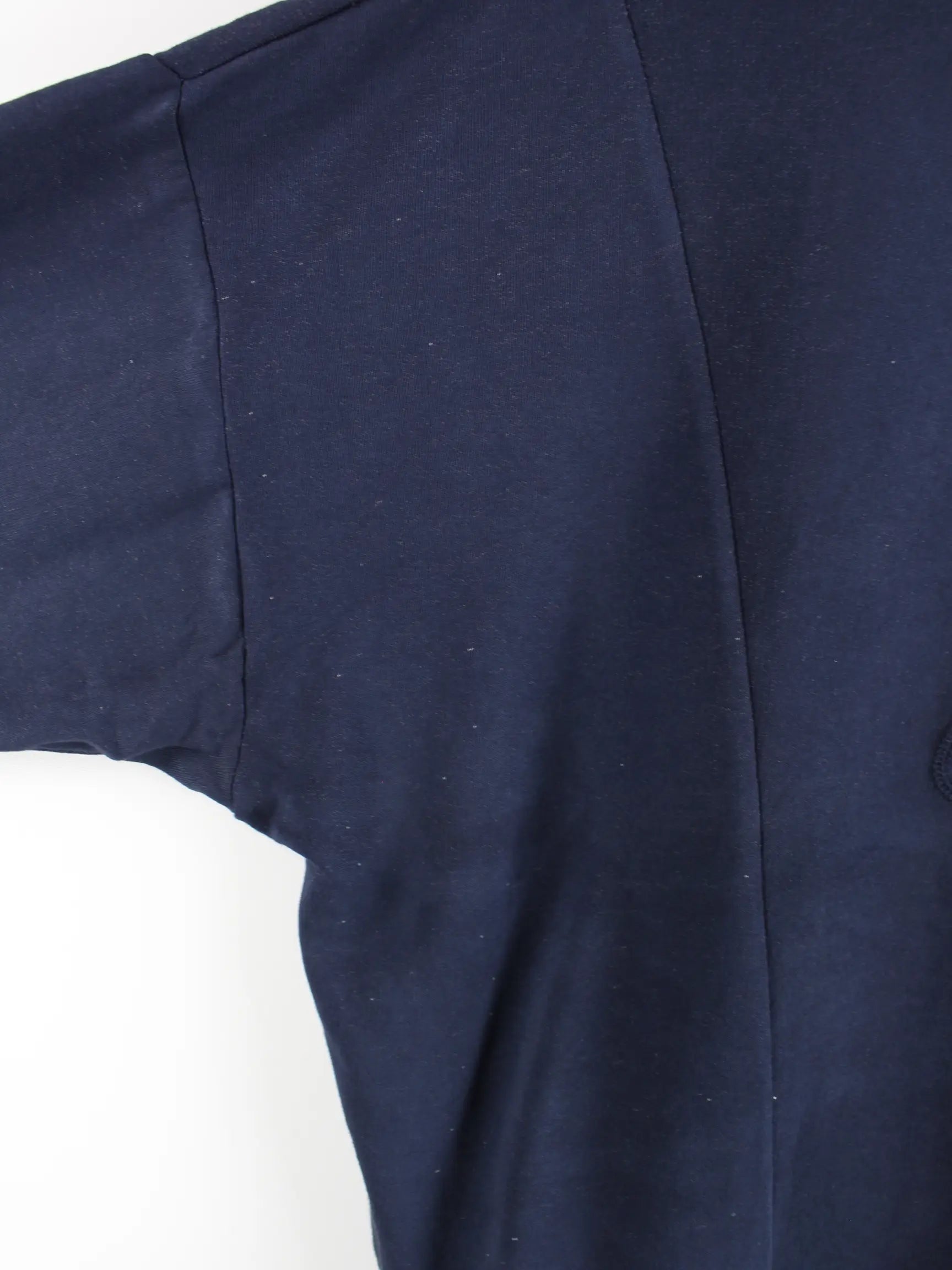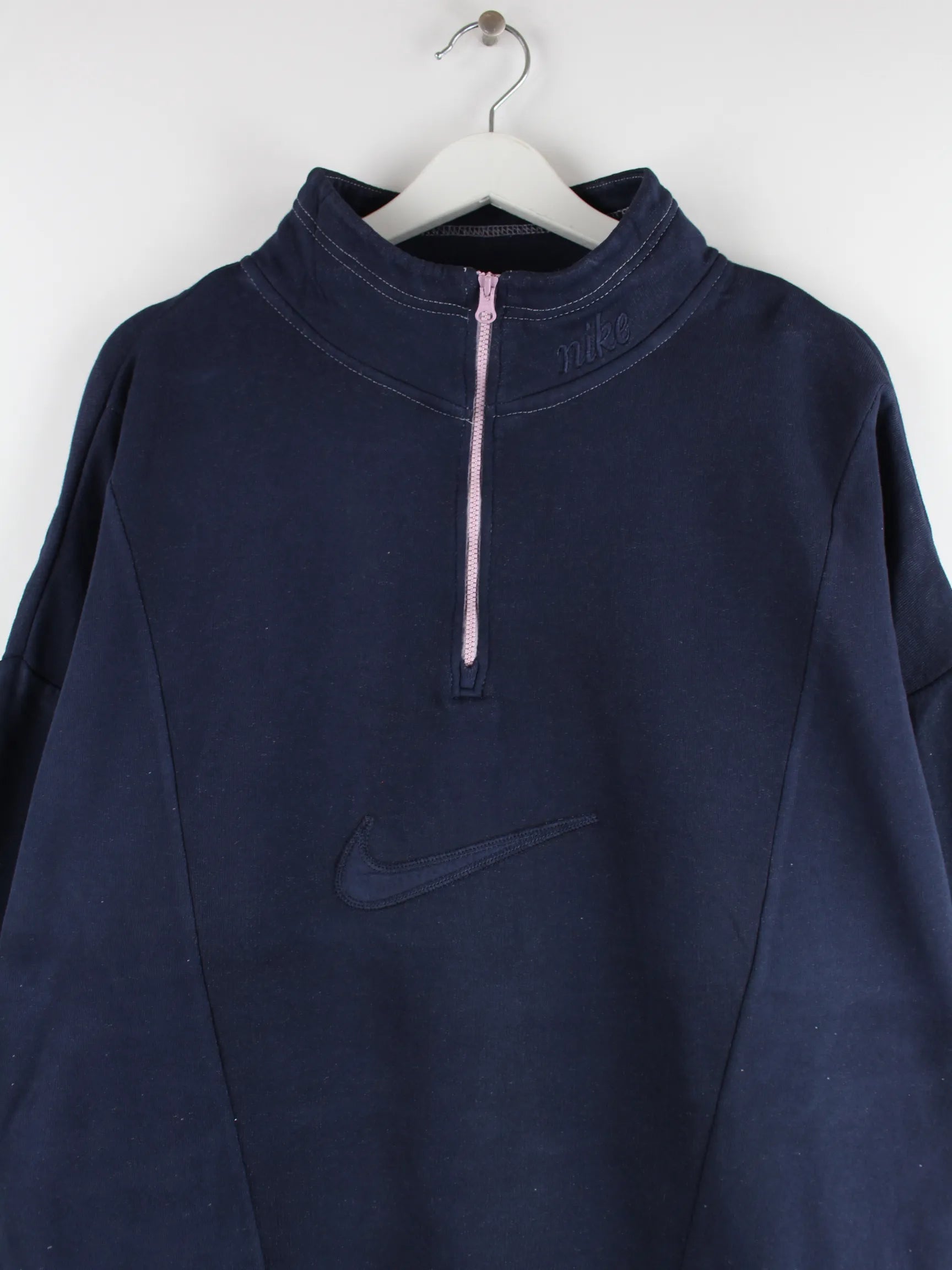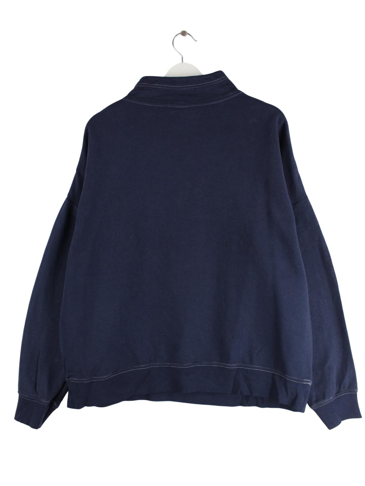 Blauer Sweater mit halbem Reißverschluß des Labels Nike in Größe L. Er ist aus einer Baumwollmischung hergestellt. Den Zustand würden wir als 'In Ordnung' bezeichnen (vergl. Bilder).