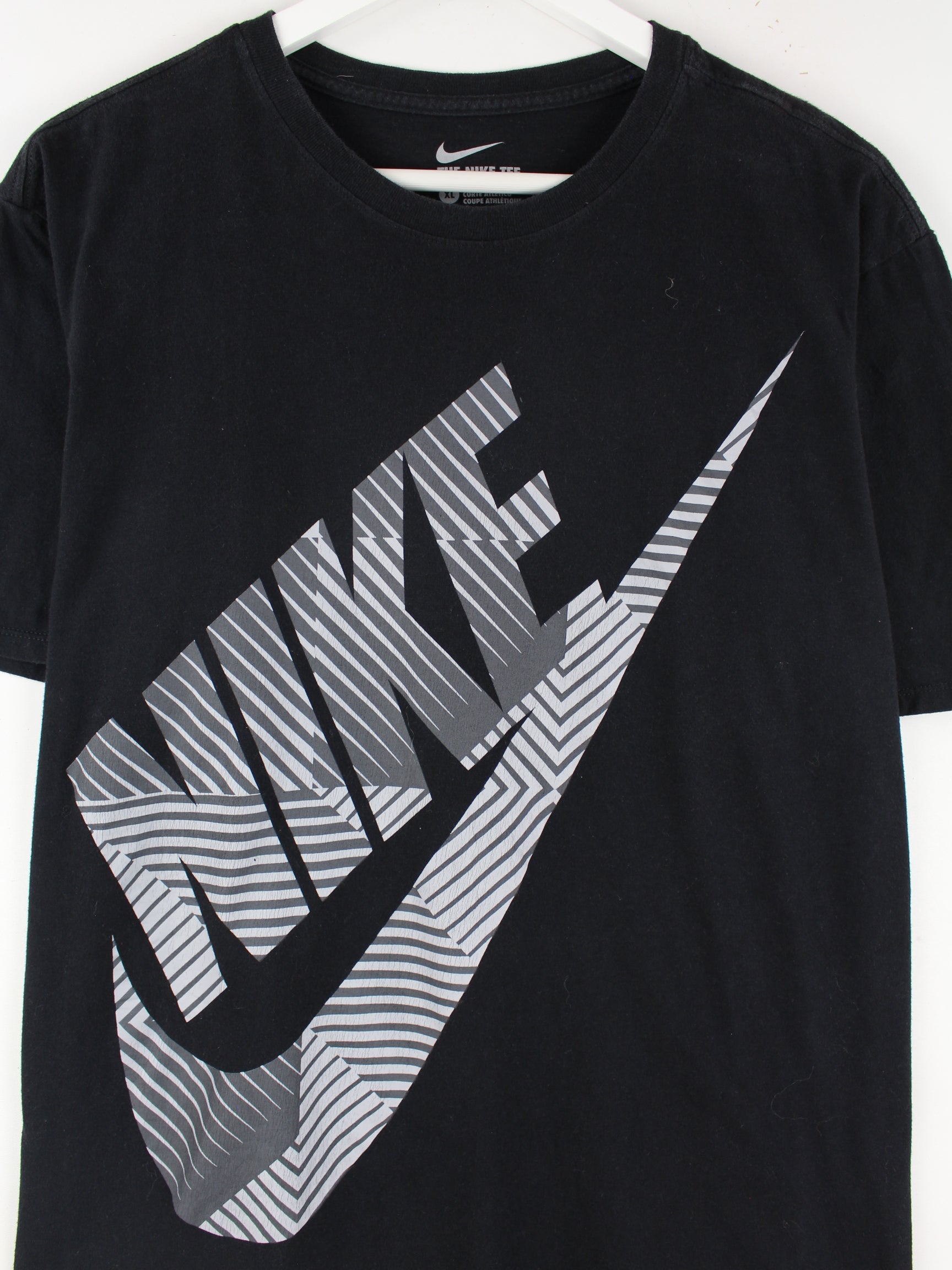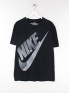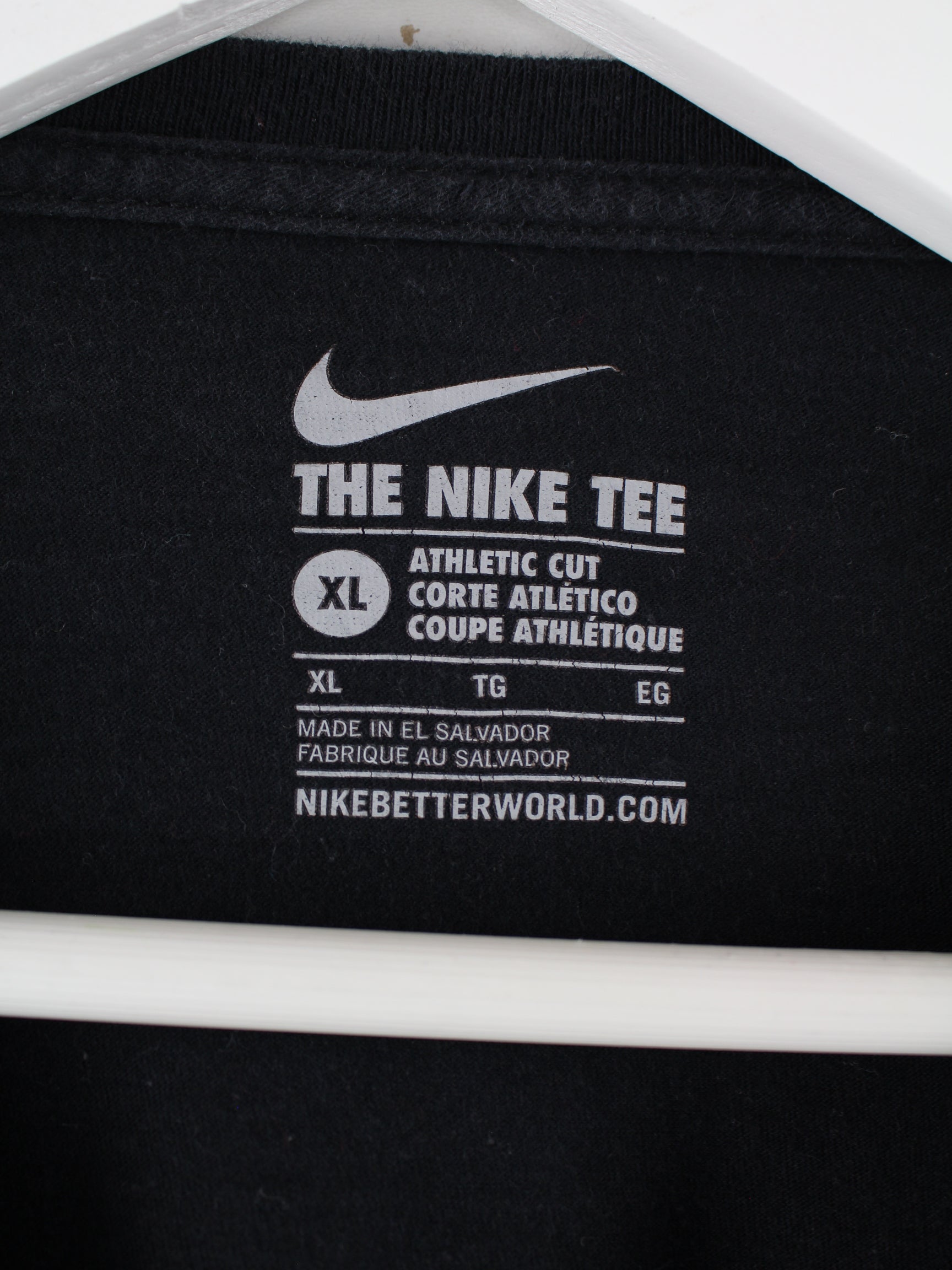 Schwarzes T-Shirt von Nike in Größe XL. Es ist aus Baumwolle gefertigt und in gutem Zustand bei uns zu bekommen. Mit schickem Print.