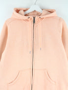 Rosafarbener Hoodie mit Stickereien und durchgehendem Reißverschluß vom Brand Carhartt in Größe M. Er ist aus einer Baumwollmischung und in gutem Zustand lieferbar.