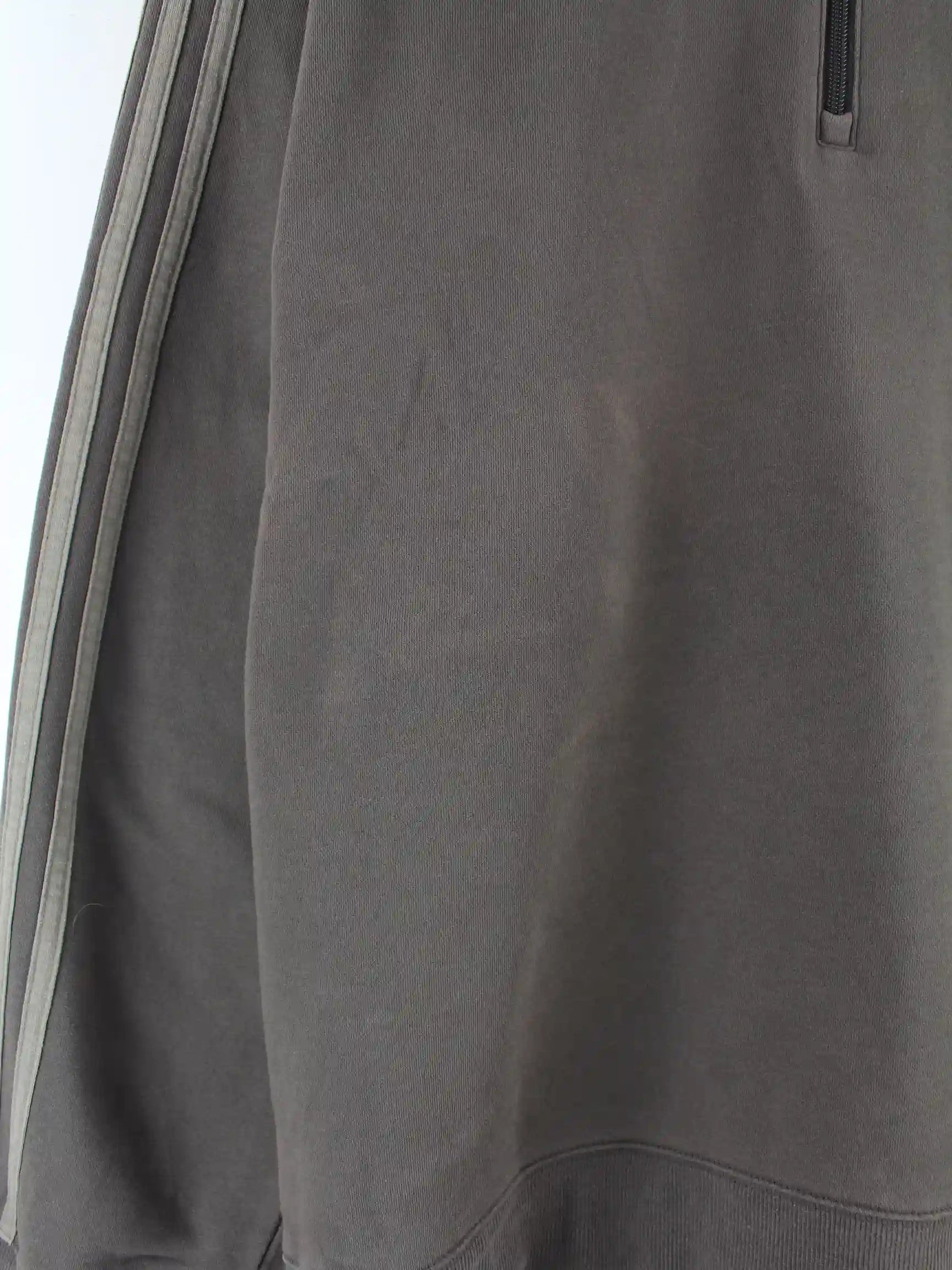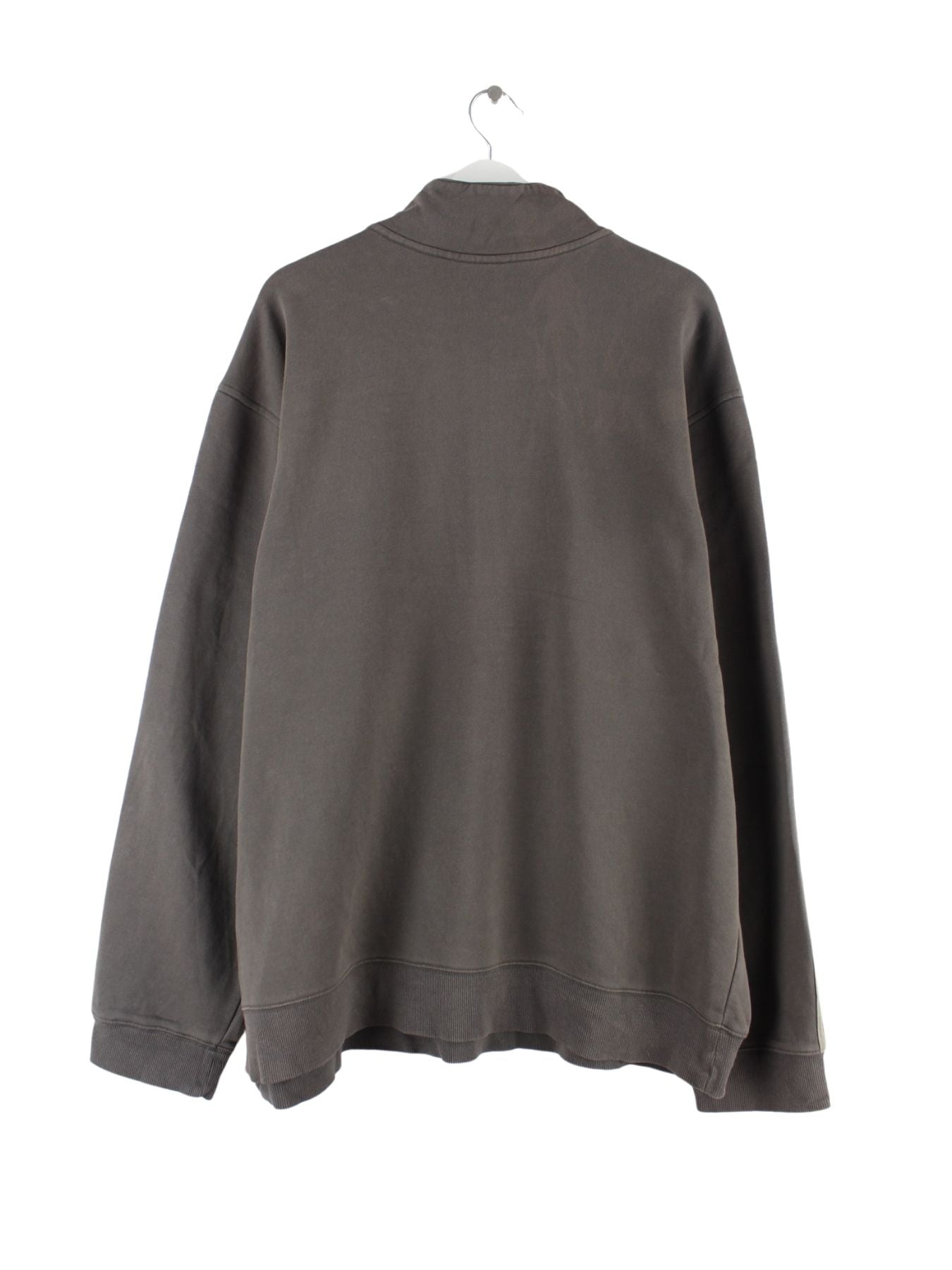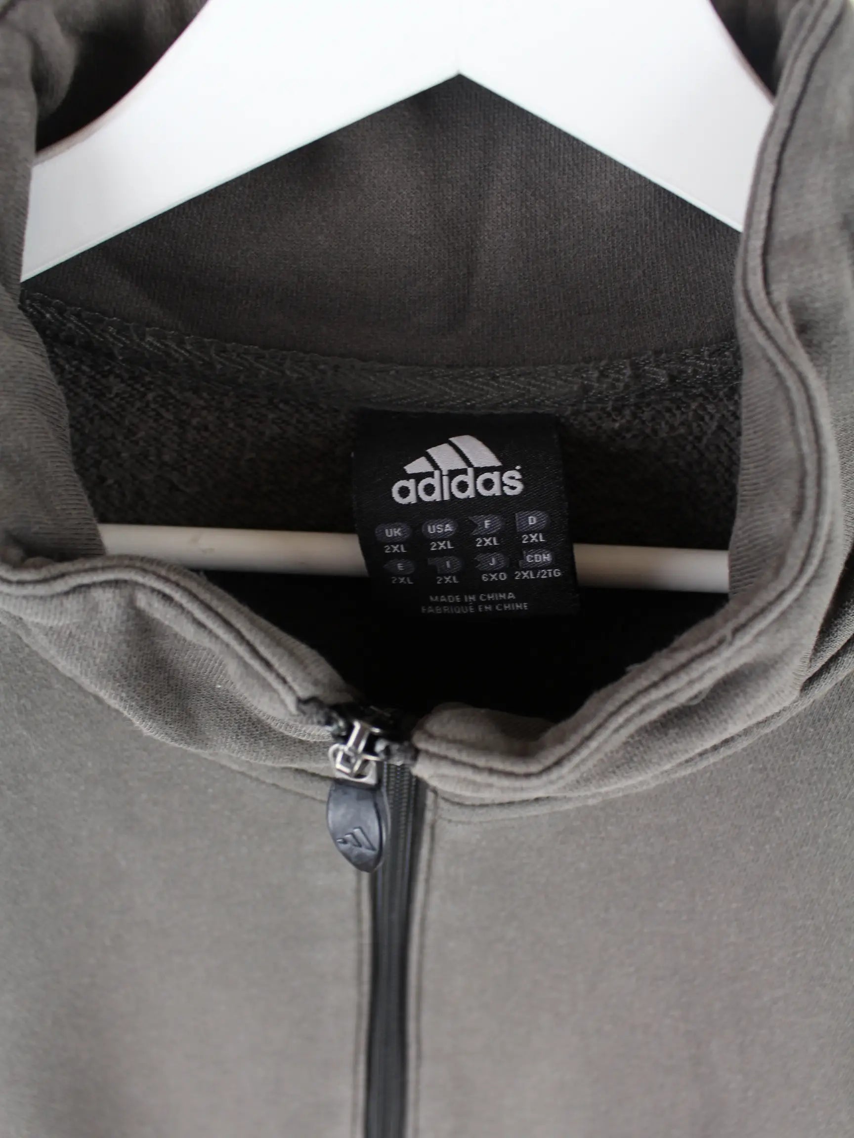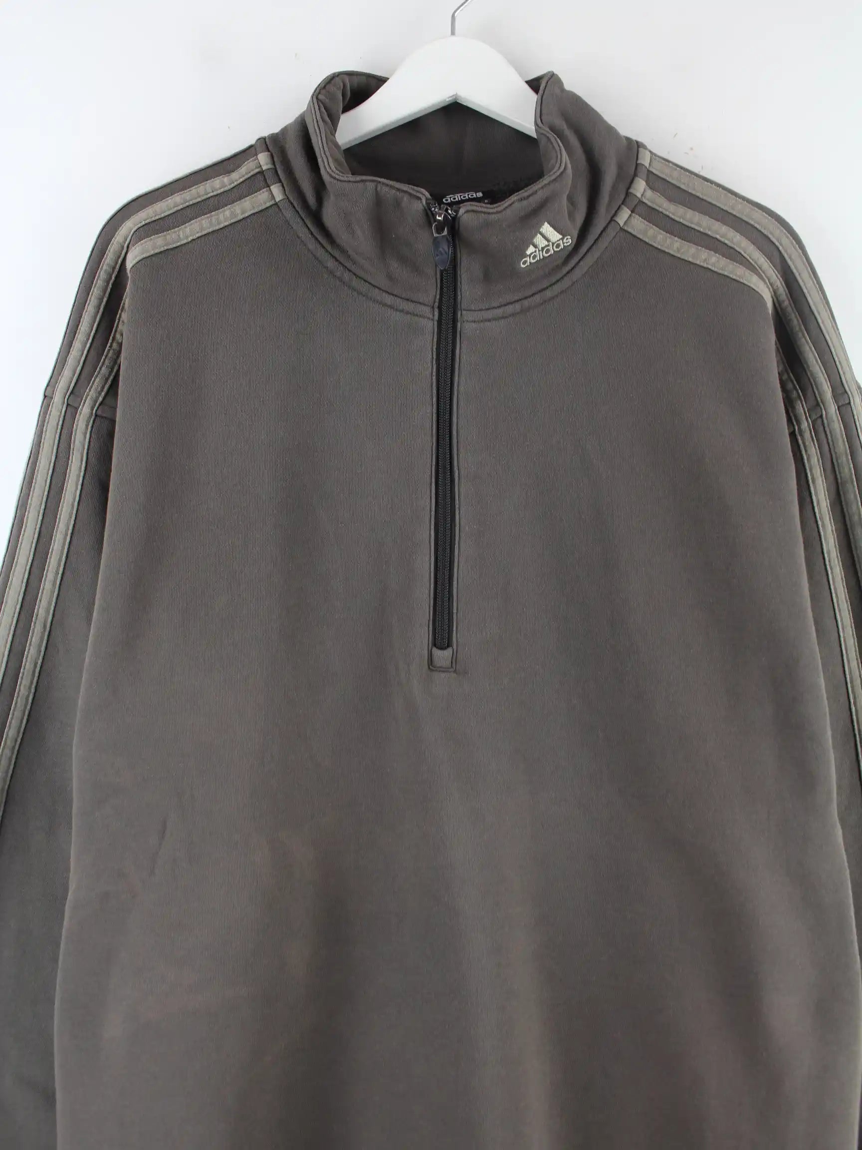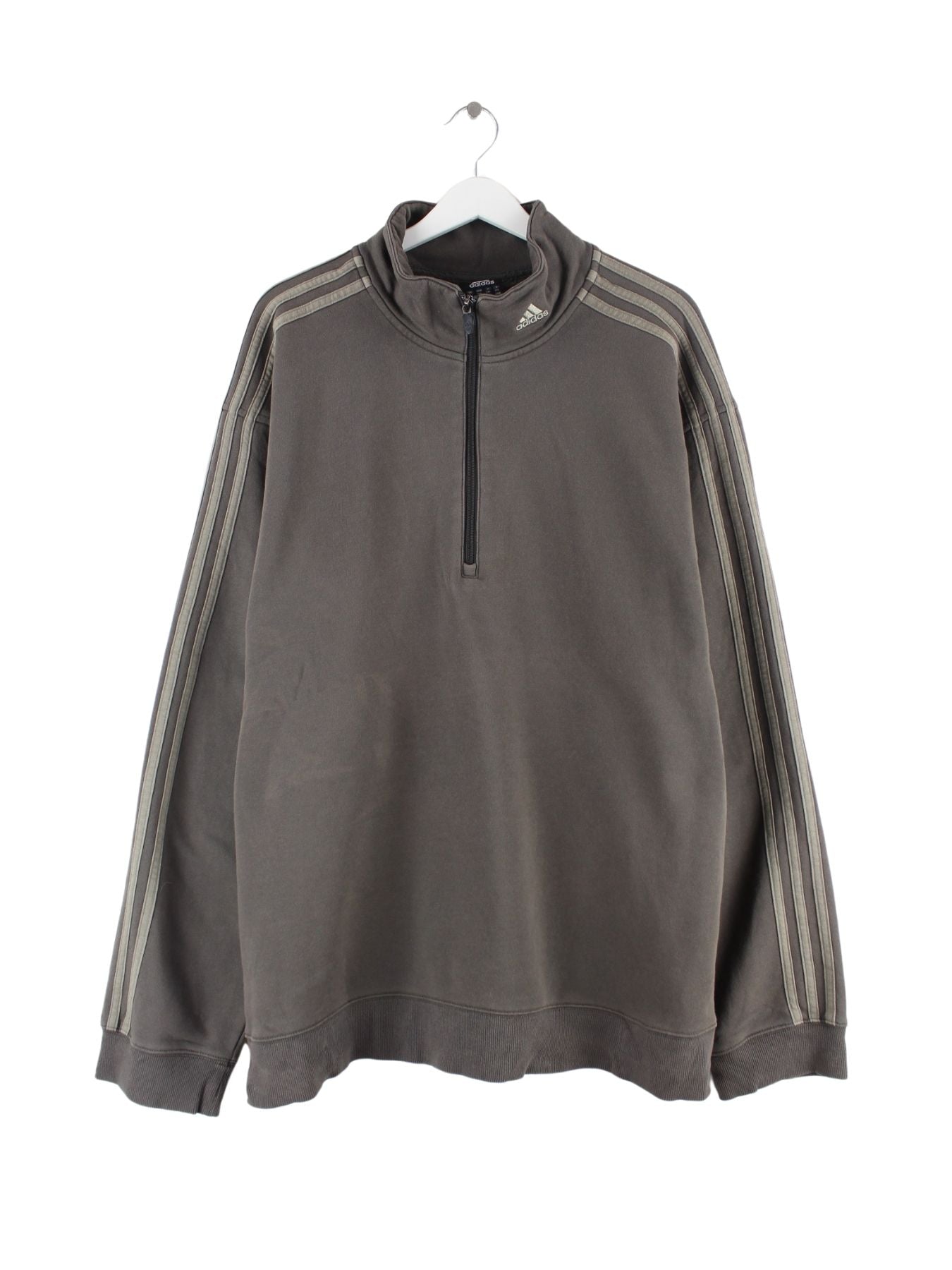 Grauer Sweater mit halbem Reißverschluß vom Label Adidas in Größe XXL. Er ist aus einer Baumwollmischung gemacht und in gutem Zustand auf Lager.