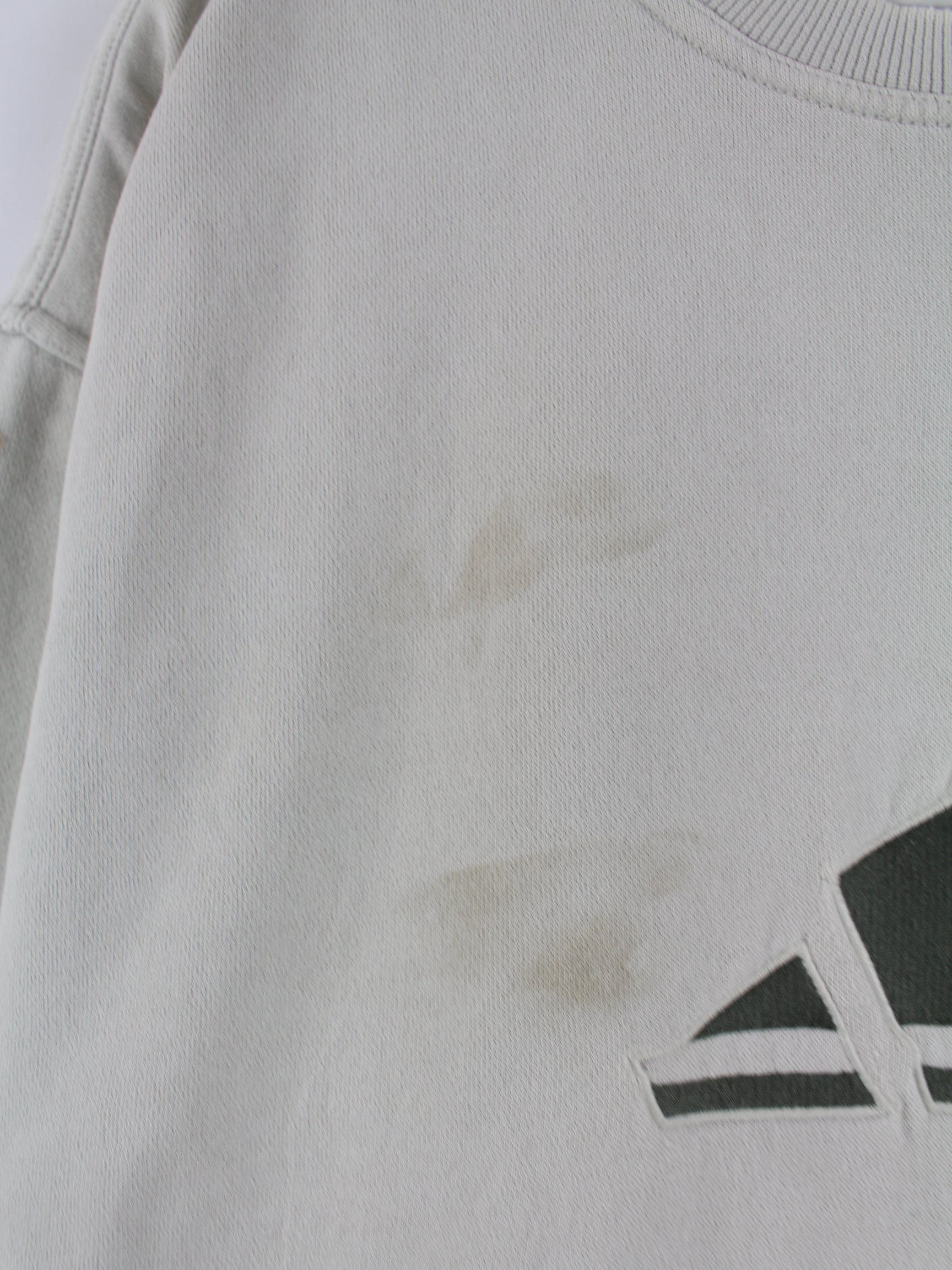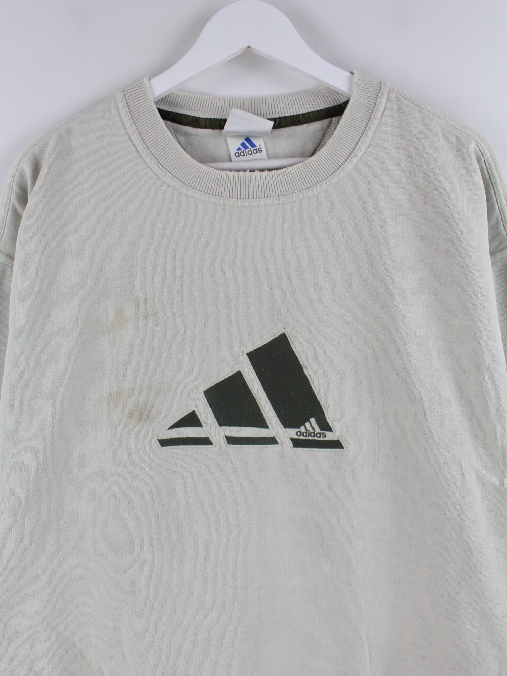 Sweater der Marke Adidas mit gesticktem Logo in Größe XL aus den 90'ern. Er ist aus einer Baumwollmischung gemacht und in Grau bei uns zu bekommen.