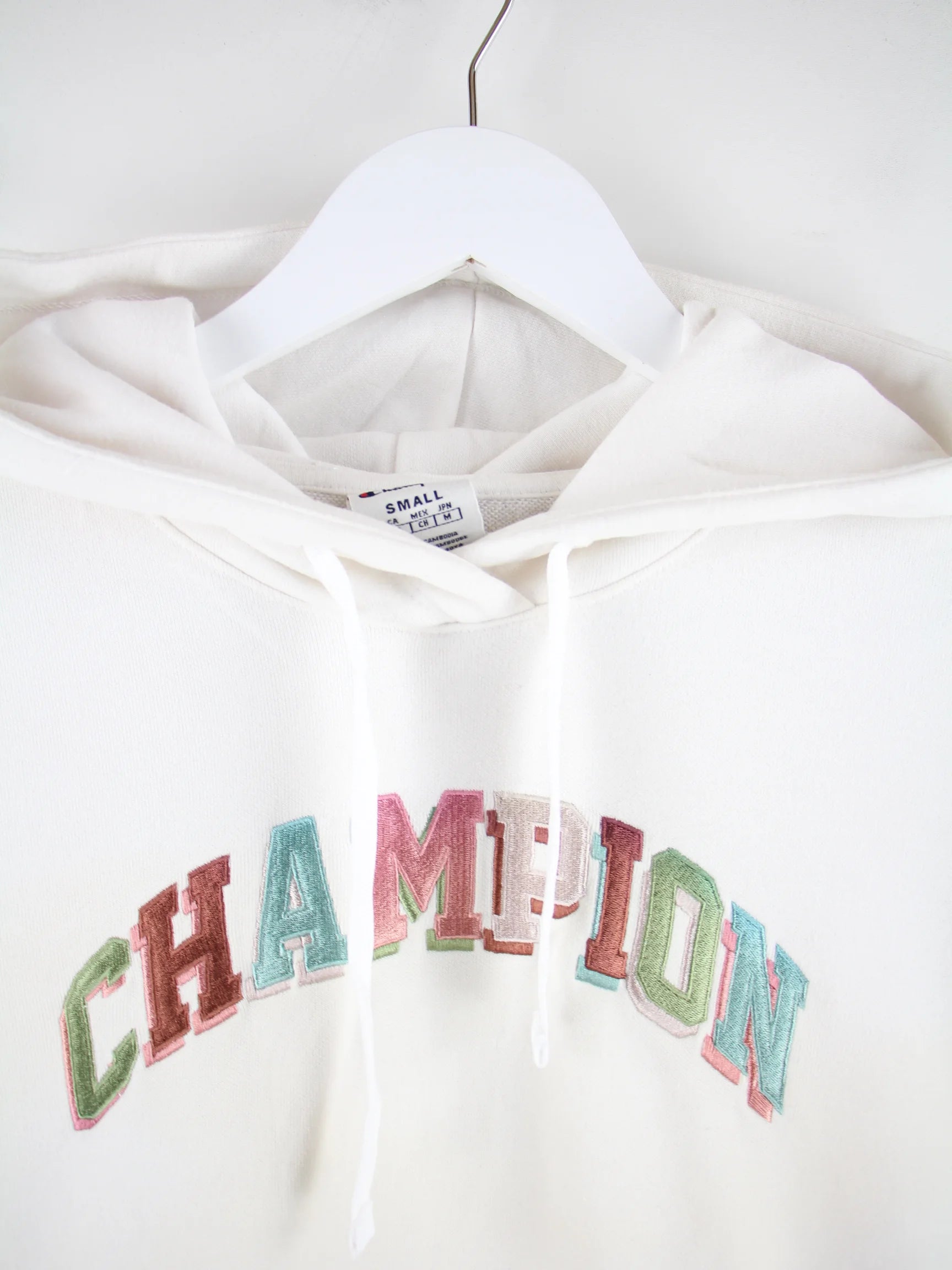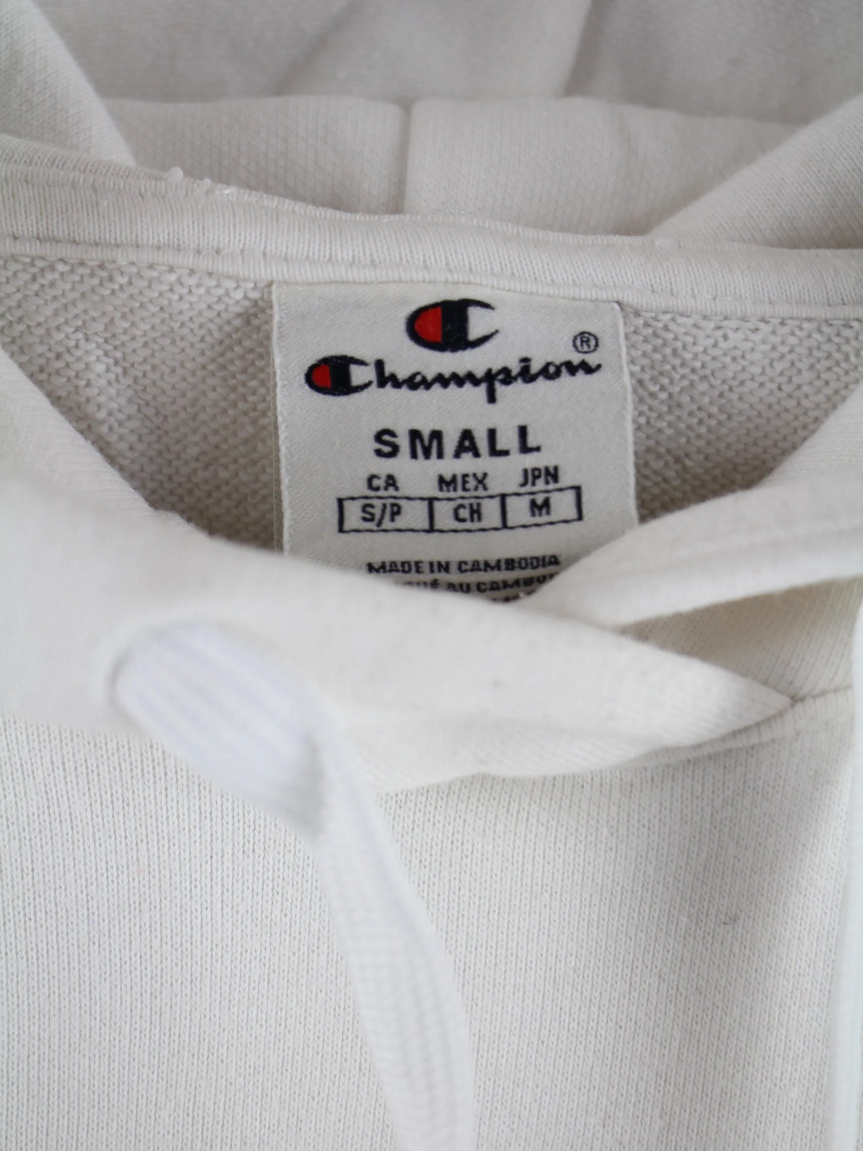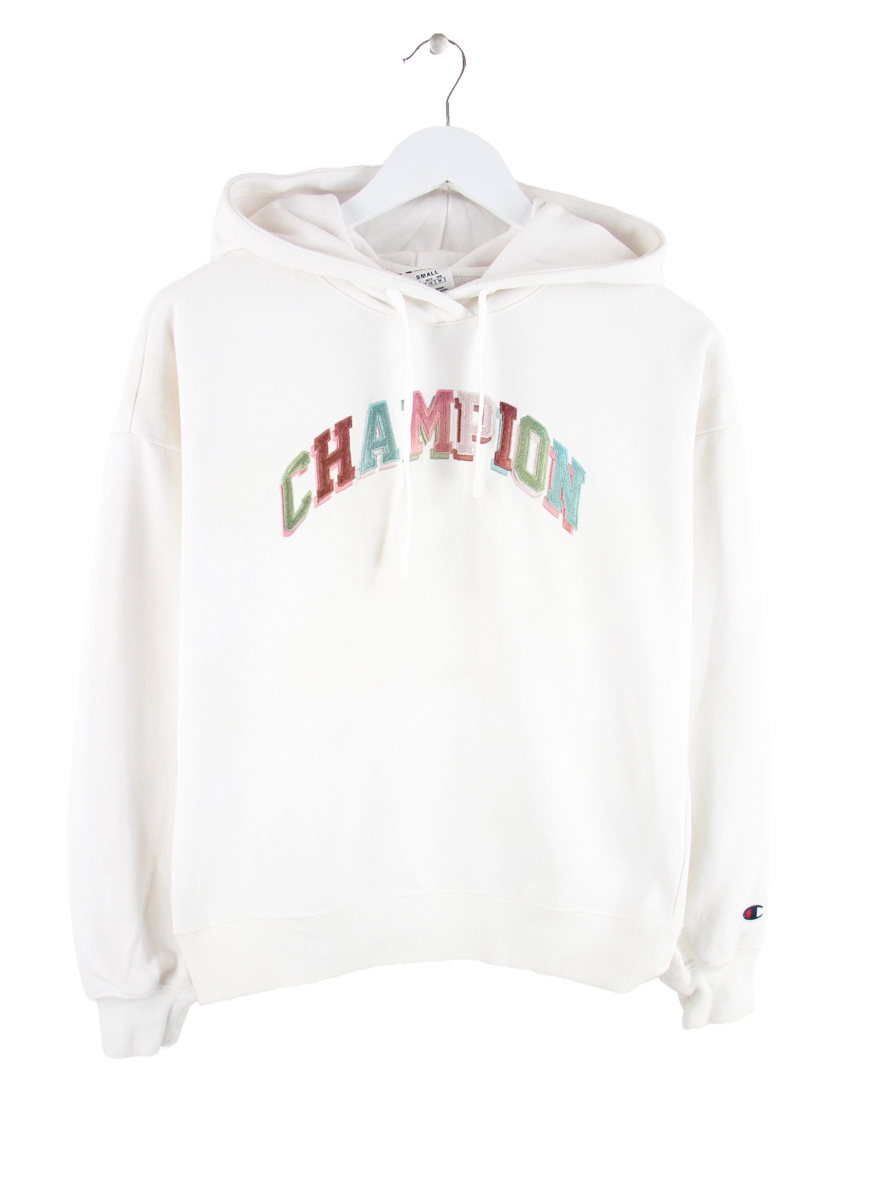 Hoodie des Labels Champion in Größe S. Er ist aus einer Baumwollmischung gemacht und in Weiß vorrätig.