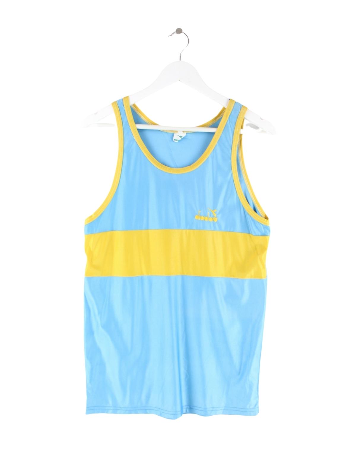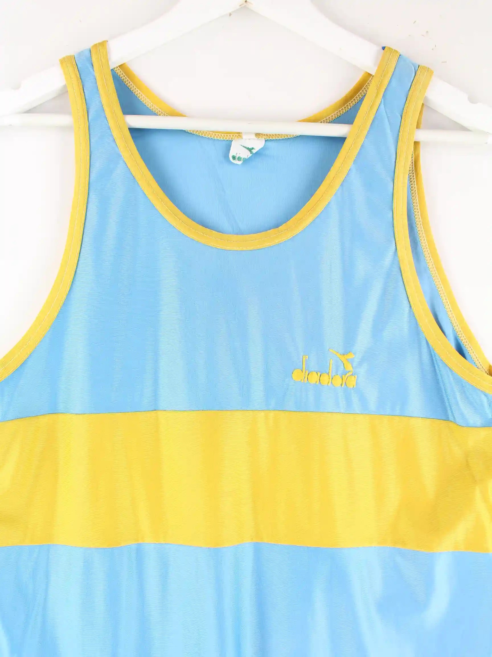 Jersey vom Brand Diadora in Größe M aus den 80'ern. Es ist aus Synthetik gefertigt und in Blau zu haben.