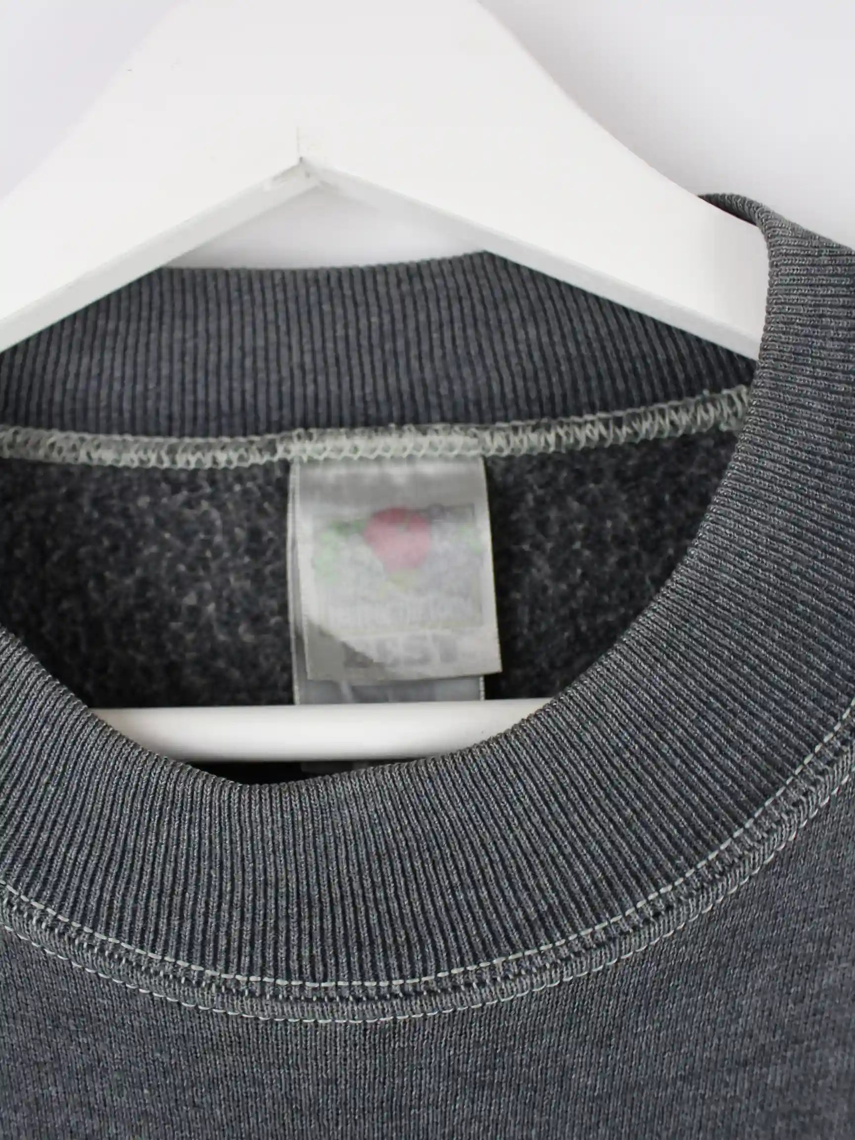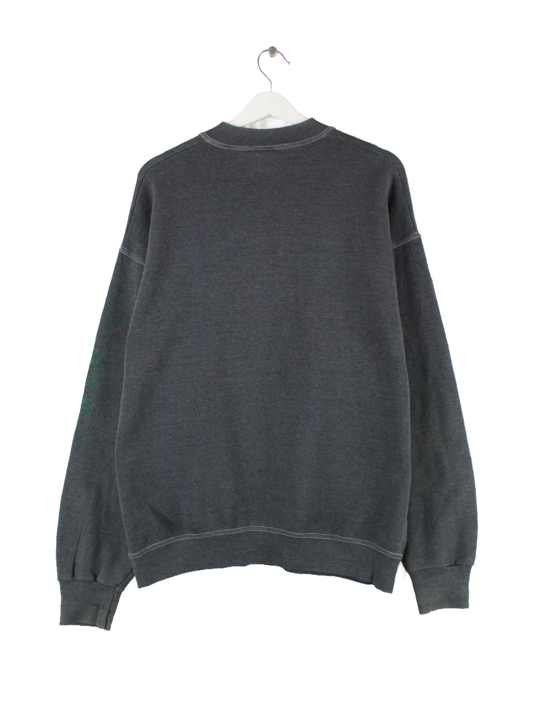 Grauer Sweater aus dem Hause Fruit of the Loom aus den 90'ern in Größe L. Er ist aus einer Baumwollmischung gemacht und in gutem Zustand bei uns zu bekommen. Mit schickem Run Print.