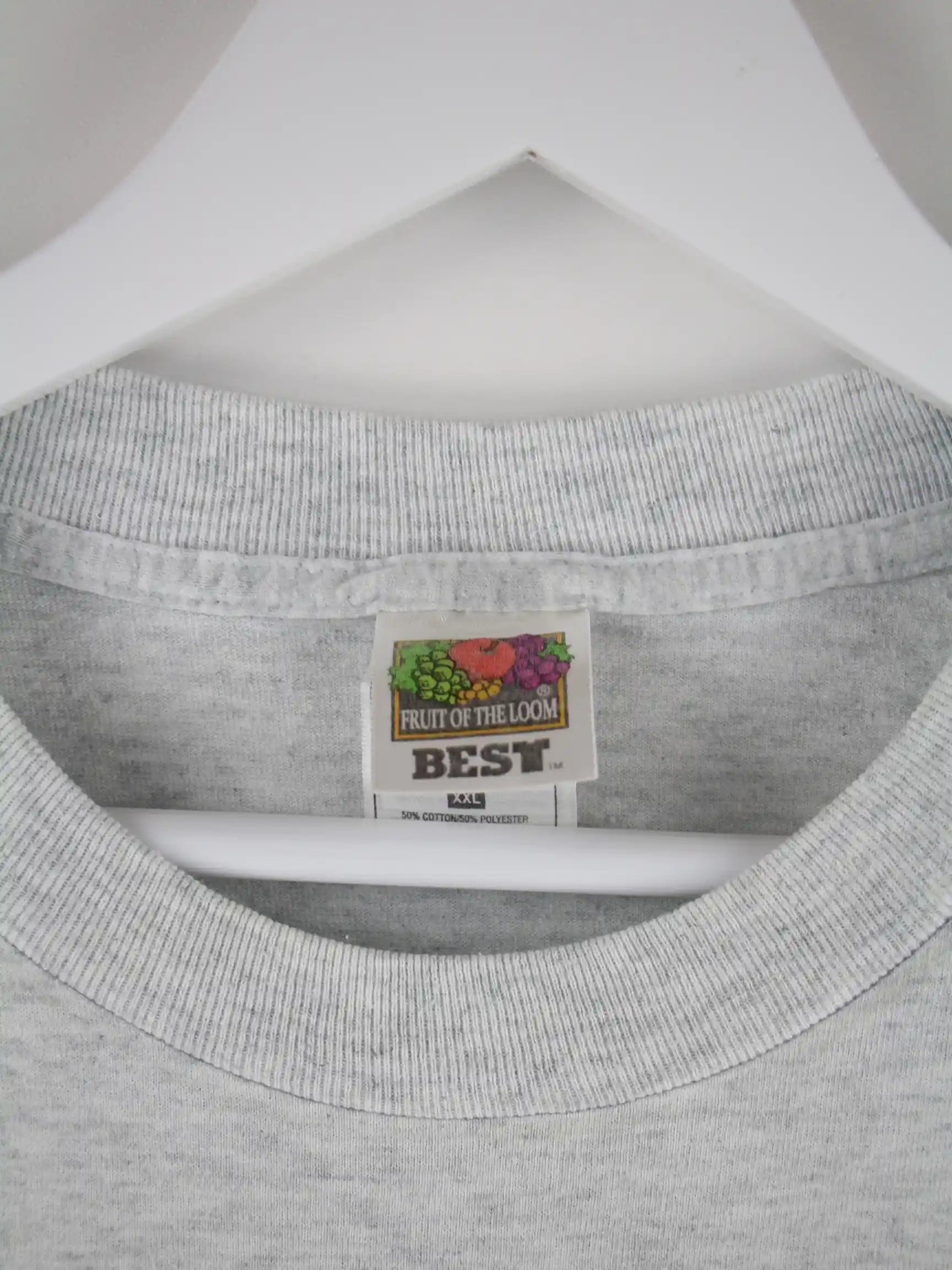 T-Shirt von Fruit of the Loom in Größe XXL aus den 90'ern. Es ist aus Baumwolle gemacht und in Grau im Bestand. Mit chiquem Wolf Print.