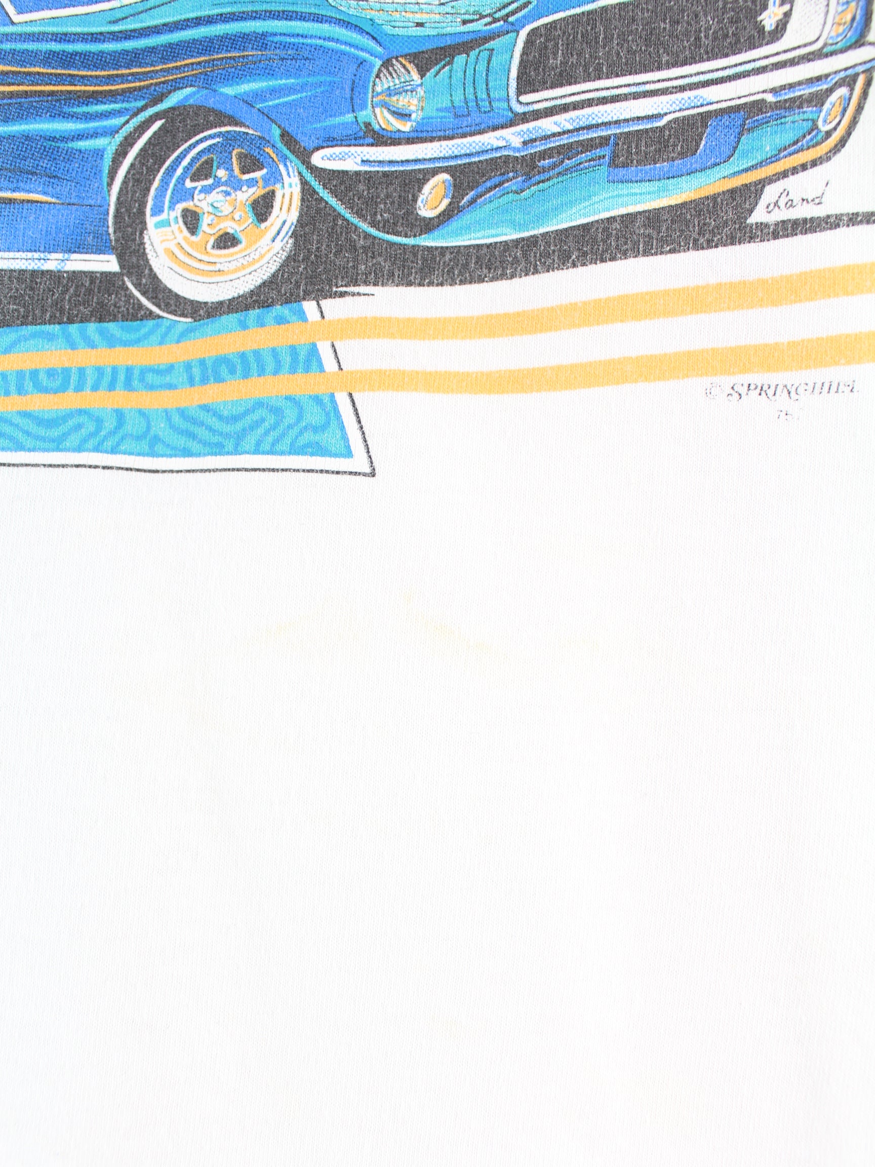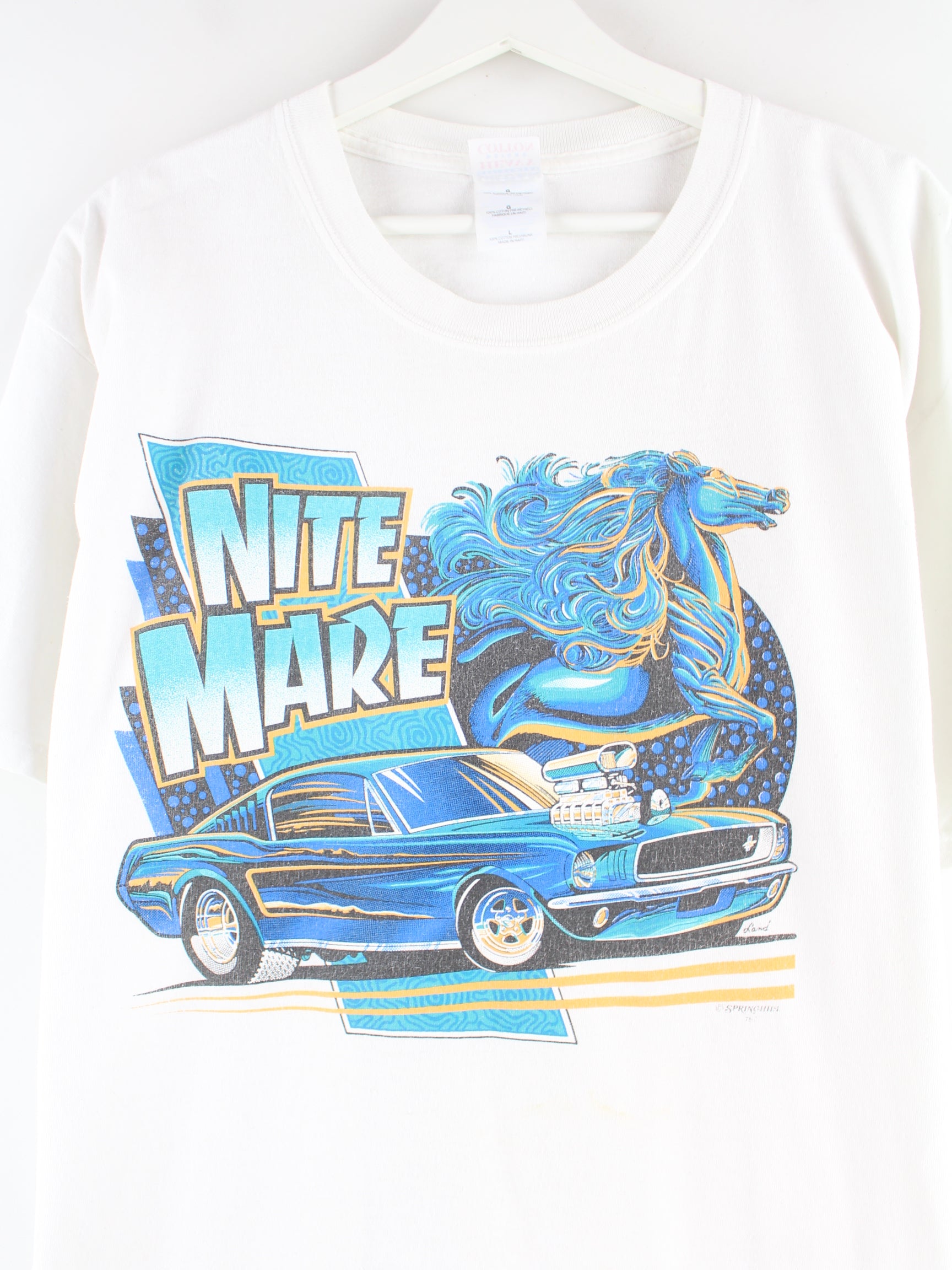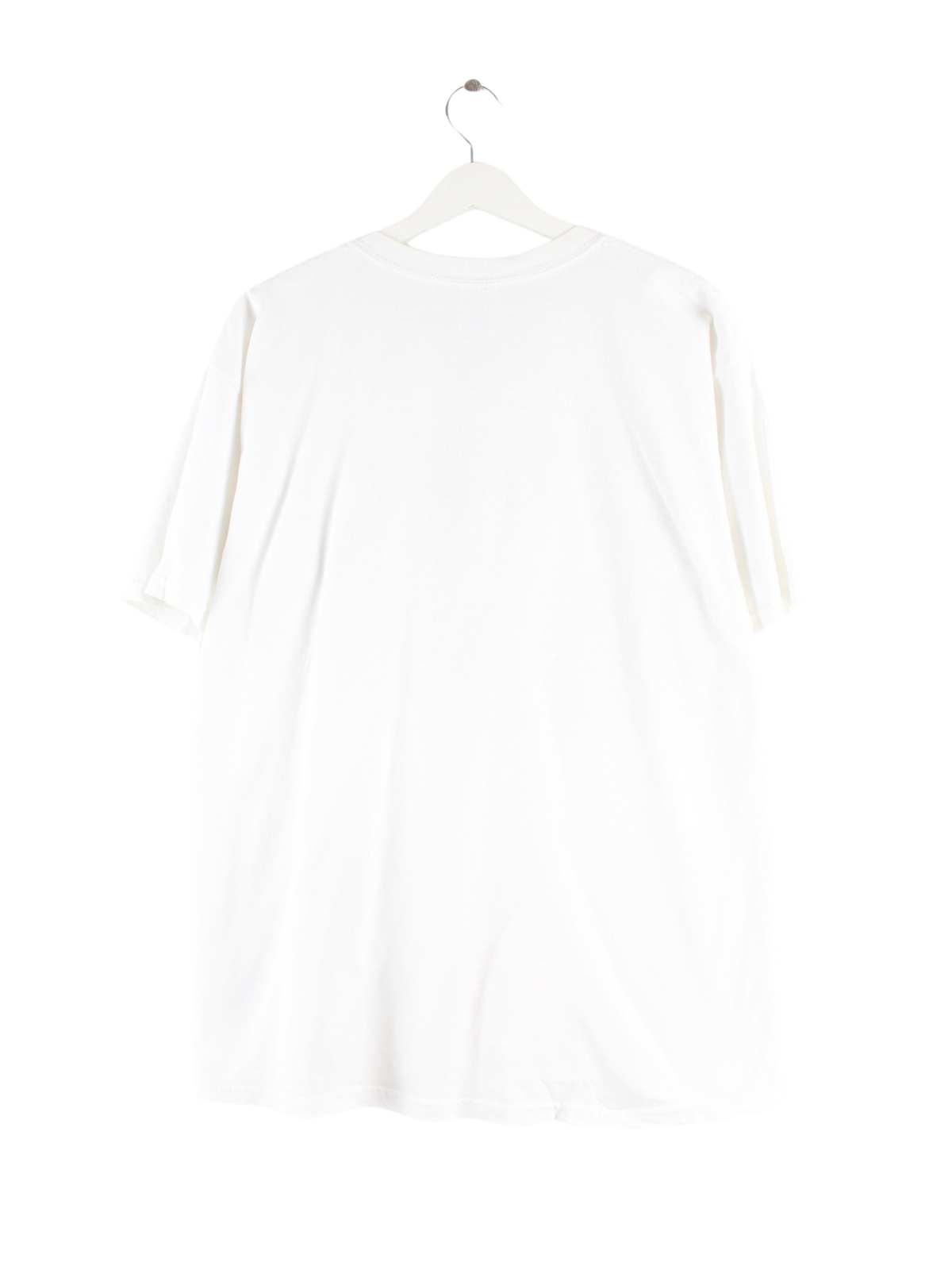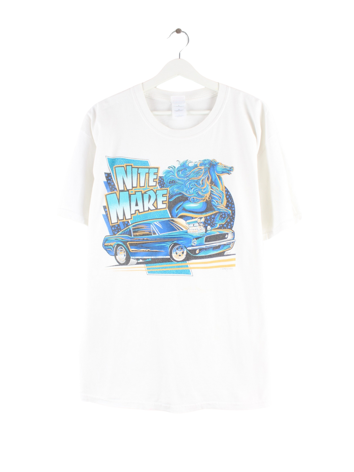 Weißes T-Shirt von Gildan aus Anfang der 2000'er in Größe L. Es ist aus Baumwolle angefertigt und in gutem Zustand im Bestand. Mit schönem Mare Print.
