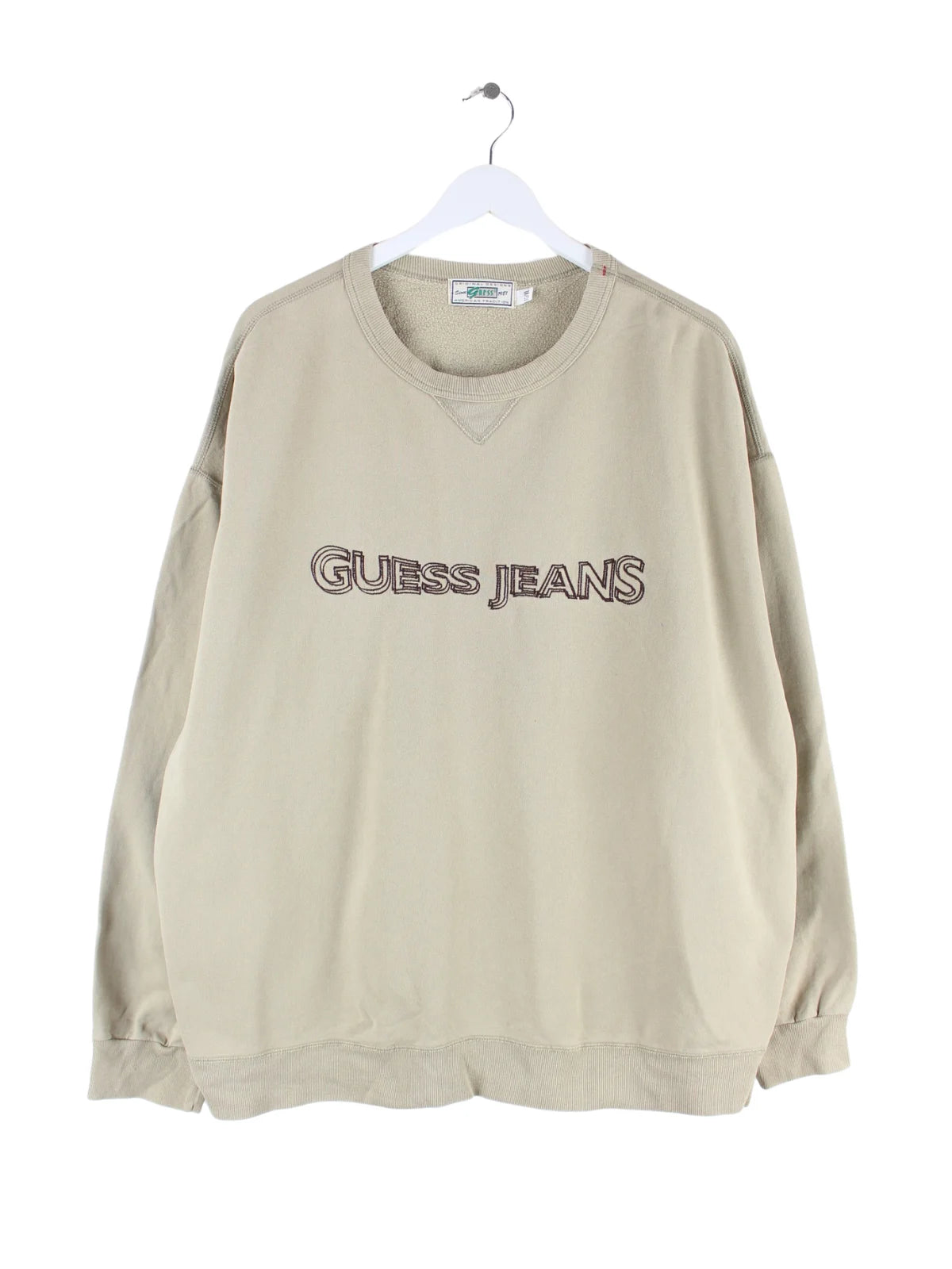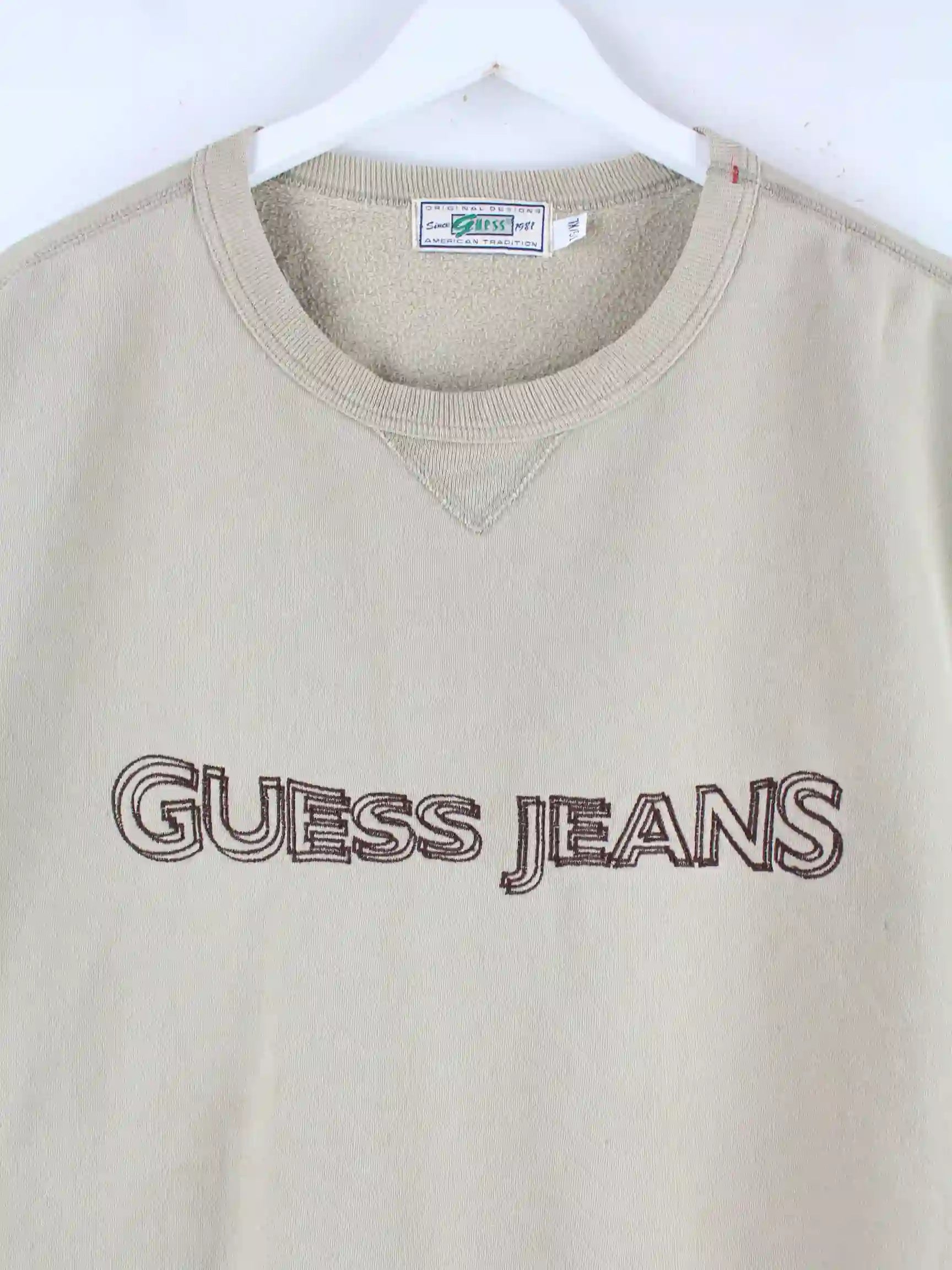 Beigefarbener Sweater mit gesticktem Logo vom Label Guess aus den 90'ern in Größe XL. Er ist aus einer Baumwollmischung hergestellt und in gutem Zustand zu bekommen.