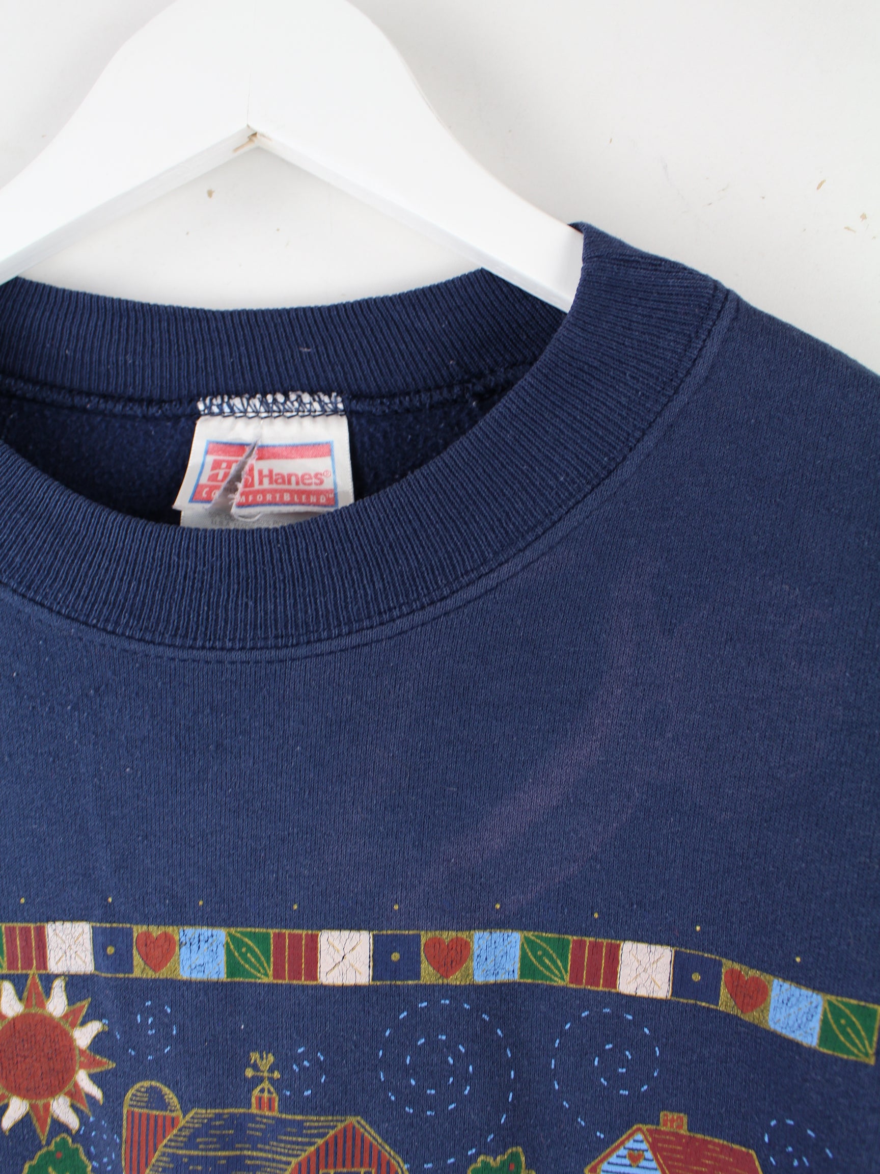 Blauer Sweater von Hanes aus den 90'ern in Größe XL. Er ist aus einer Baumwollmischung und in gutem Zustand zu haben. Mit seltenem Christmas Print.
