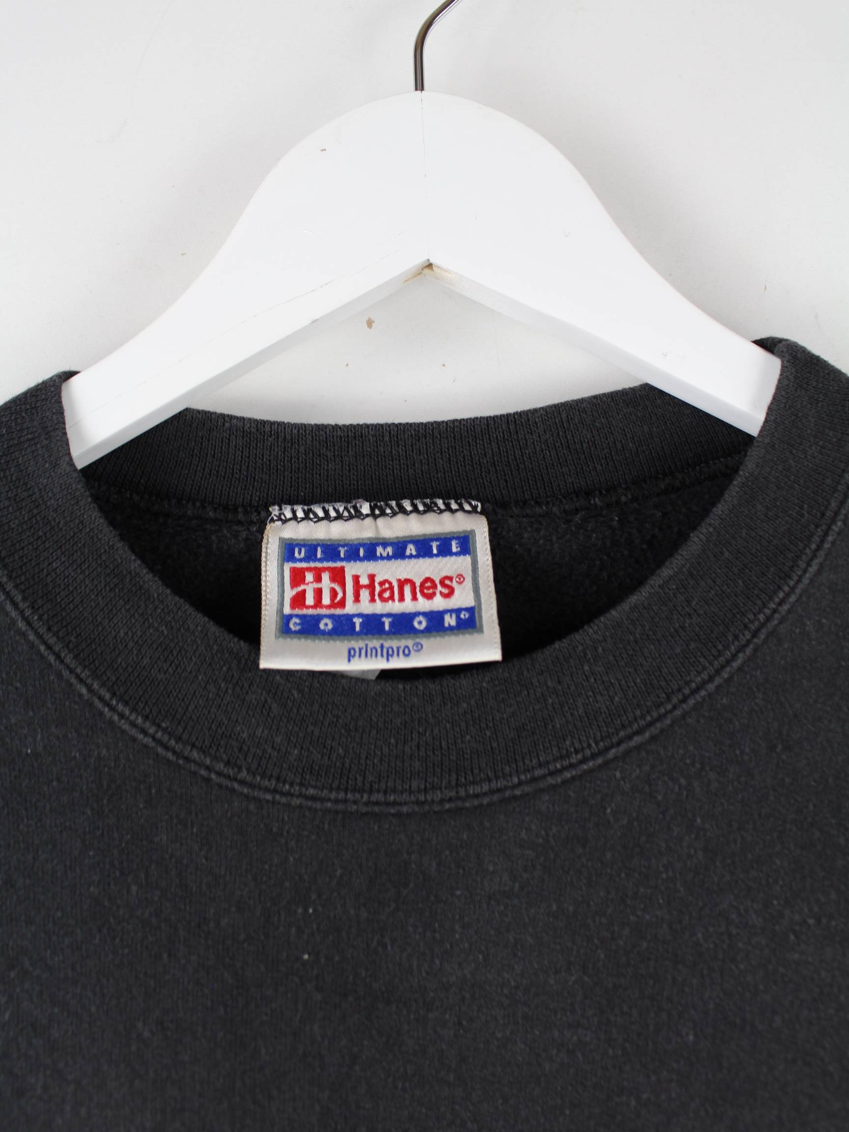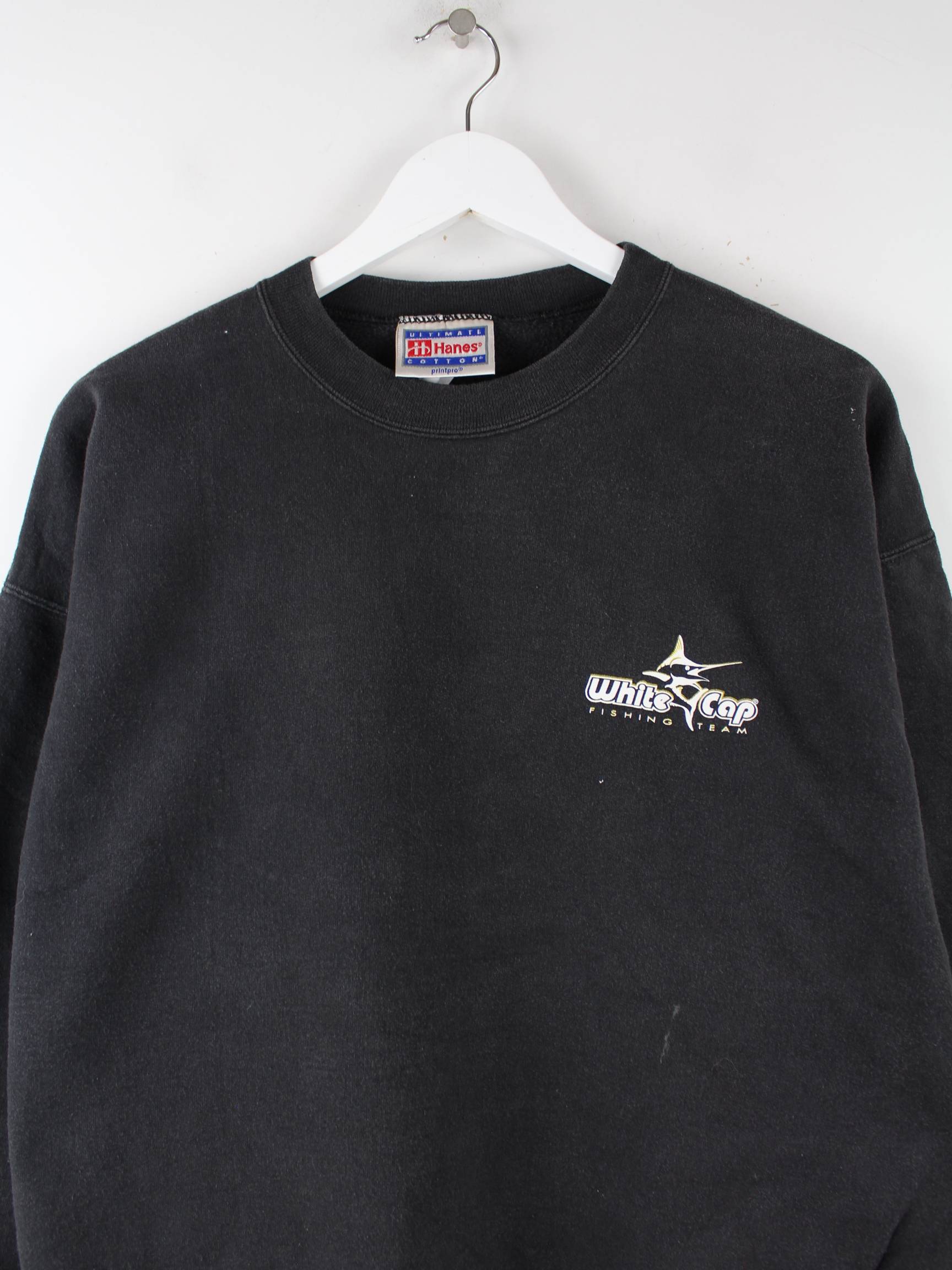 Schwarzer Sweater der Marke Hanes aus den 90'ern in Größe L. Er ist aus einer Baumwollmischung und in gutem Zustand bei uns zu bekommen. Mit schönem Fishing Print.