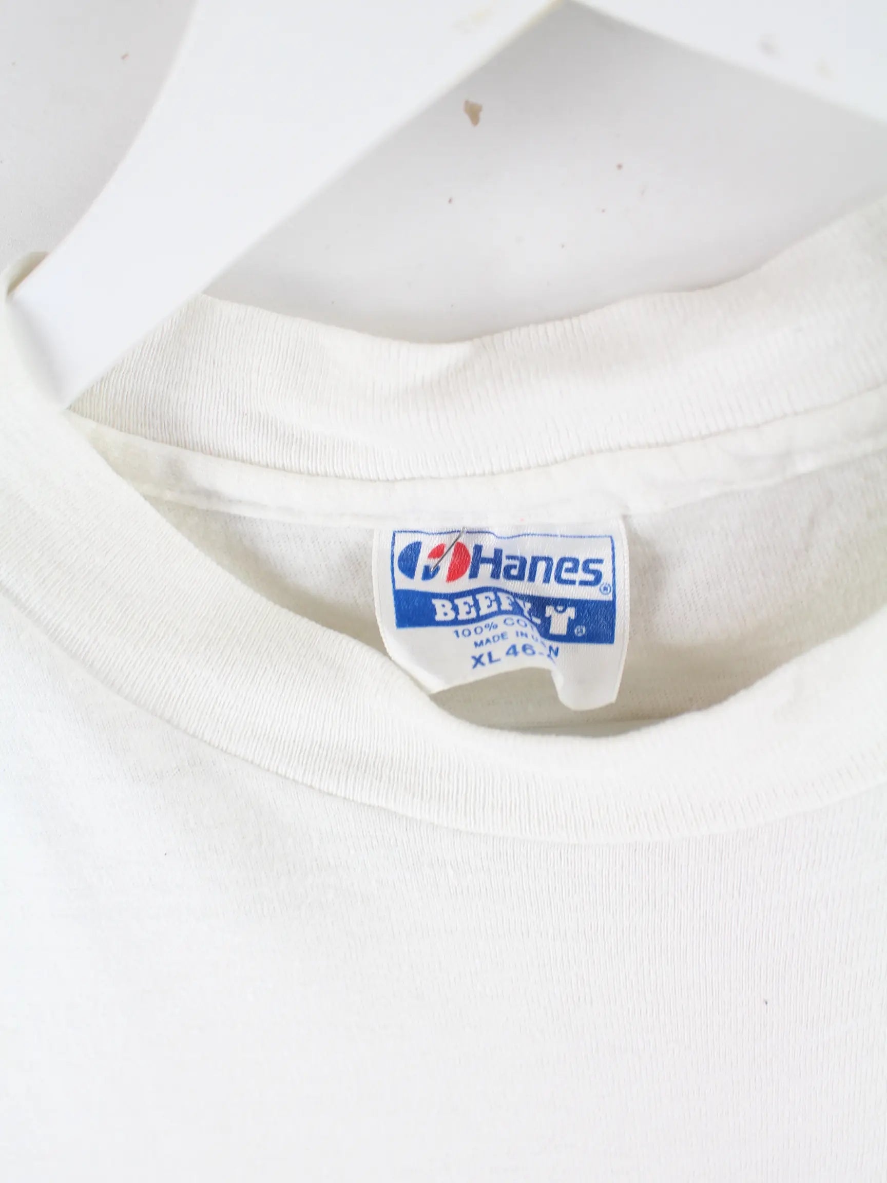 T-Shirt des Labels Hanes in Größe XL aus den 90'ern. Es ist aus Baumwolle hergestellt und in Weiß bei uns zu bekommen.