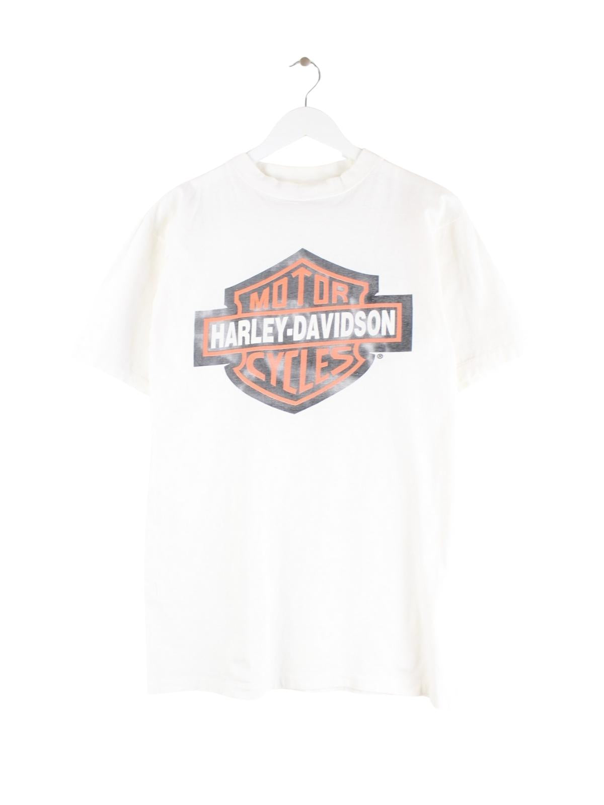 Vintage Single Stitch T-Shirt von Hause Harley-Davidson in Größe L aus den 90'ern. Es ist aus Baumwolle produziert und in Weiß lieferbar. Mit schickem Vintage Print.