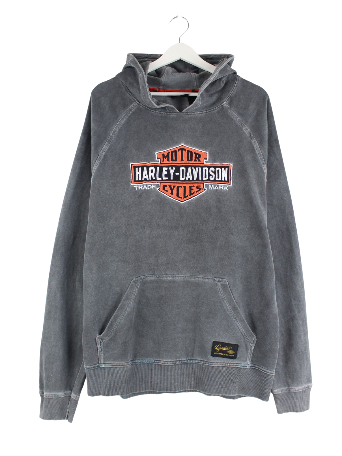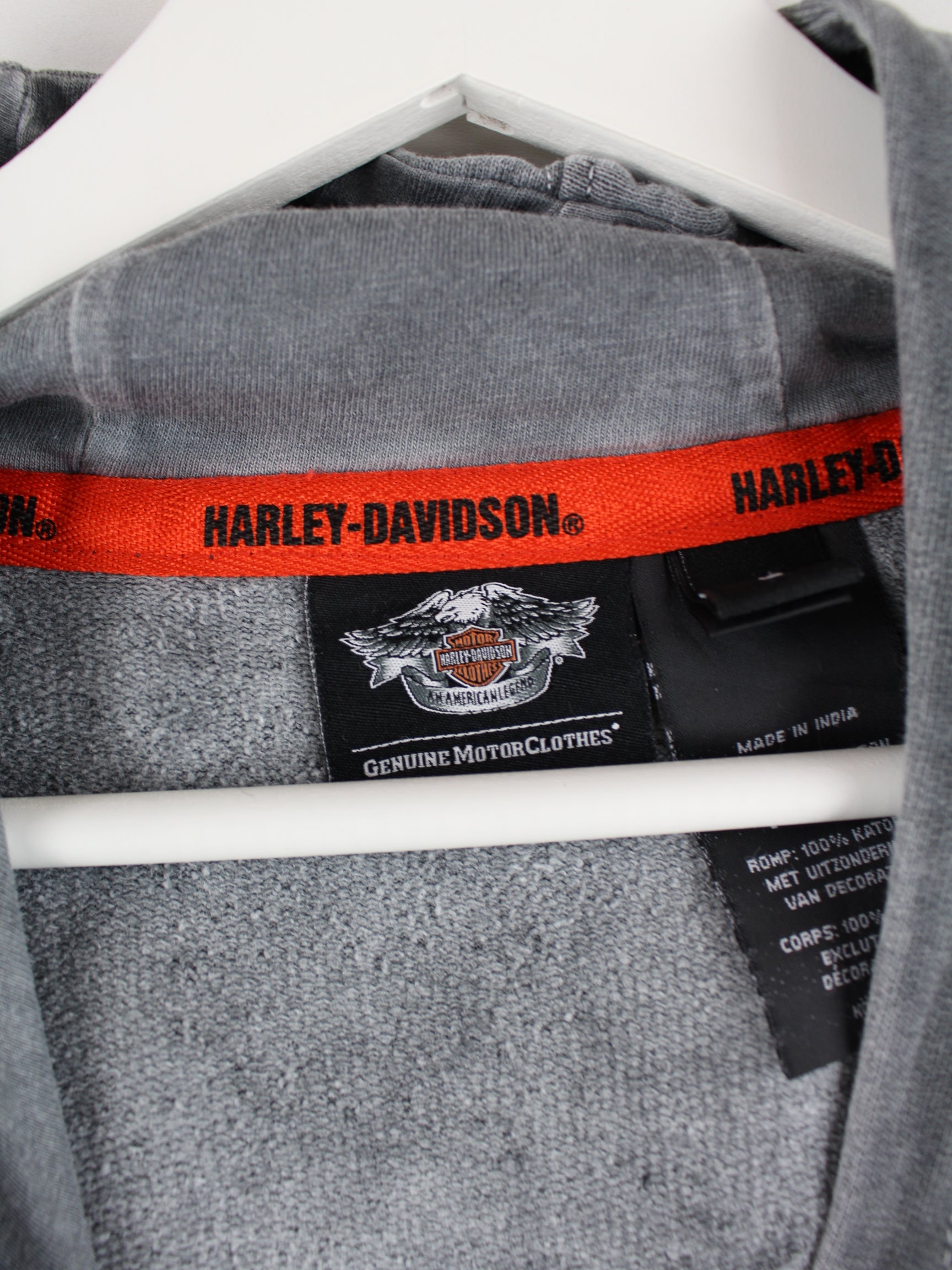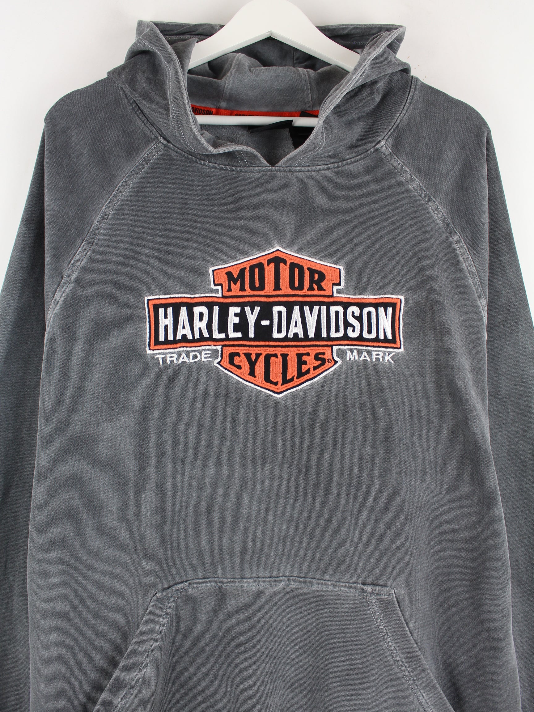 Hoodie von Harley Davidson mit gestickten Motiven in Größe XL. Er ist aus einer Baumwollmischung gefertigt und in Grau zu haben.