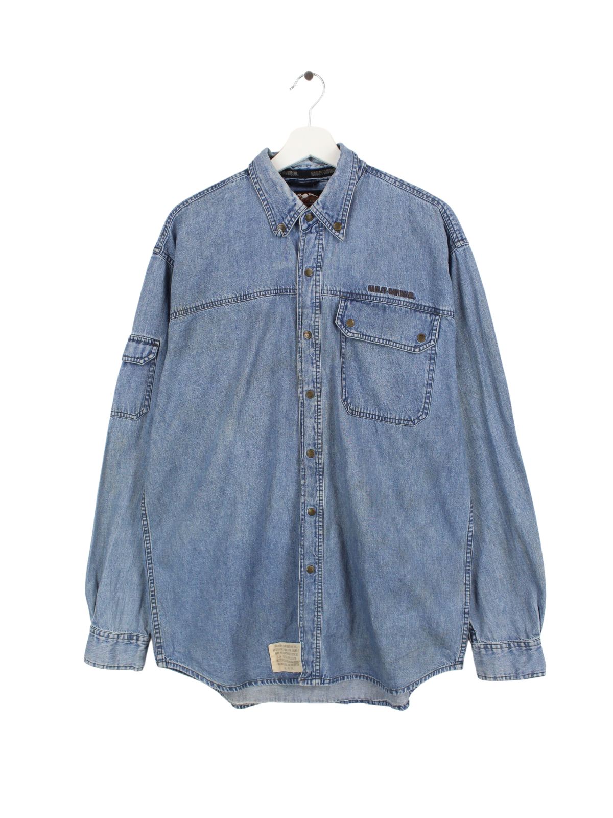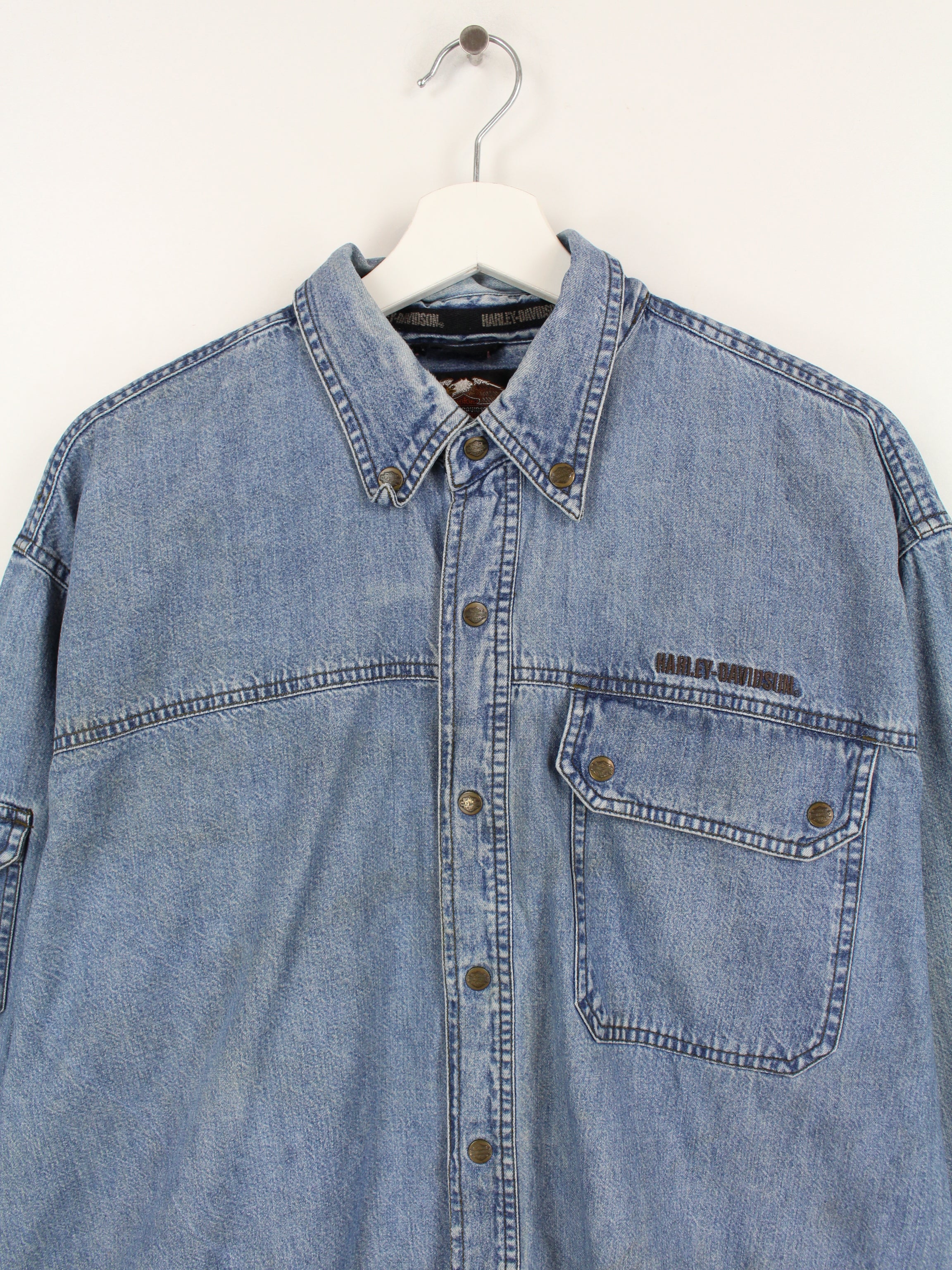 Blaues Jeanshemd der Bikermarke Harley Davidson.