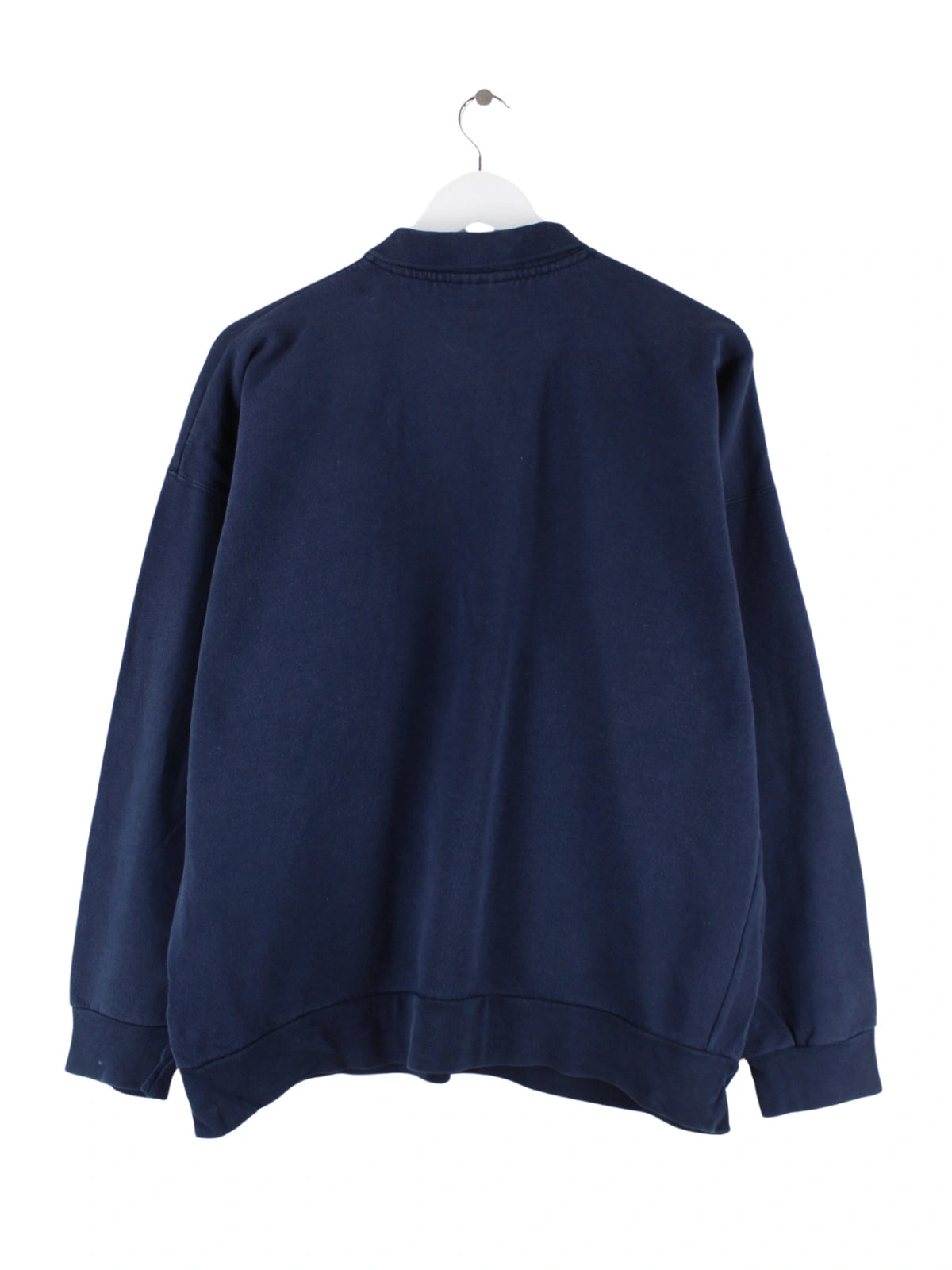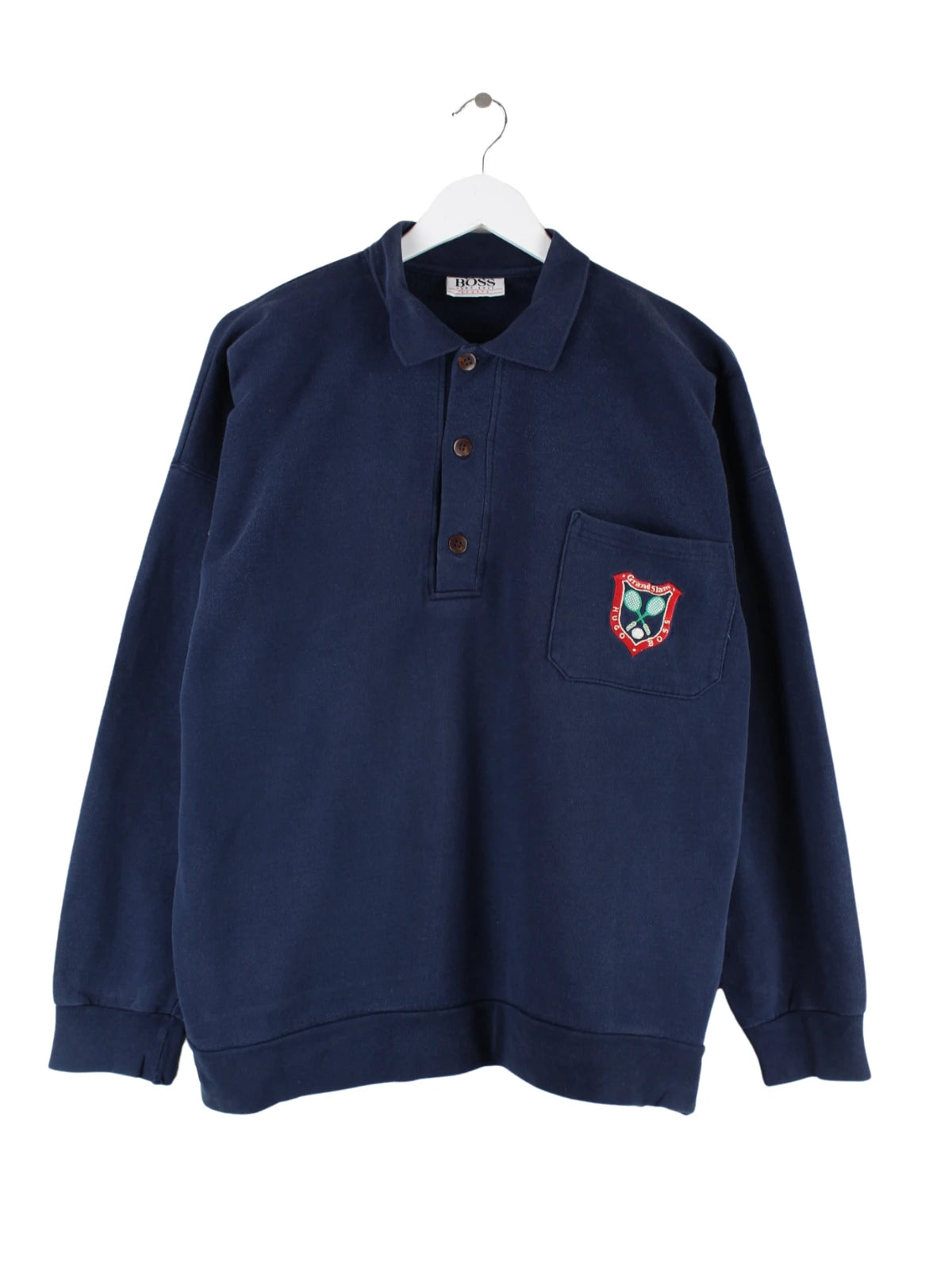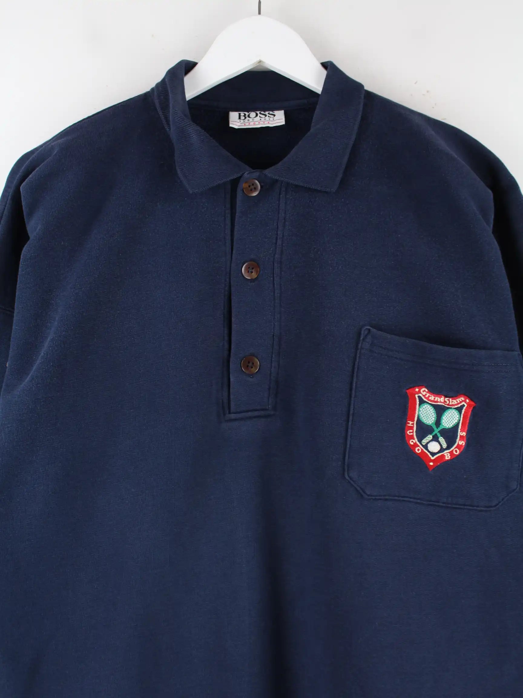 Blauer Sweater der Marke Hugo Boss aus den 80'ern in Größe M. Er ist aus einer Baumwollmischung gemacht und in sehr gutem Zustand im Bestand.
