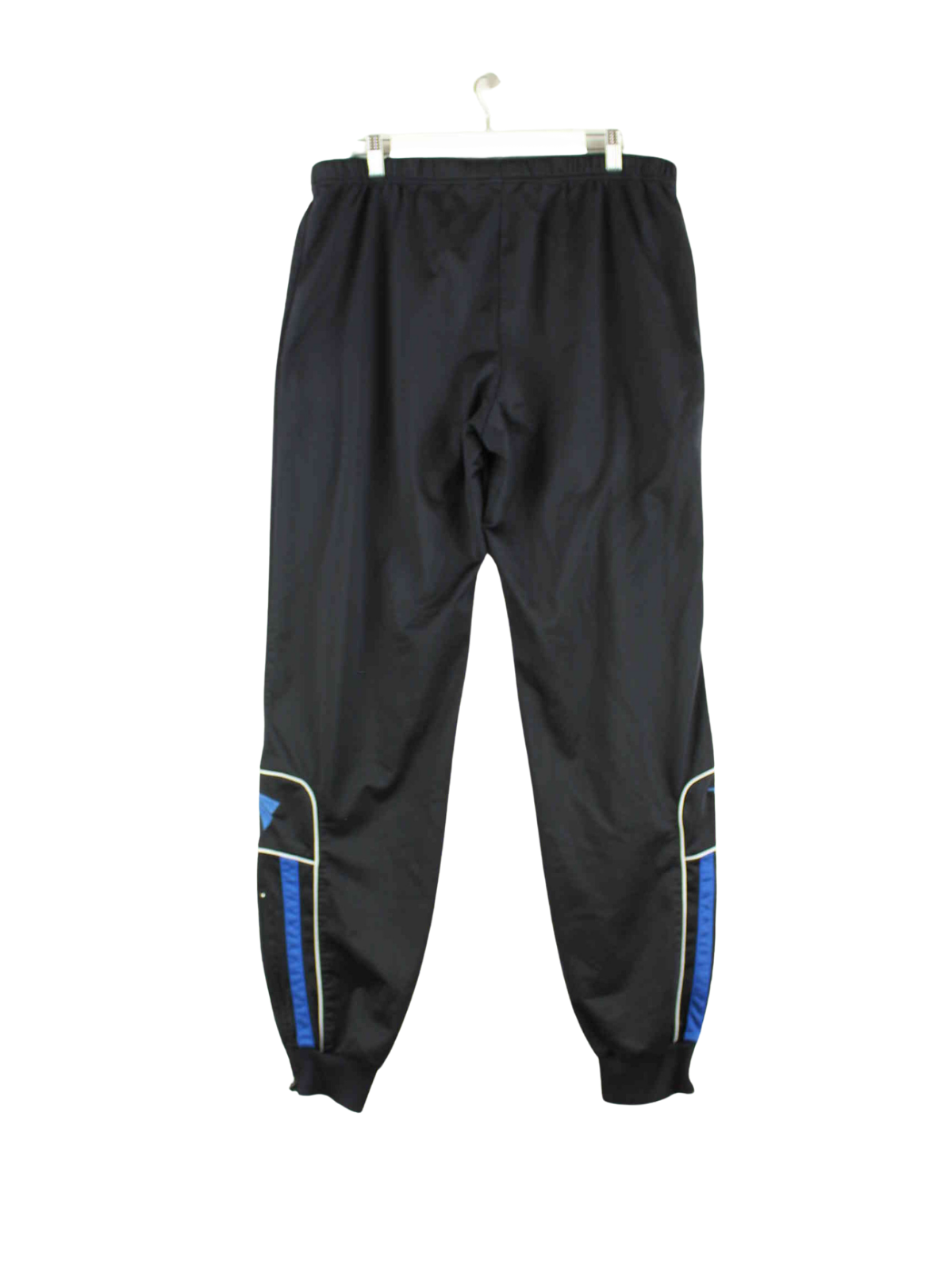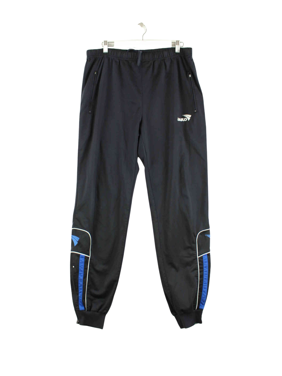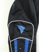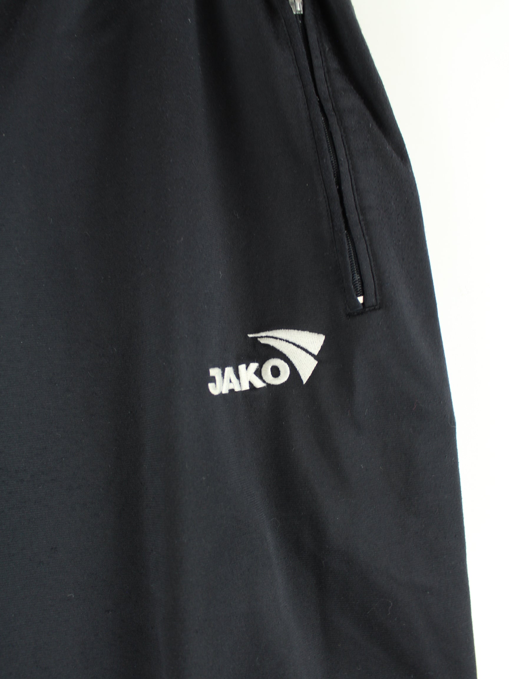 Schwarze Track Pants mit gesticktem Logo aus dem Hause Jako aus Anfang der 2000'er in Größe L. Sie sind aus Synthetik produziert und in sehr gutem Zustand zu haben.