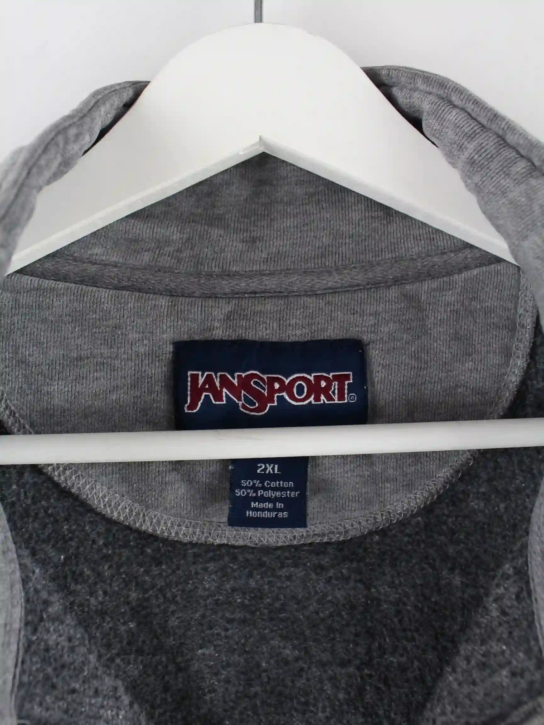 Grauer Sweater mit Stickereien und halbem Reißverschluß der Marke Jansport aus den 90'ern in Größe XXL. Er ist aus einer Baumwollmischung und in sehr gutem Zustand zu haben.