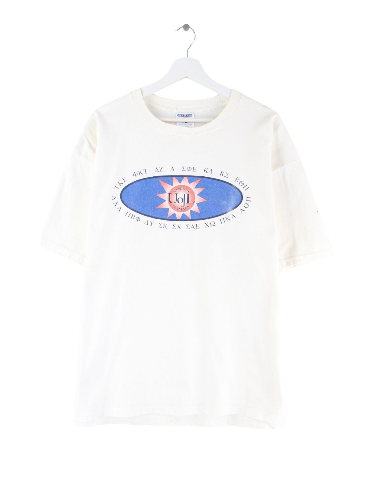 T-Shirt aus dem Hause Jerzees in Größe XL. Es ist aus Baumwolle gefertigt und in Weiß bei uns vorrätig. Mit chiquem Gamma Print.