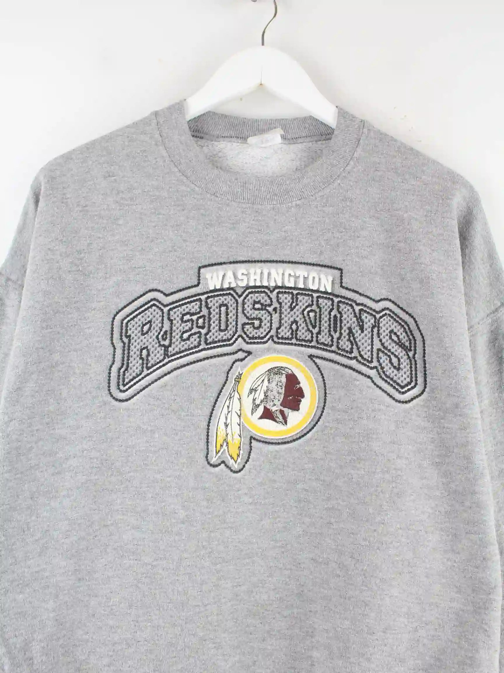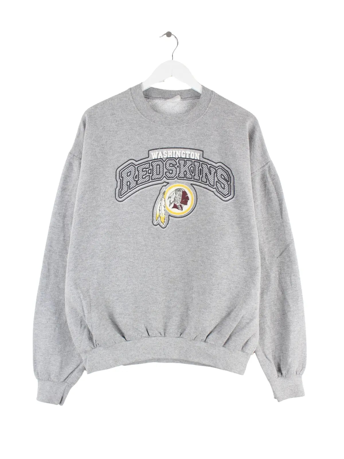 Grauer Sweater von Jerzees in Größe L. Er ist aus einer Baumwollmischung produziert und in sehr gutem Zustand in Stock. Mit chiquem Redskins Print.