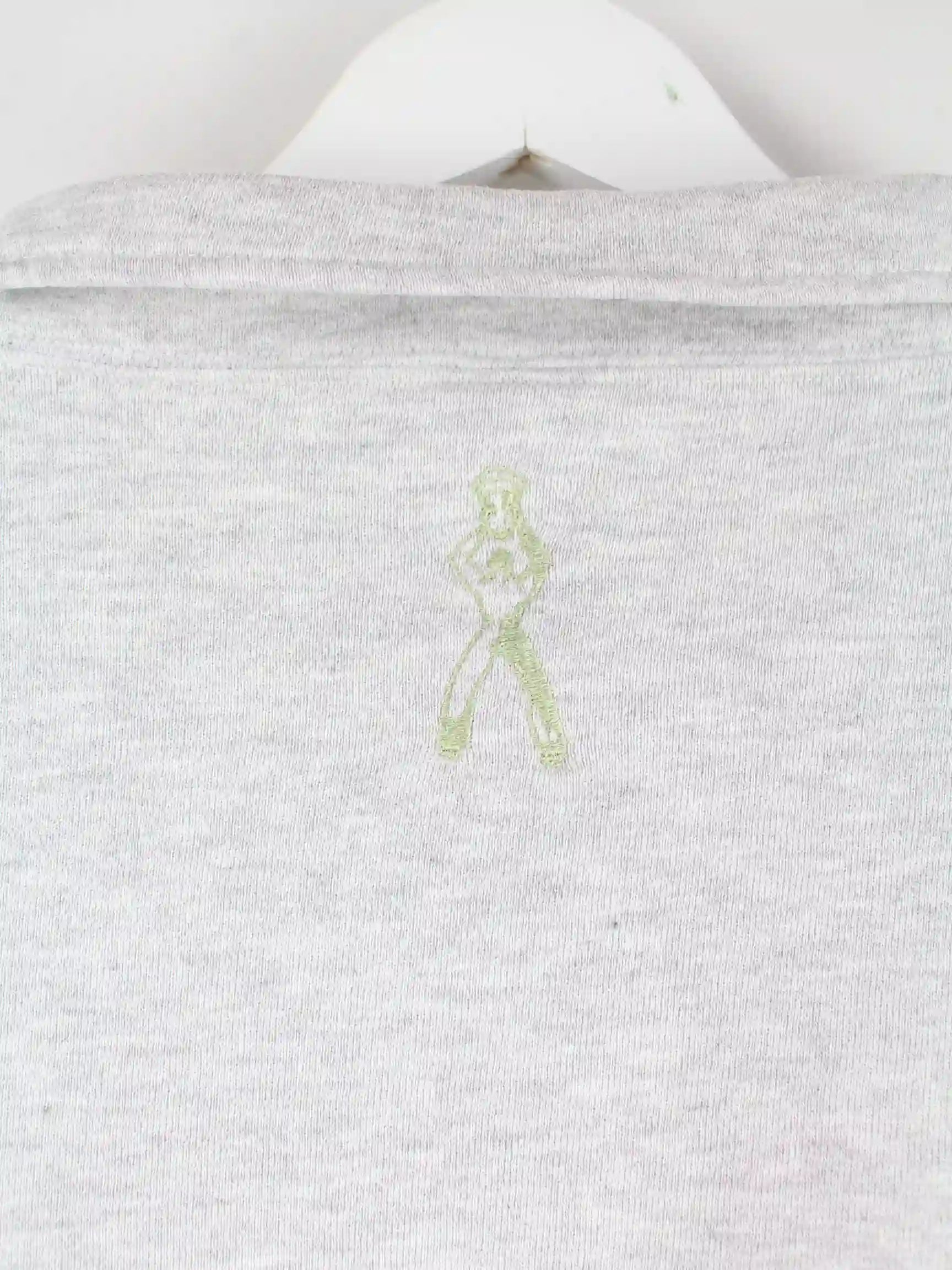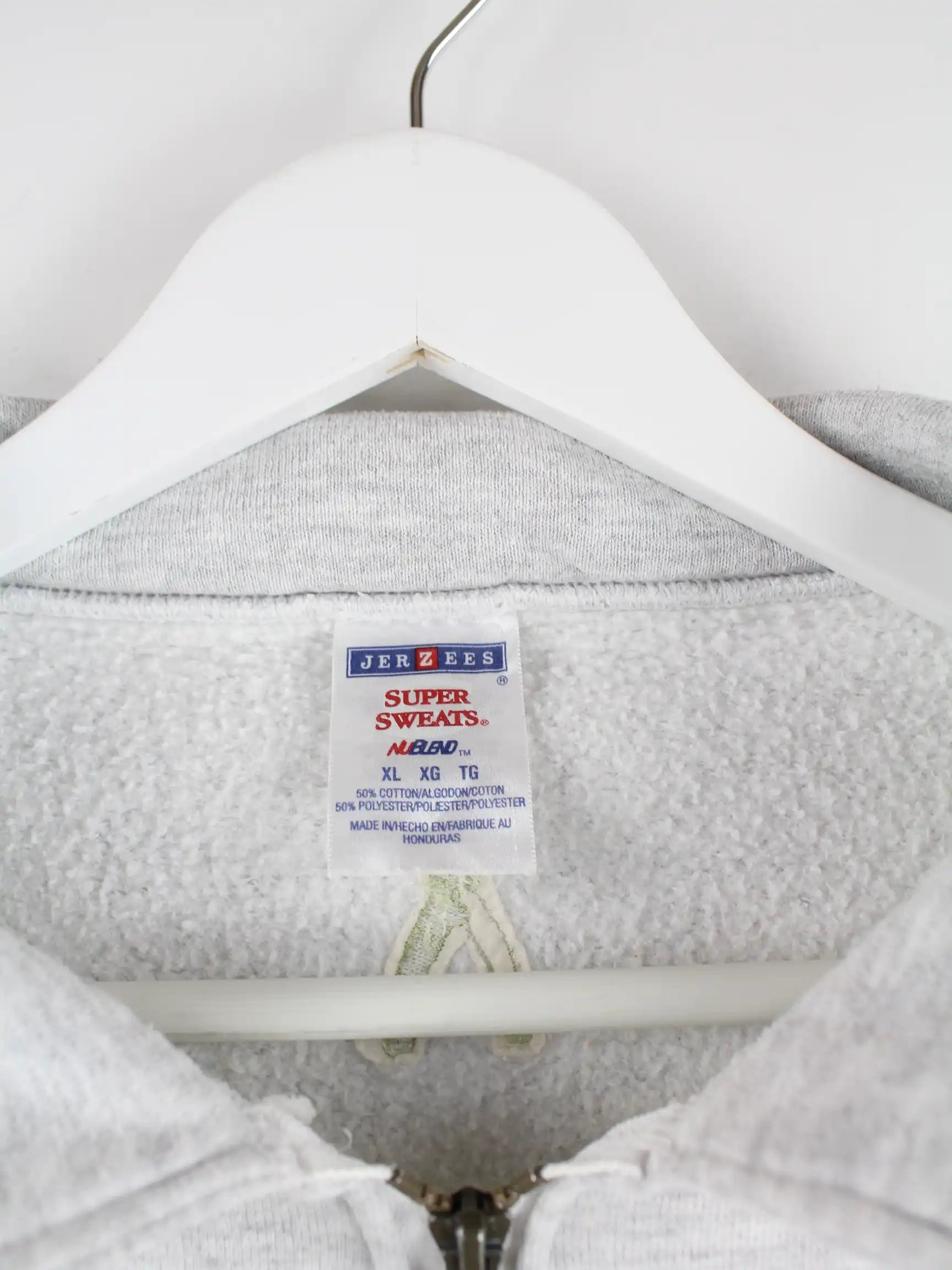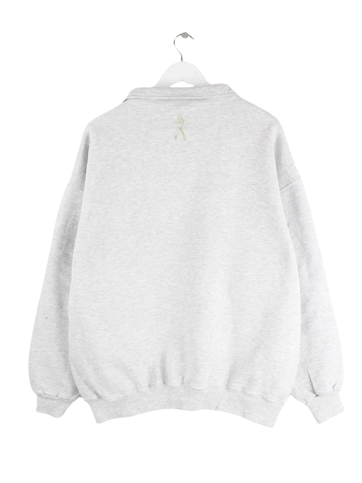 Grauer Sweater mit gestickten Motiven und halbem Reißverschluß des Labels Jerzees aus den 90'ern in Größe XL. Er ist aus einer Baumwollmischung gefertigt. Den Zustand würden wir als 'In Ordnung' bezeichnen (vergl. Bilder).