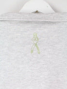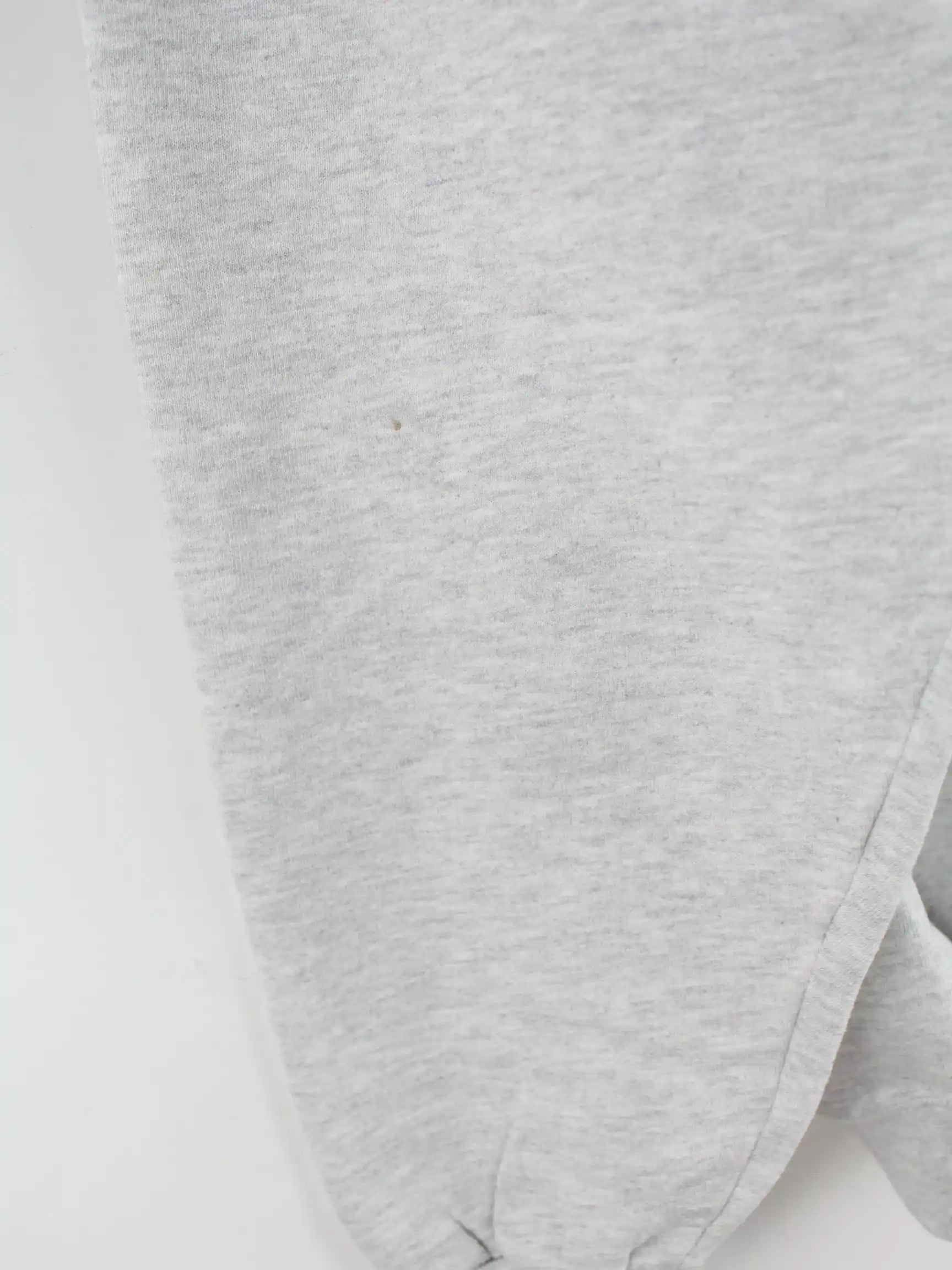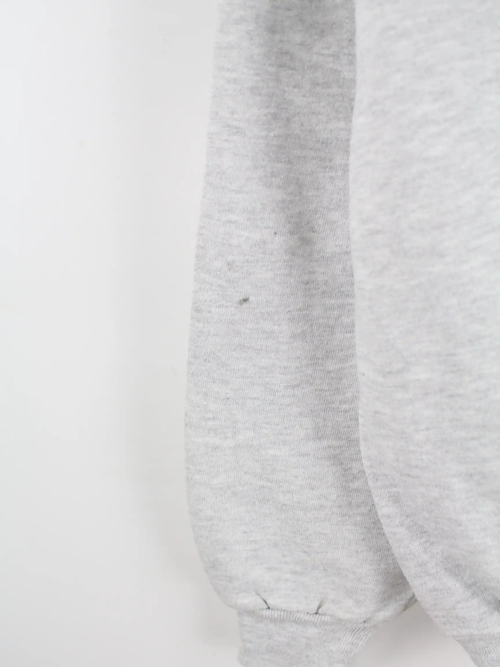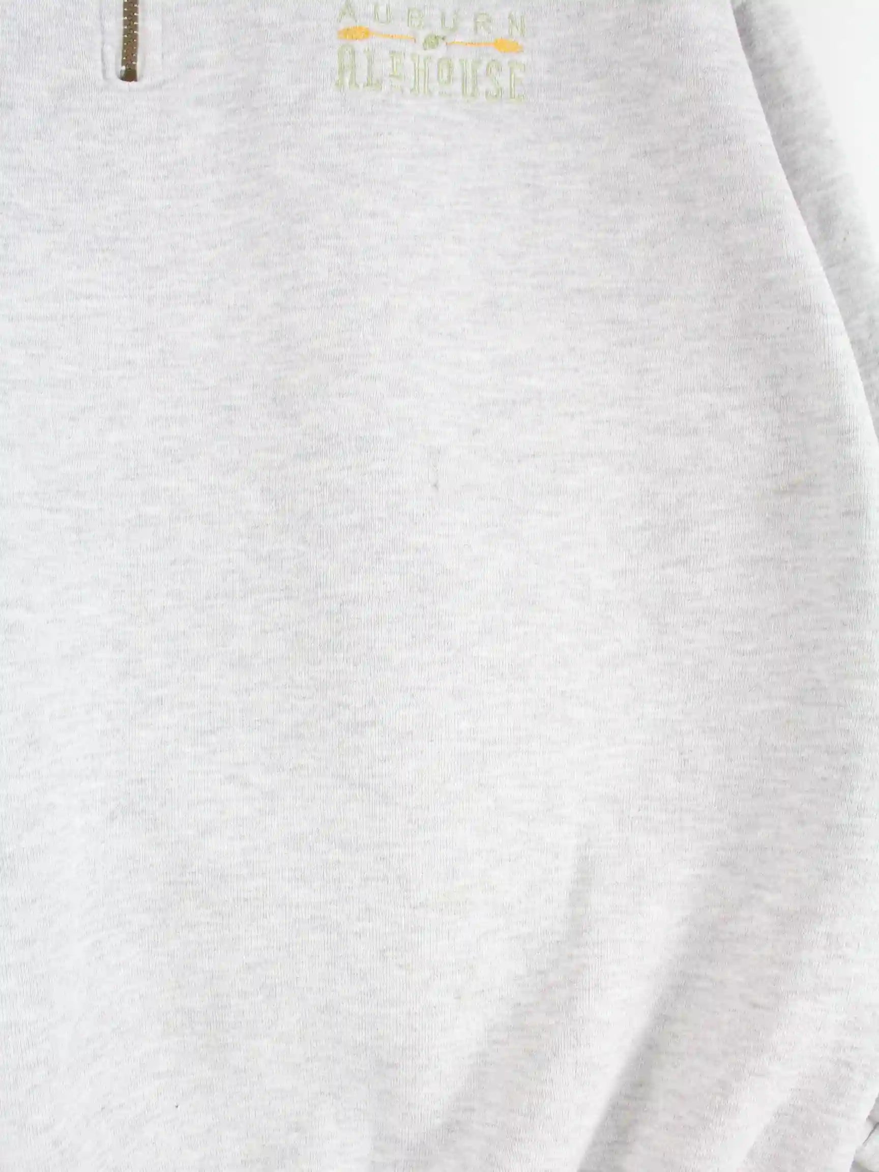 Grauer Sweater mit gestickten Motiven und halbem Reißverschluß des Labels Jerzees aus den 90'ern in Größe XL. Er ist aus einer Baumwollmischung gefertigt. Den Zustand würden wir als 'In Ordnung' bezeichnen (vergl. Bilder).