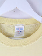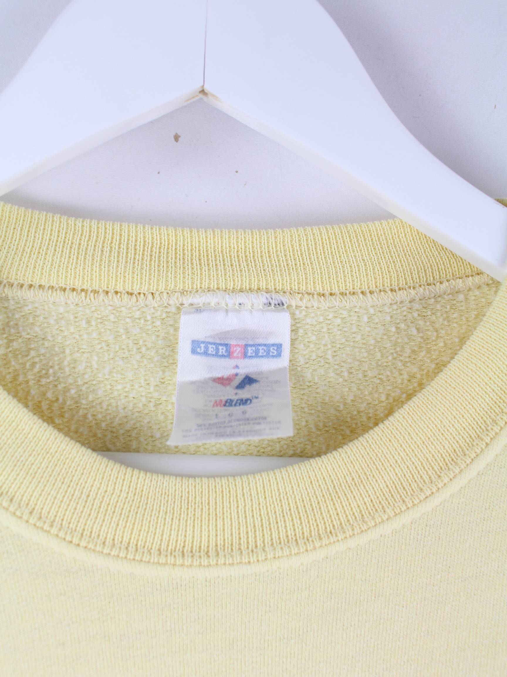 Gelber Sweater mit gesticktem Logo aus dem Hause Jerzees aus den 90'ern in Größe L. Er ist aus einer Baumwollmischung hergestellt und in gutem Zustand im Bestand.