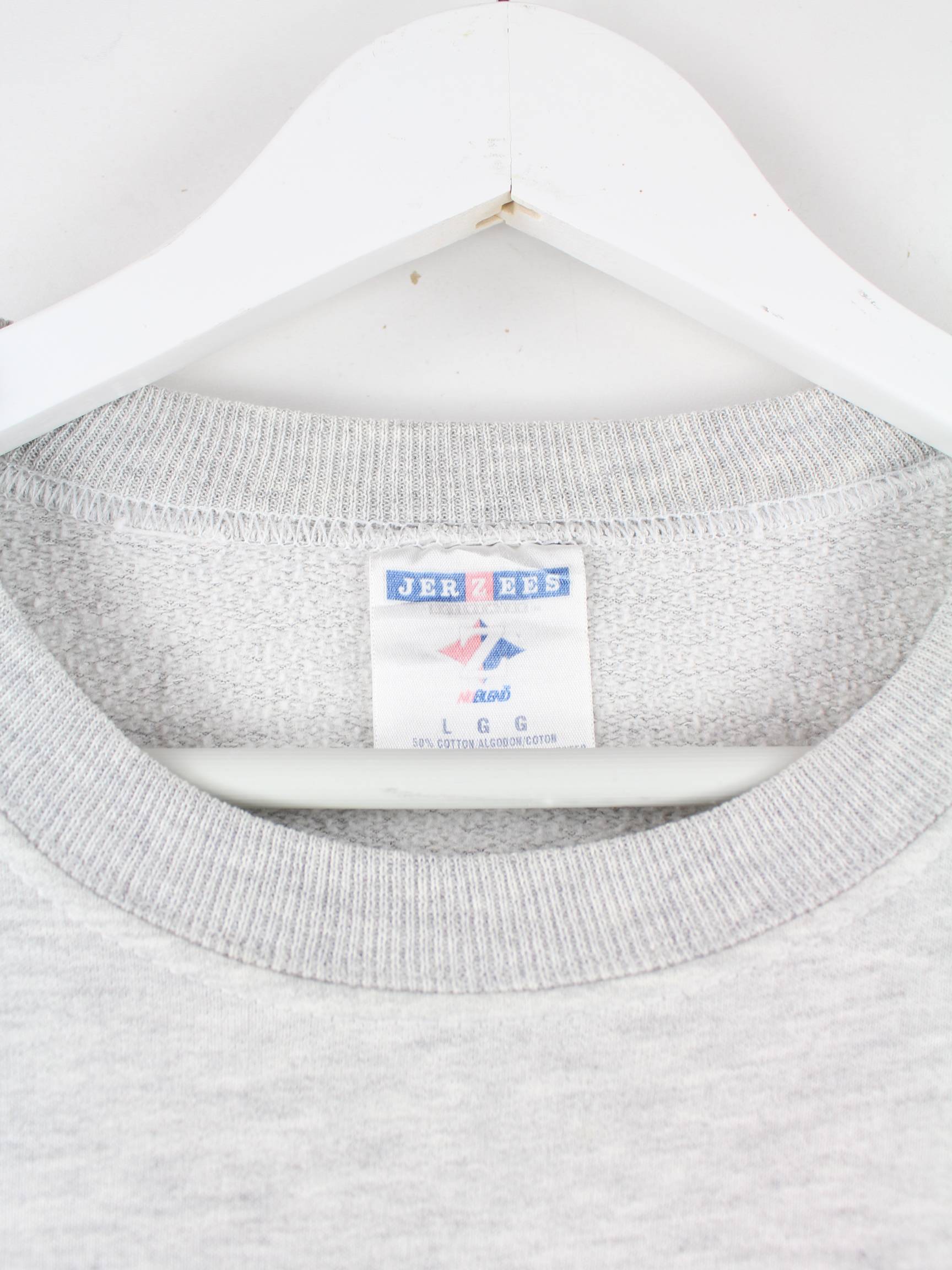 Sweater vom Brand Jerzees in Größe L aus den 90'ern. Er ist aus einer Baumwollmischung und in Grau zu haben. Mit schickem Seller Print.