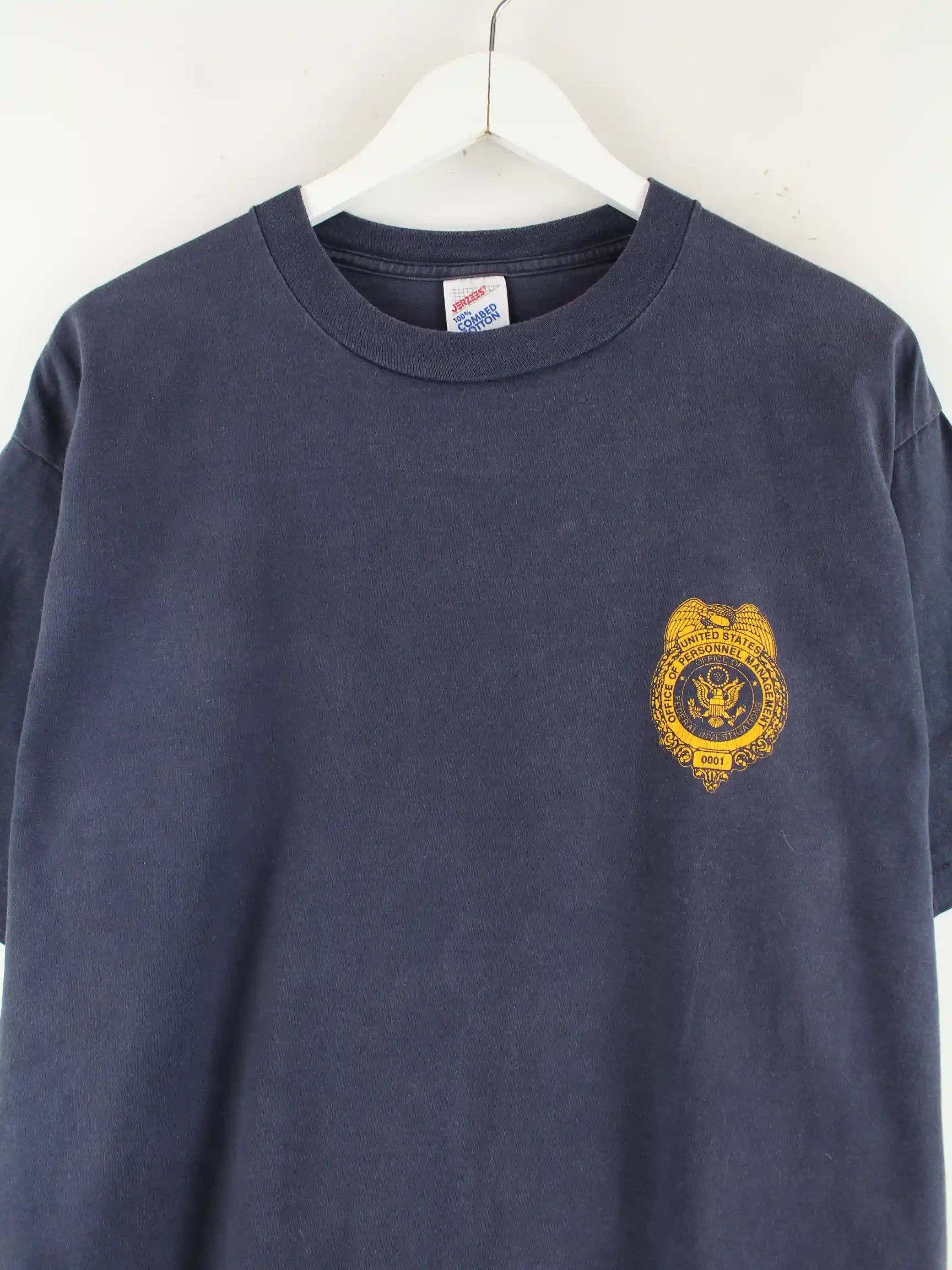 T-Shirt vom Brand Jerzees in Größe XL aus den 90'ern. Es ist aus einer Baumwollmischung produziert und in Blau auf Lager. Mit seltenem USA Print.